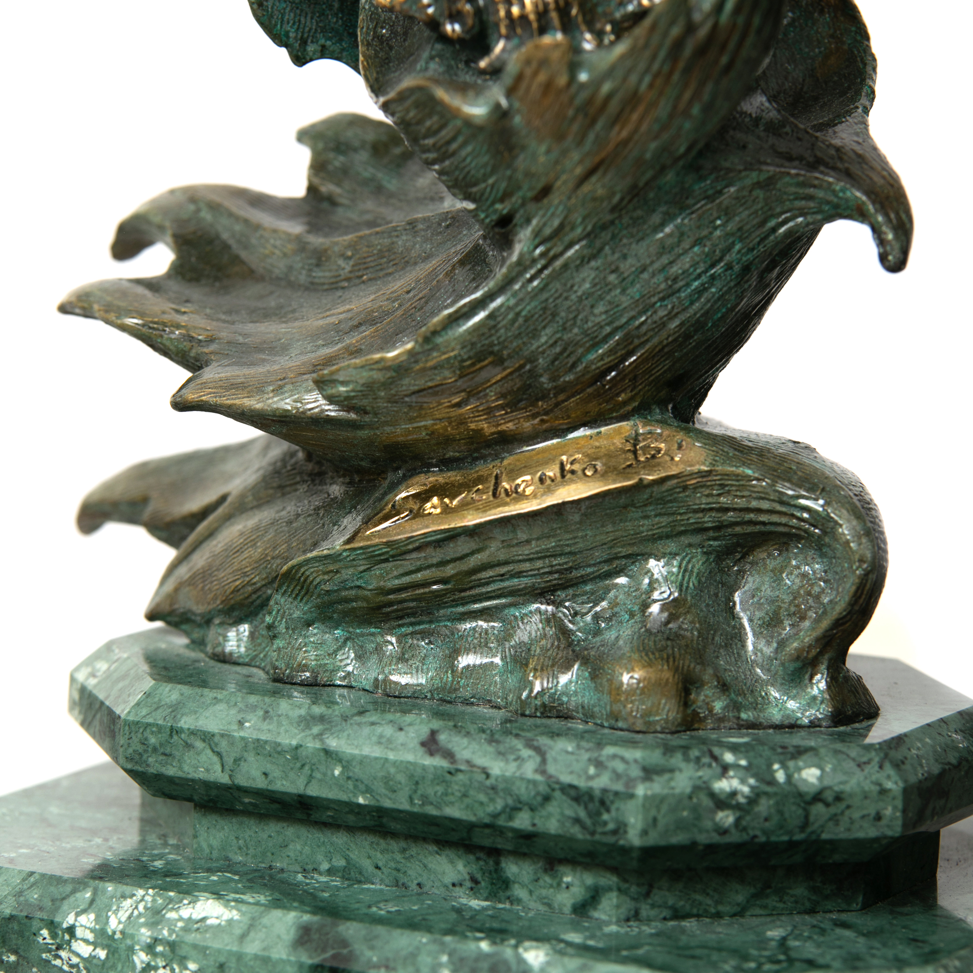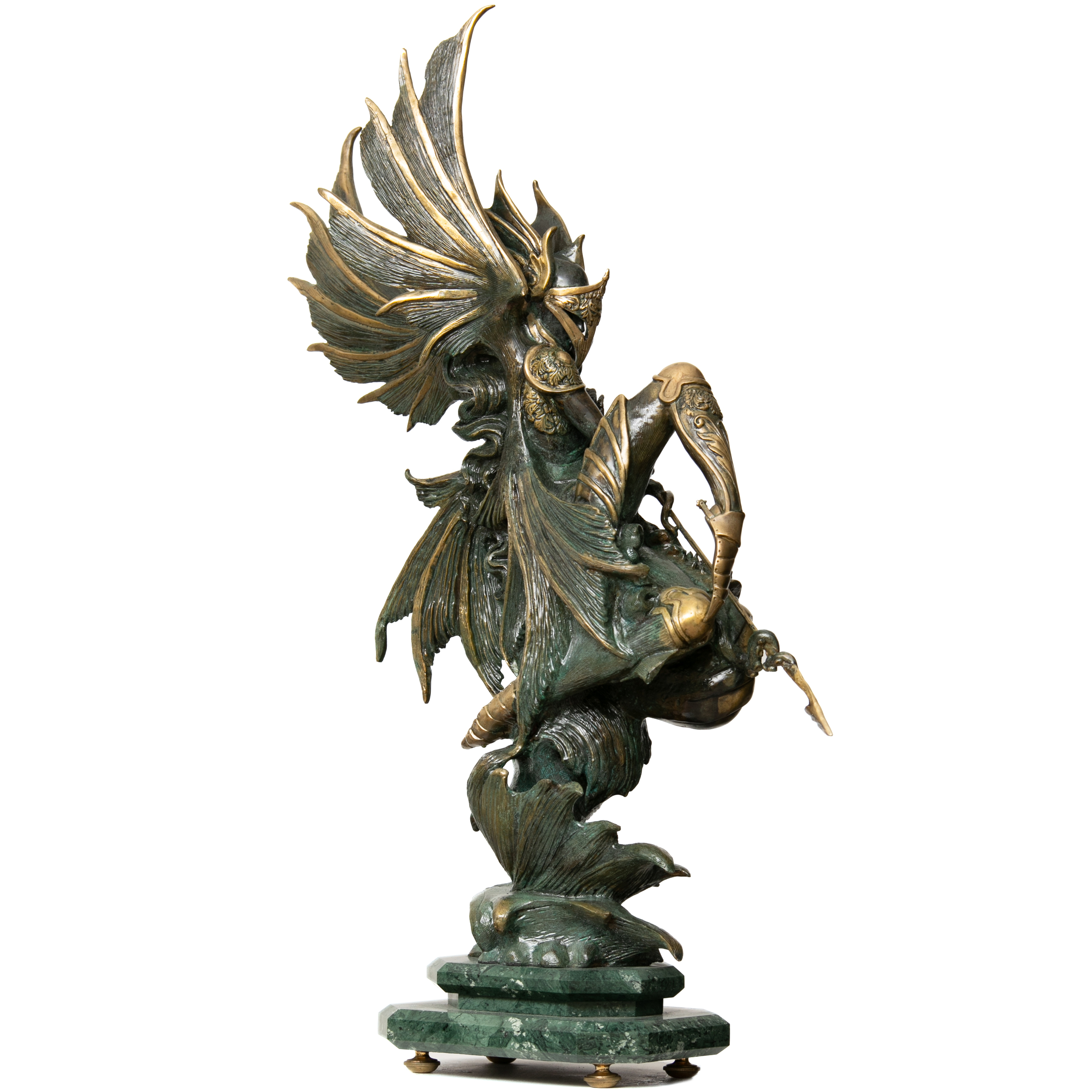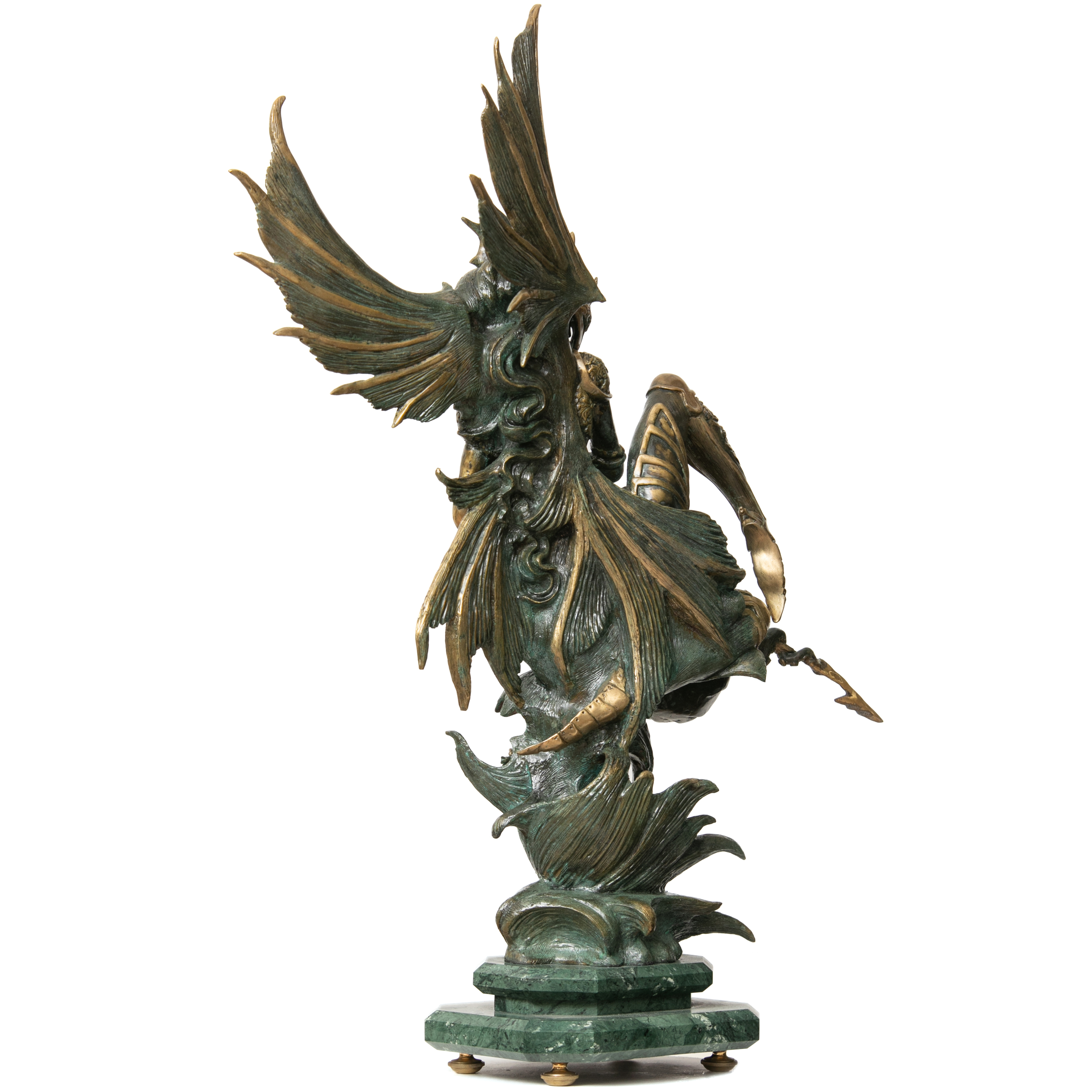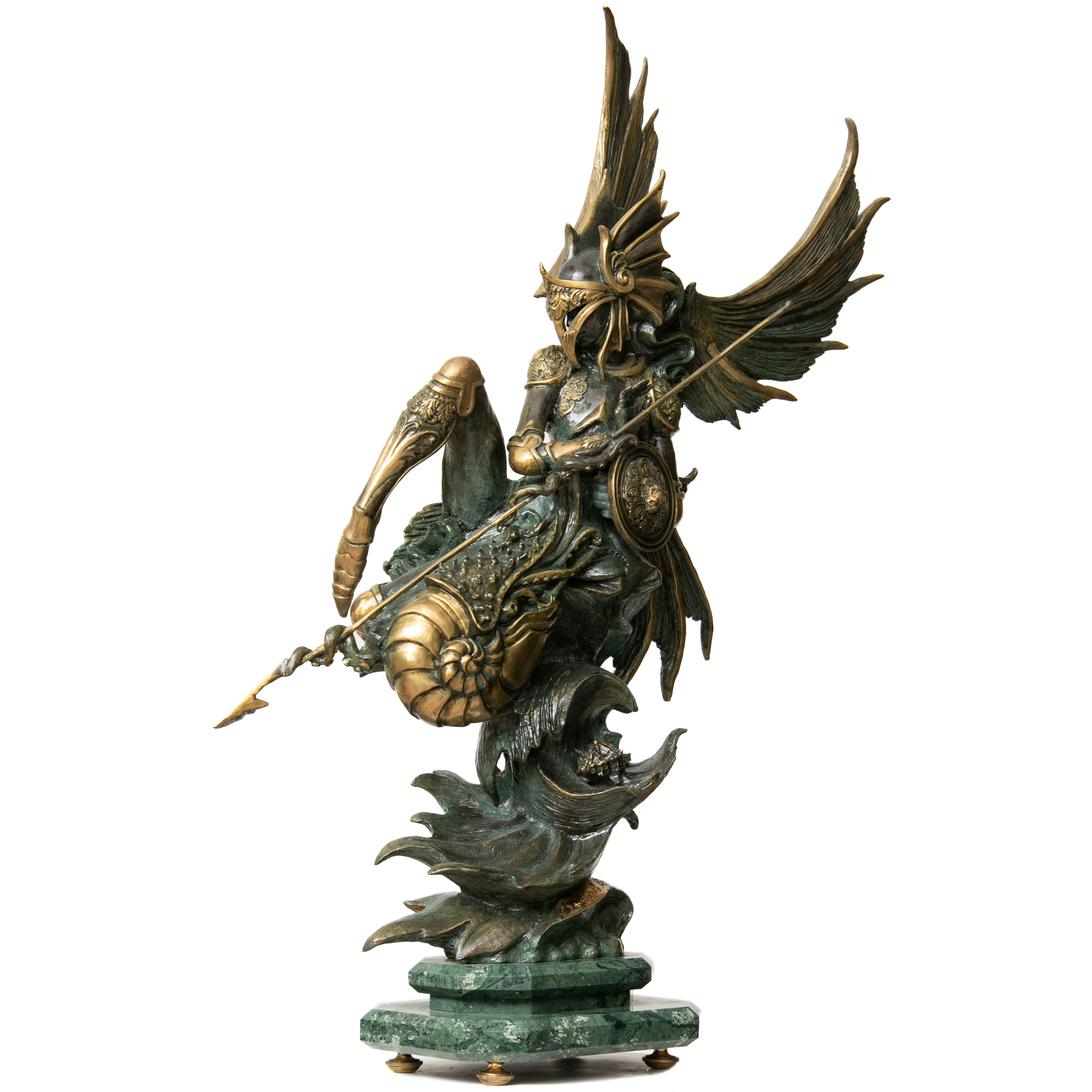 The upper part of the composition, topped with fantastic elements, seems to reflect the desire for heaven, while maintaining a connection with the depths of the sea. The blue marble base enhances the impression of endless elements, acting as a stable foundation for a dynamic and expressive image. The cool sheen of marble contrasts with the warmth of brass, creating a unique harmony of materials.