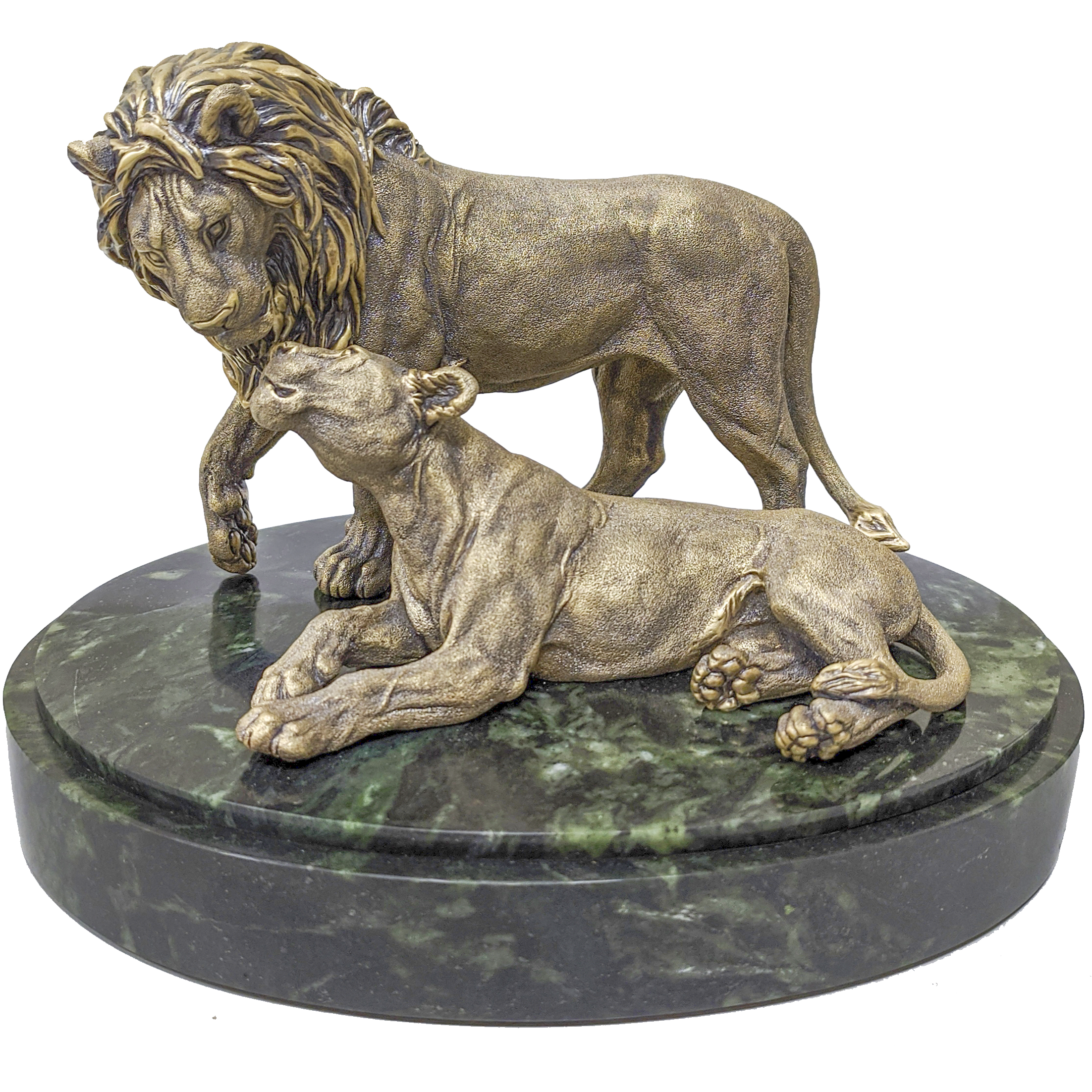 The bronze statuette "Lion's Kiss" on a serpentine stand is an ode to the majestic strength and tenderness hidden in the guise of royal predators. On a dark, deep serpentine stand, as if on a pedestal in the universe, a scene is revealed in which power and grace combine, causing the viewer to awe and reverence the symbols of royal power and devotion.