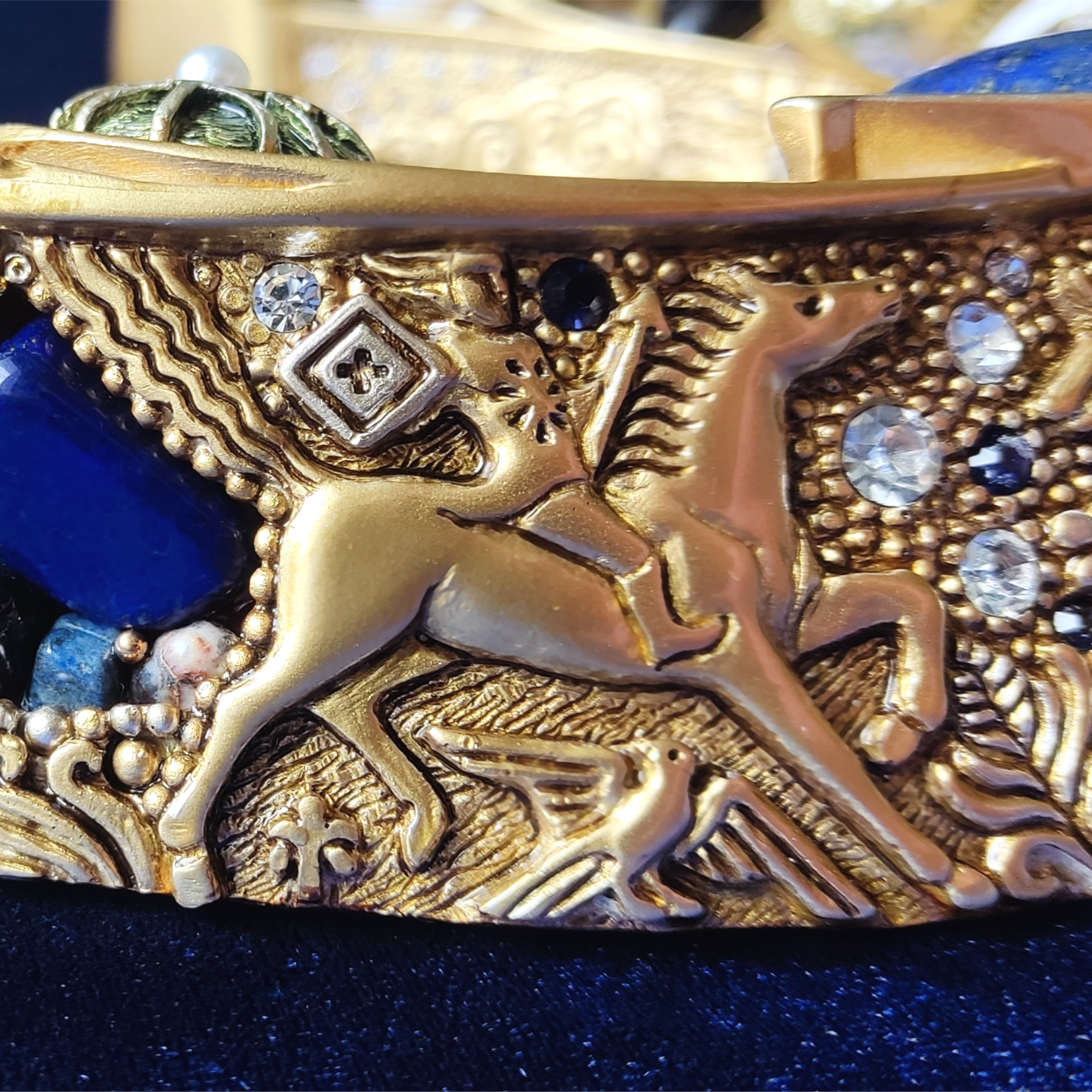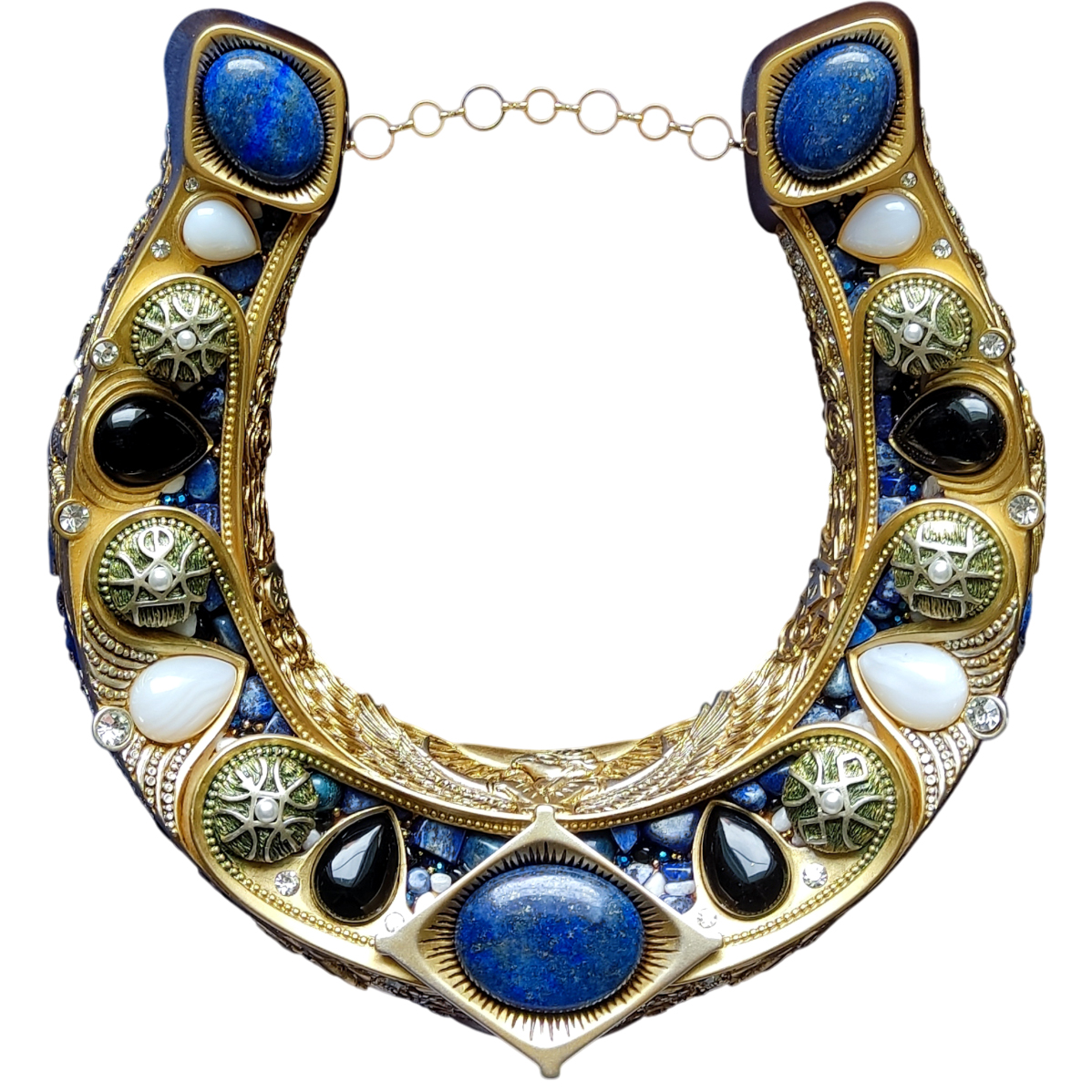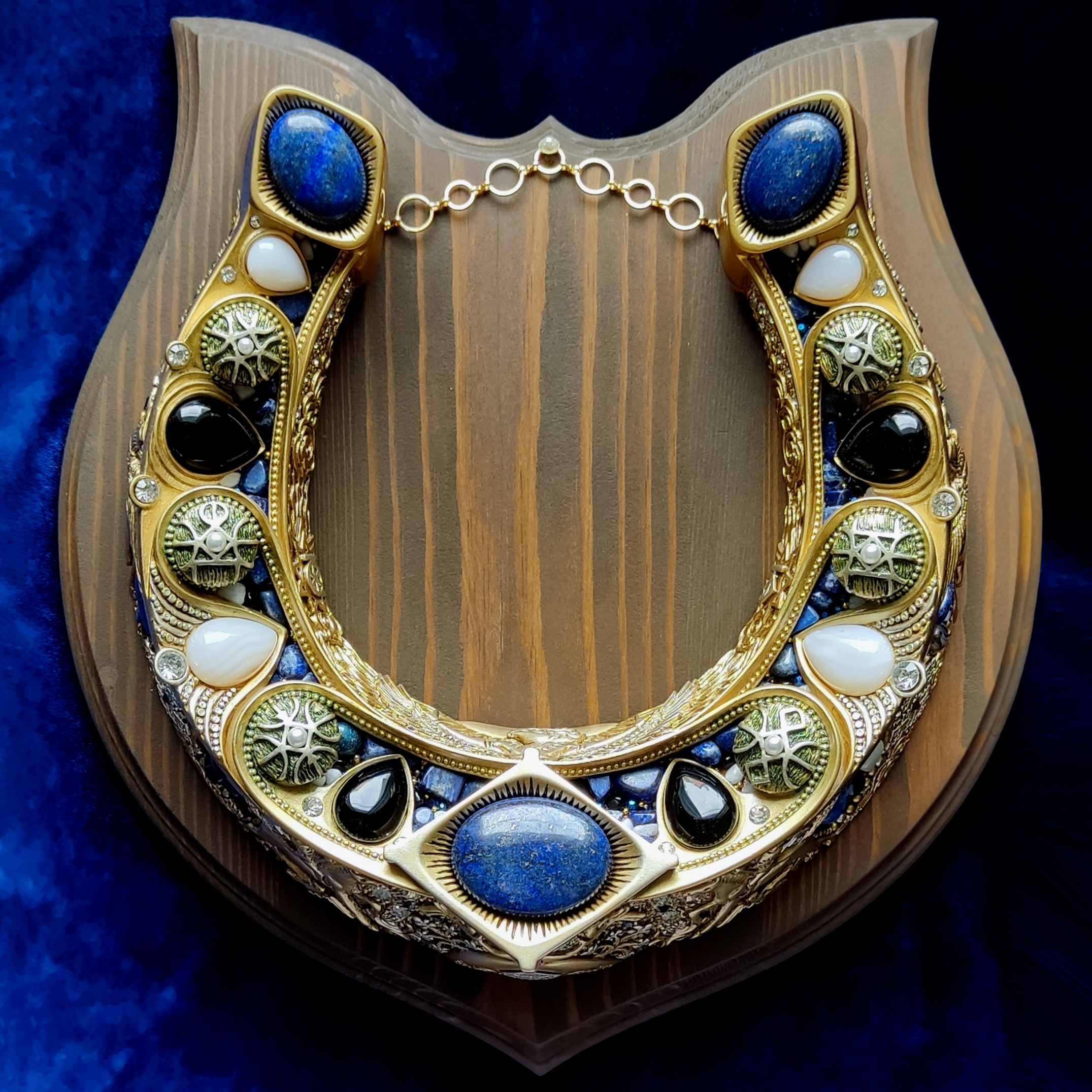 Materials:lapis lazuli, black agate, white agate, tiger's eye, awakened oat grains, acrylic, golden potal, varnish, pine, stain.