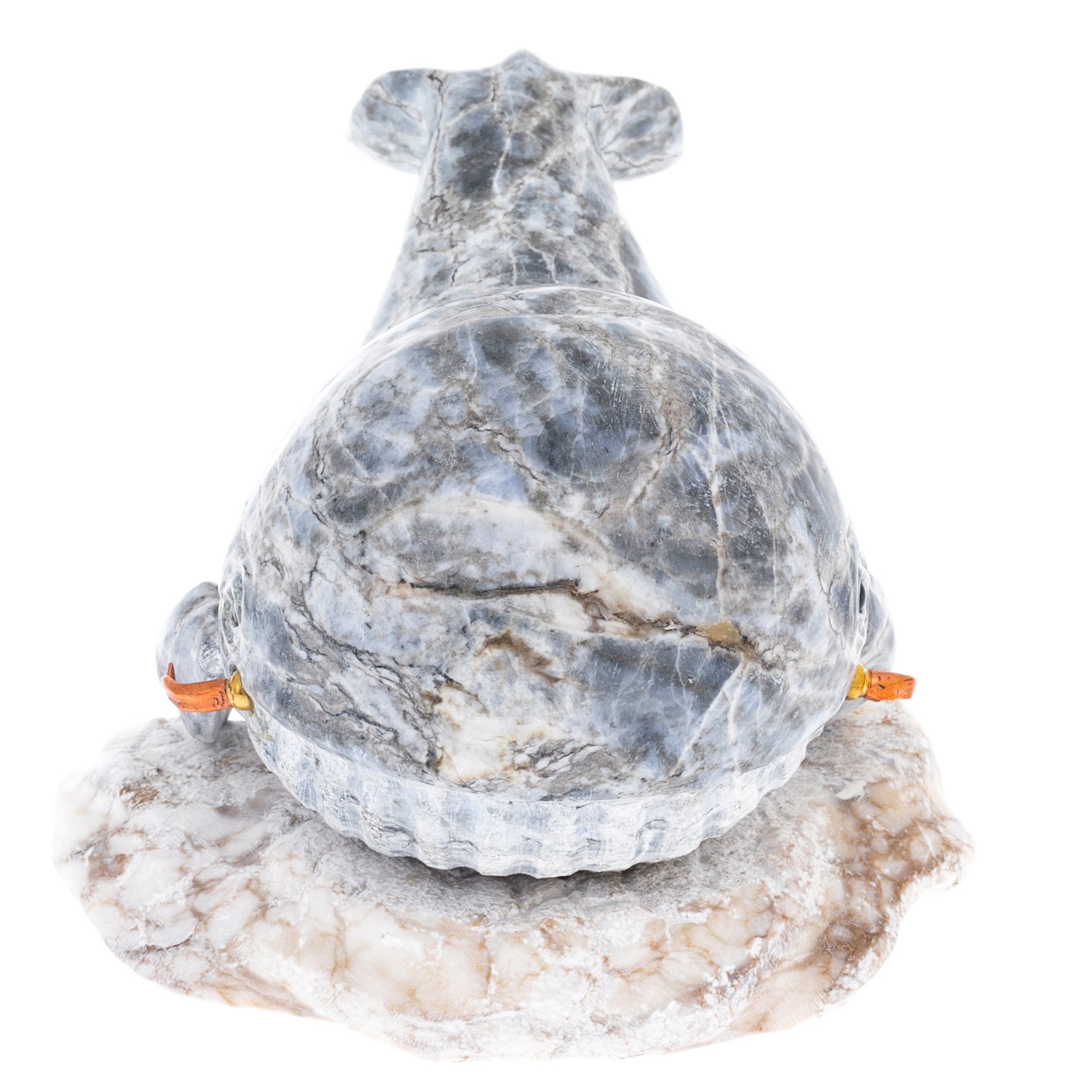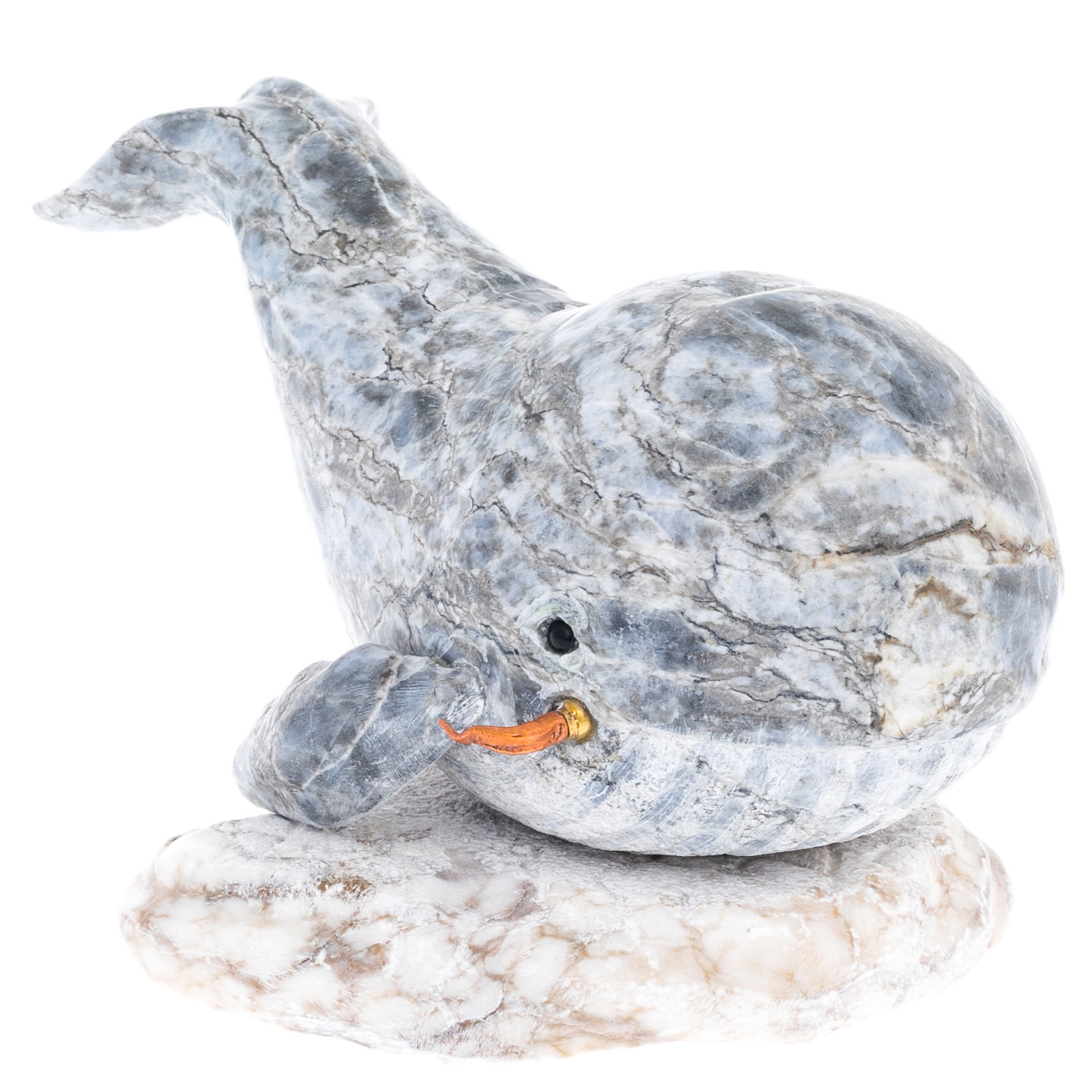 Скульптура «Кит» — образ, в котором мягкость и сила, грация и массивность соединены с почти детской непосредственностью. Выполненный из цельного блока ангидрита, морской гигант предстаёт в неожиданно трогательной трактовке: округлые формы, полуулыбка, гибко изогнутый хвост и взгляд, в котором будто живёт ласковое, первобытное спокойствие. Светло-серый камень с изящной природной прожилкой имитирует игру волн и глубину океанического горизонта, создавая ощущение естественного дыхания материала. Фигура расположена на полированной подставке из мрамора, напоминающей окаменелый коралл — тихое морское дно, на которое опустился сказочный обитатель.