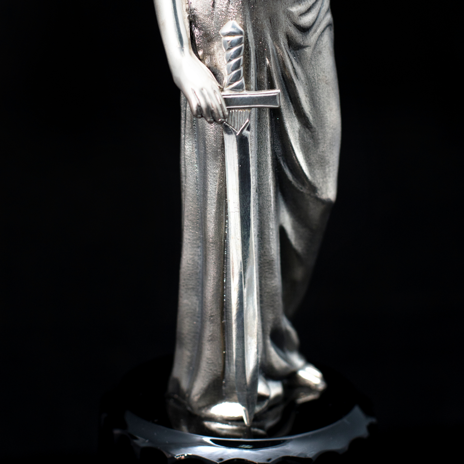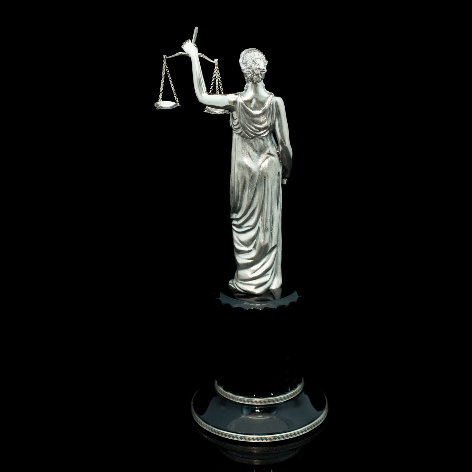 The sculpture "Themis" is made of 925 sterling silver in combination with obsidian stone.