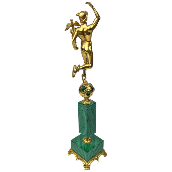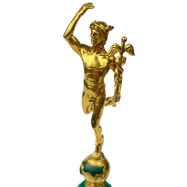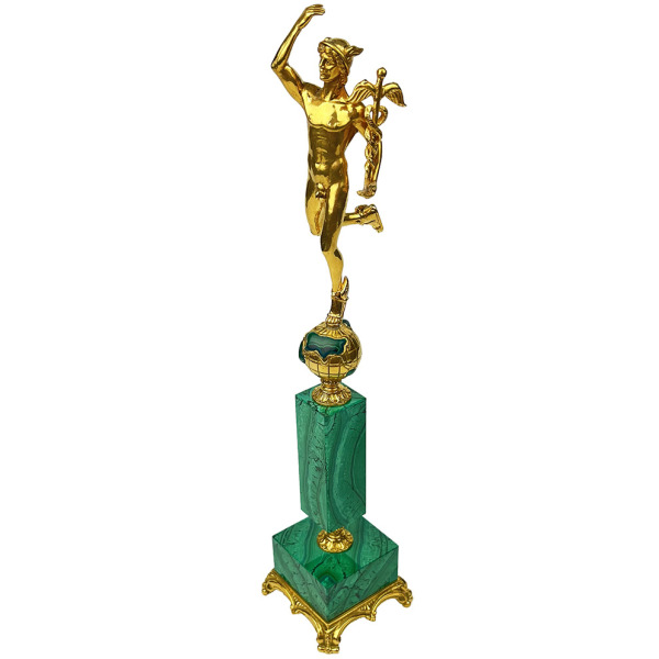 An exclusive statuette depicting the ancient Roman god Mercury is made of an exquisite combination of malachite and bronze. The natural gem is polished with jeweler's precision, impressing with its smooth, flawlessly smooth structure and unique pattern. The pure bronze from which the figure itself is made shimmers with gold and looks incredibly presentable.
