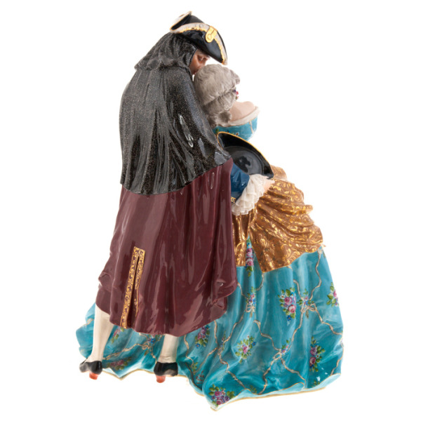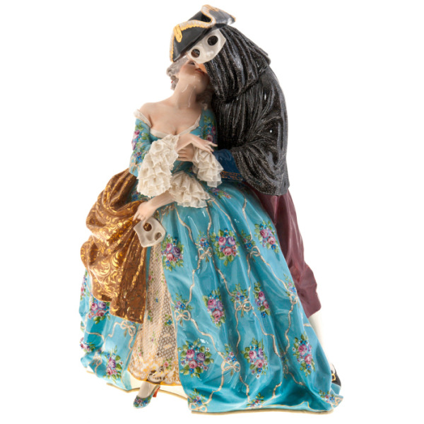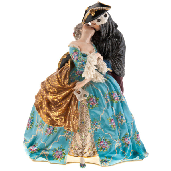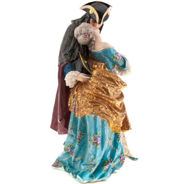In front of you is the statuette "Kiss" — a work of art embodying the sophistication and inimitable style characteristic of the Elite & Fabris masters from Italy. This porcelain statuette depicts two characters in luxurious carnival outfits immersed in the moment of an intimate kiss.