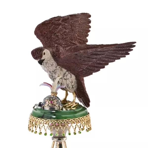 Скульптура «Сокол на столике» — сложный художественный объект ювелирного уровня, выполненный мастерами MOISEIKIN из яшмы, нефрита и драгоценных материалов. Композиция воплощает образ сокола — символа власти, проницательности и внутренней силы, издавна сопровождавшего правителей и знатных людей. Фигура птицы с тщательно проработанным оперением вырезана из яшмы, создающей ощущение живой фактуры, а изящные детали — клюв, лапы и декоративные элементы — дополнены золотом 750 пробы и серебром, подчеркивая статус и художественную глубину изделия. Образ завершает декоративный элемент в виде соколиного клобучка, придающий композиции историческую достоверность и особую выразительность.