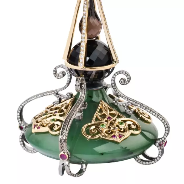 В основании композиции расположен нефритовый столик насыщенного зеленого оттенка, символизирующий гармонию, устойчивость и благородство. Его поверхность украшена тонкой ювелирной оправой с использованием золочения и вставок из драгоценных камней. Центральная часть конструкции представляет собой сложную архитектурную форму с подвесными элементами и ограненными камнями, где дымчатый кварц и обсидиан создают эффект глубины и внутреннего света. В декоре использованы бриллианты различных характеристик, демантоиды, рубины, аметисты, турмалины и цитрины, формирующие богатую цветовую палитру и усиливающие визуальную динамику композиции.