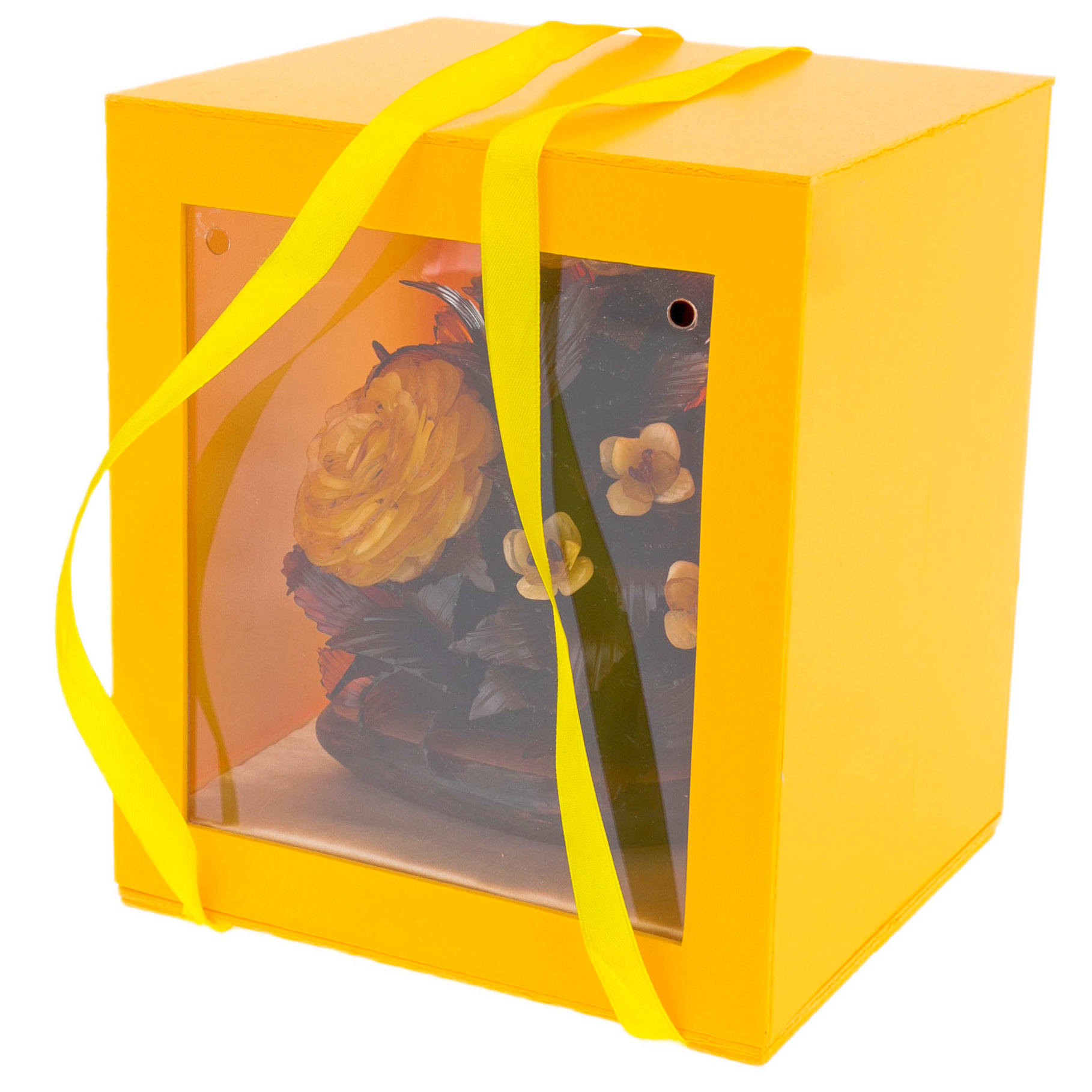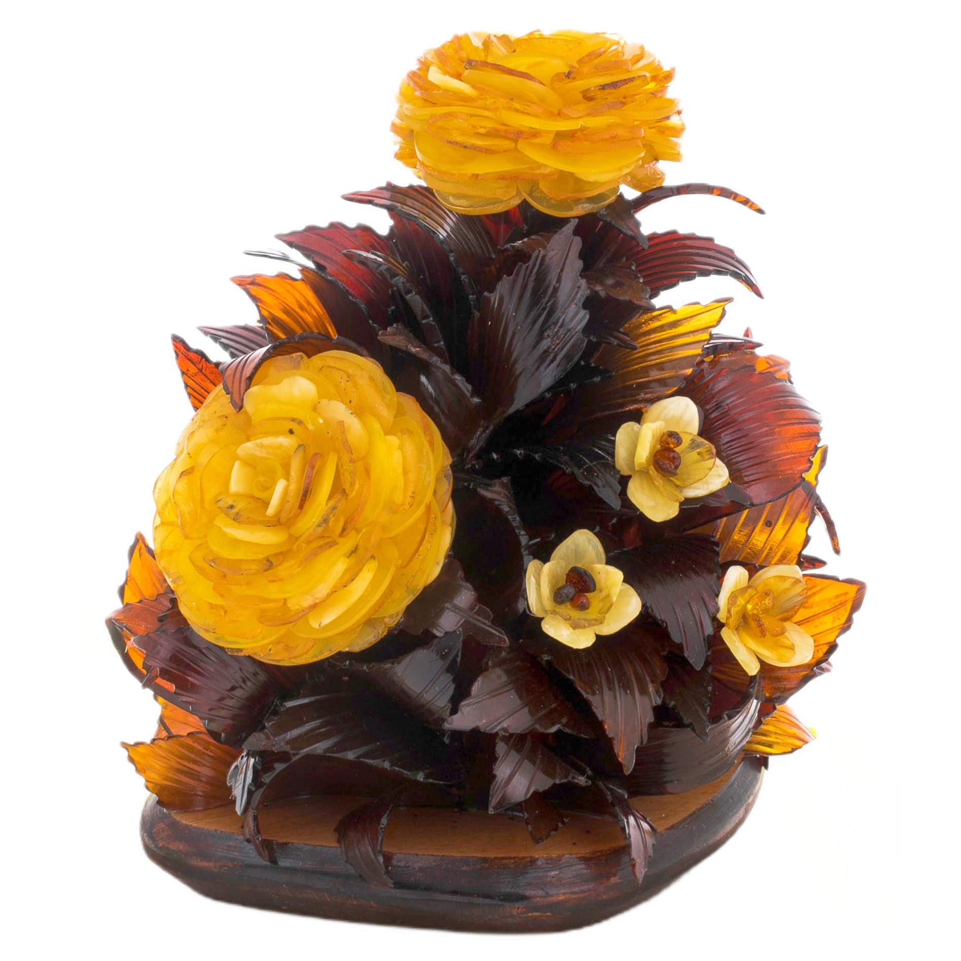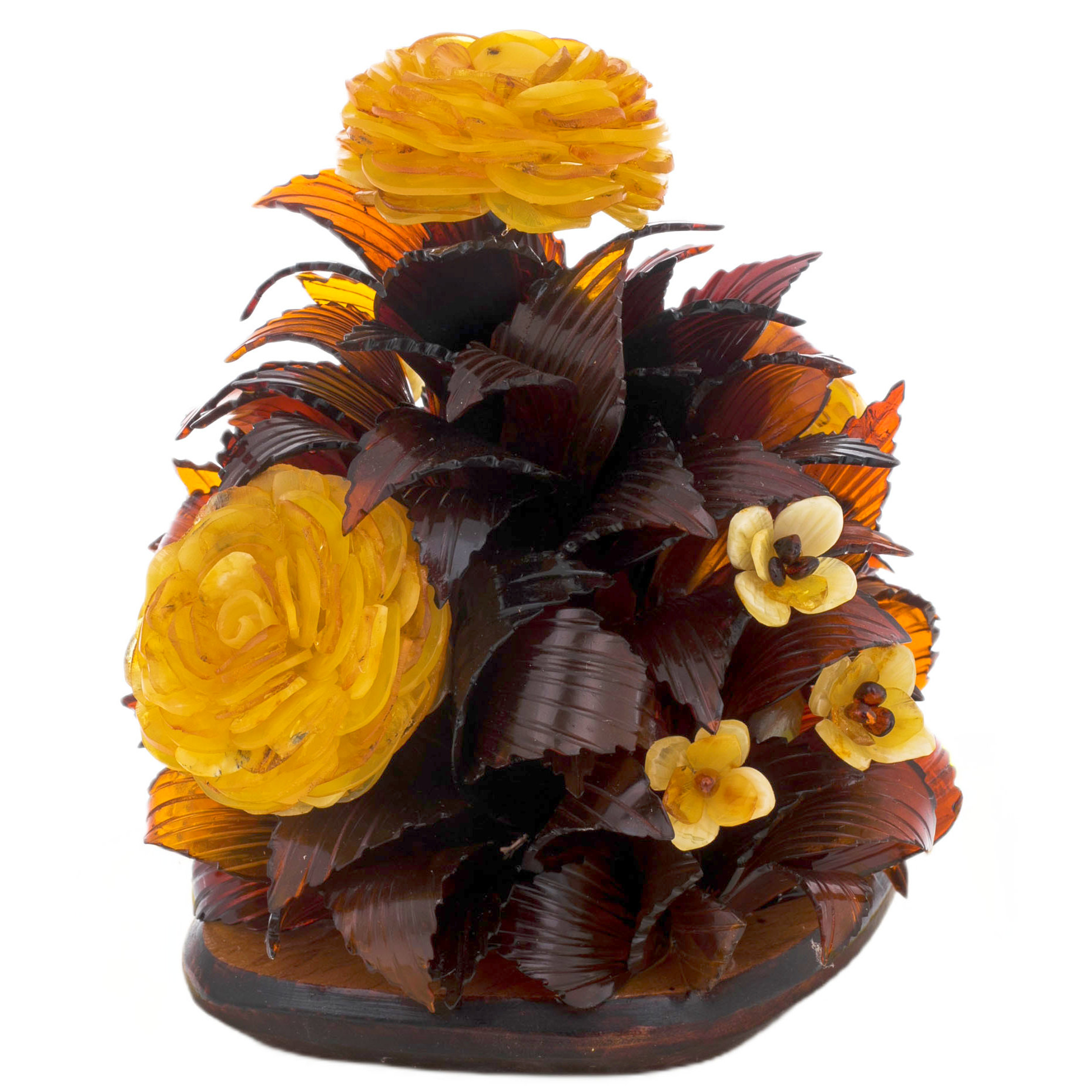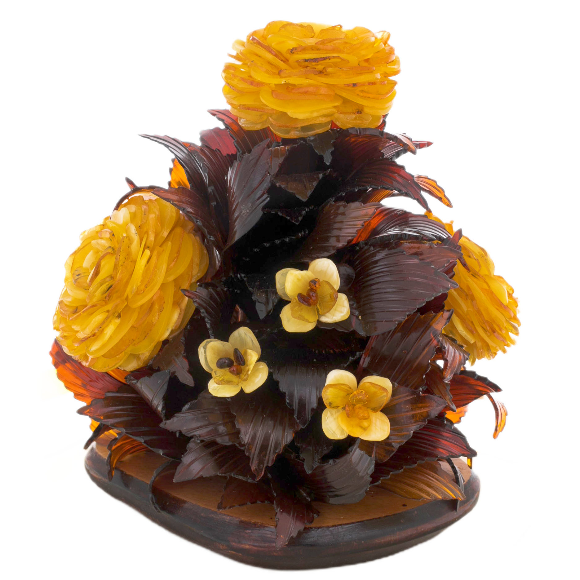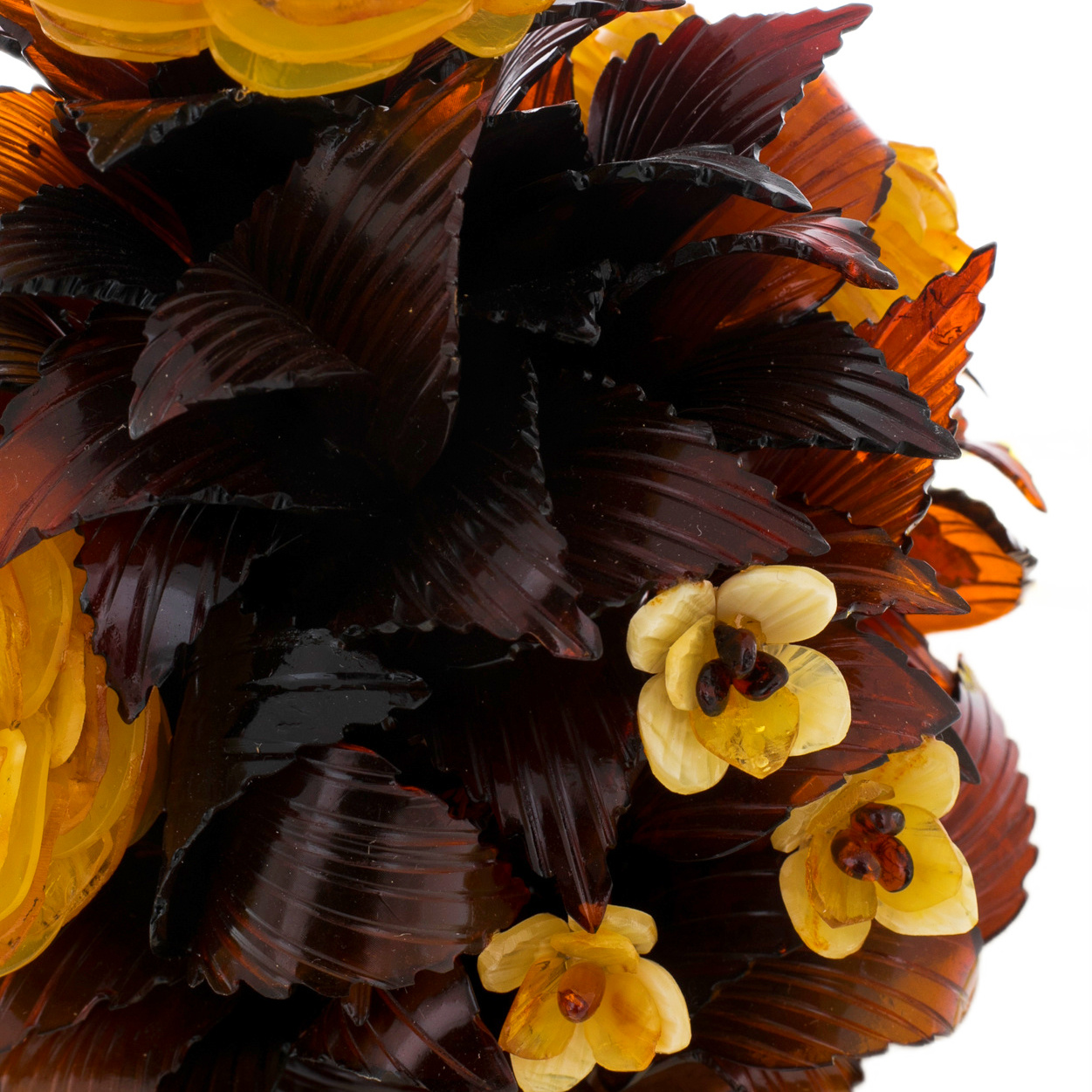 Янтарь, рожденный из древней смолы и несущий в себе миллионы лет истории, высоко ценится не только за природную красоту, но и за энергетические свойства. В культуре Востока и Европы этот минерал ассоциируется с очищением, солнечным светом и внутренней гармонией. Мастера, работавшие с данным материалом, бережно раскрыли его естественные оттенки и прозрачность, добившись скульптурной выразительности каждого лепестка и листа. Легкая асимметрия и множественность тонов придают икебане не только декоративность, но и художественную глубину.