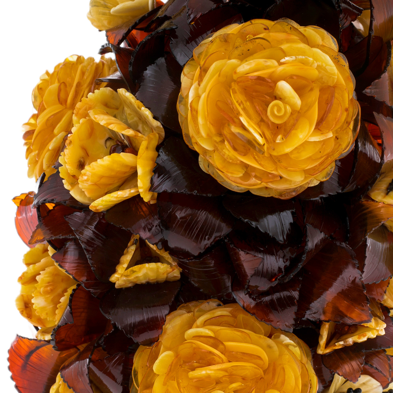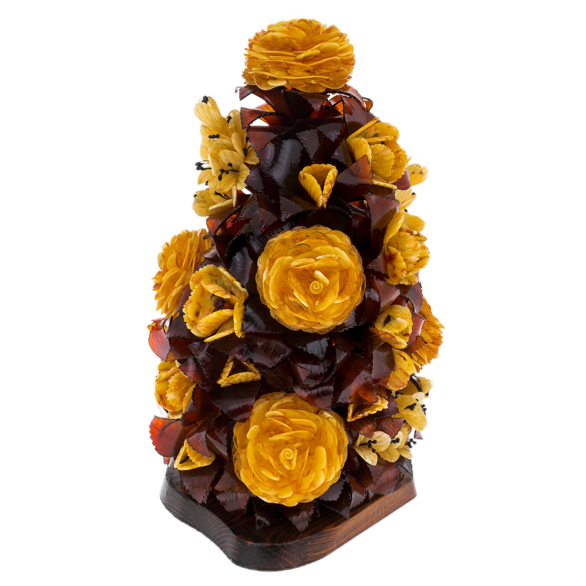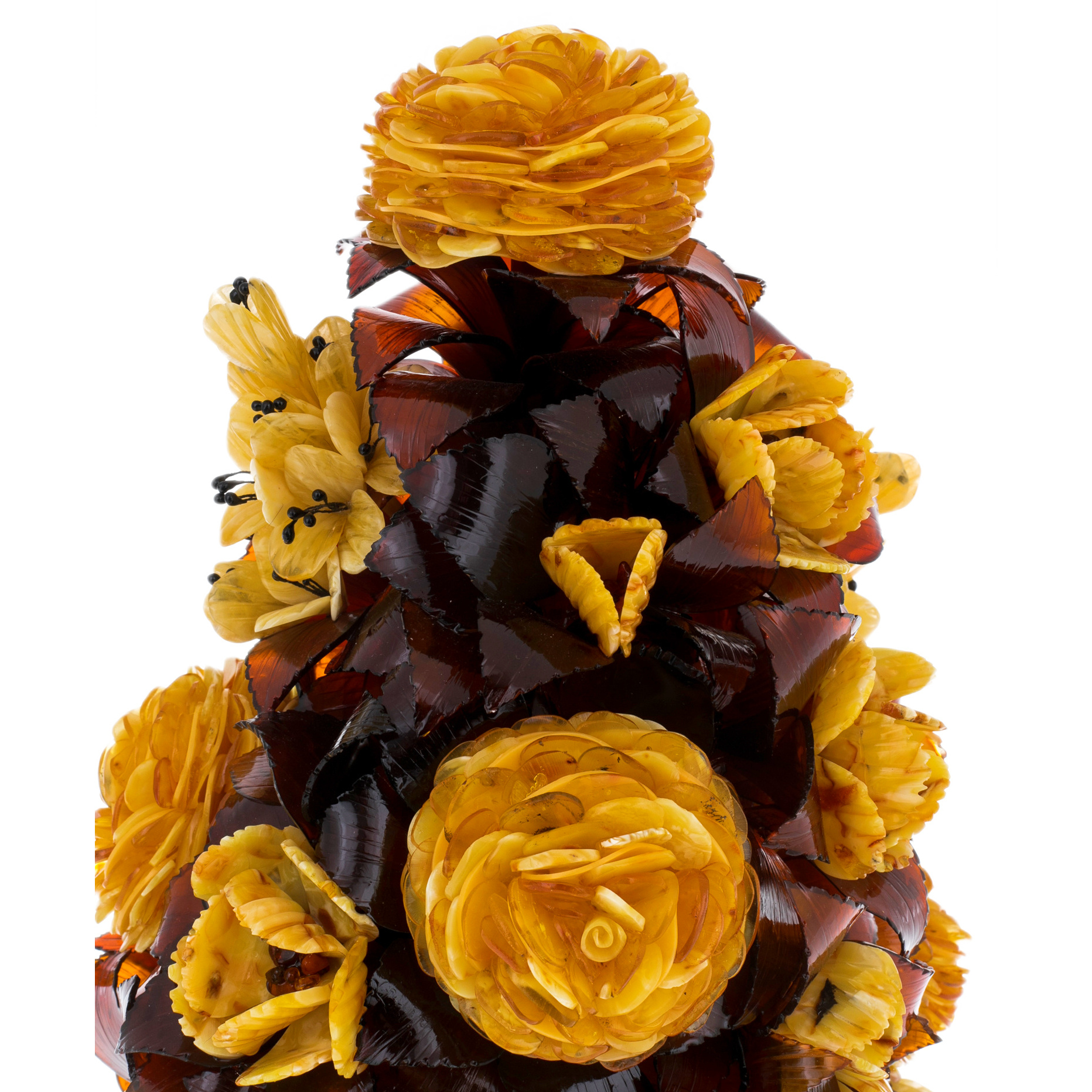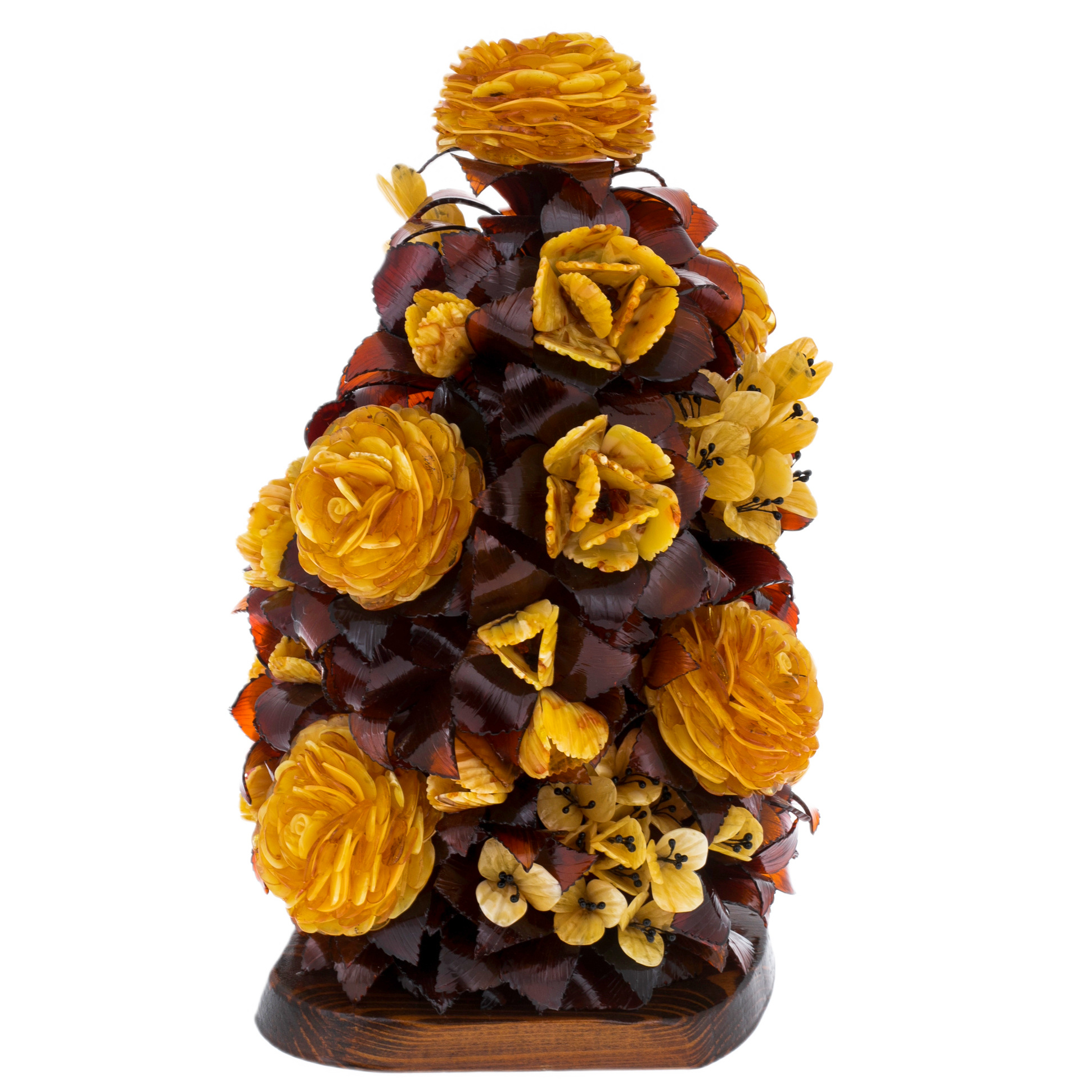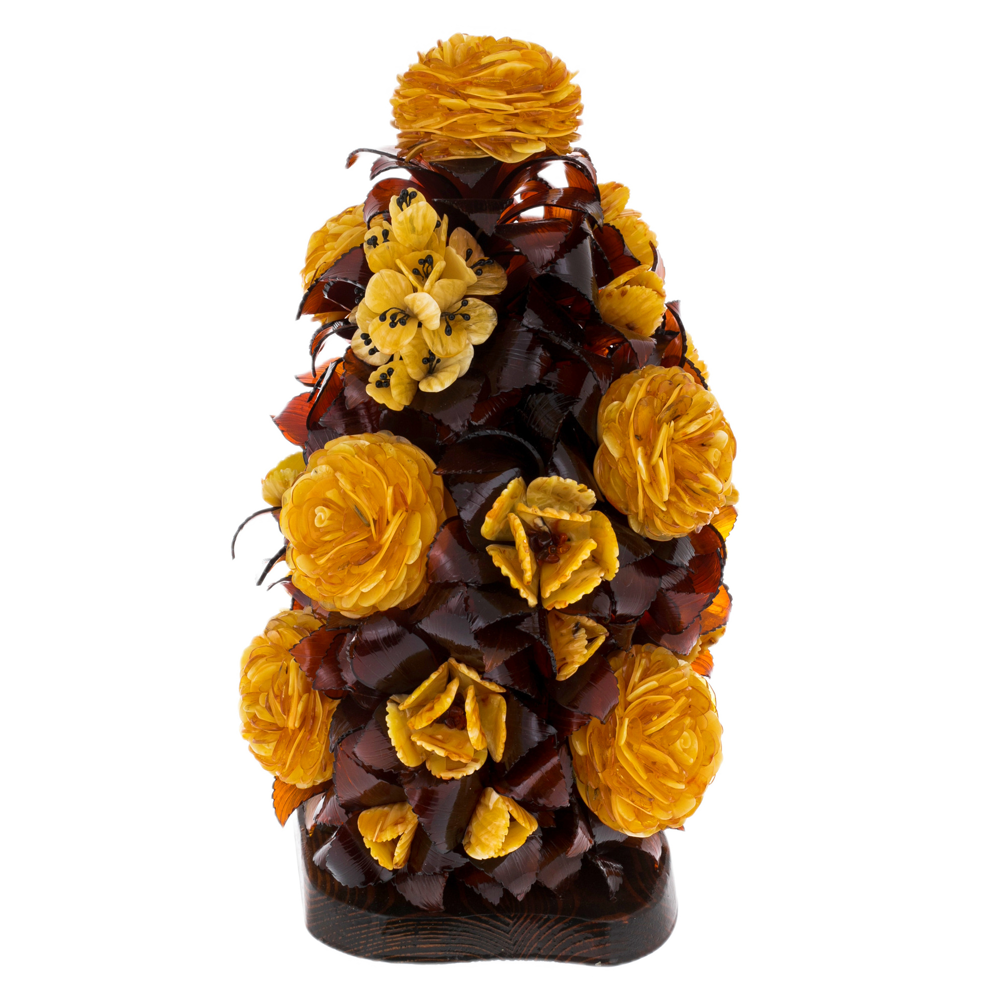 Взгляд задерживается на крошечных деталях, каждая из которых напоминает о кропотливом труде художника: миниатюрные бутоны, точёные кончики лепестков, прожилки, прорисованные с ювелирной точностью. Янтарь, обладающий тысячелетней историей, хранит в себе энергию солнца и теплоту веков, делая эту икебану не просто декоративным объектом, а истинным источником вдохновения и силы.