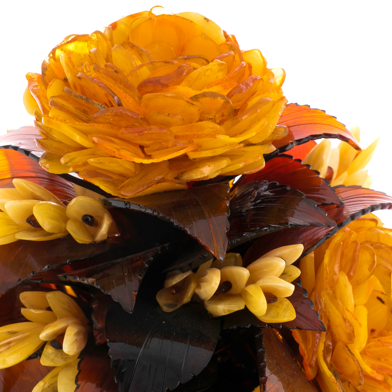 Each facet of this composition reflects the play of light, enlivening it with warm golden and honey shades. The deep cognac amber from which the leaves are made highlights the exquisite contrast with the sunny flowers created from the purest and most transparent nuggets. This color transition symbolizes the unity of opposites — light and shadow, night and day, tradition and innovation, combined in an eternal dance of beauty.