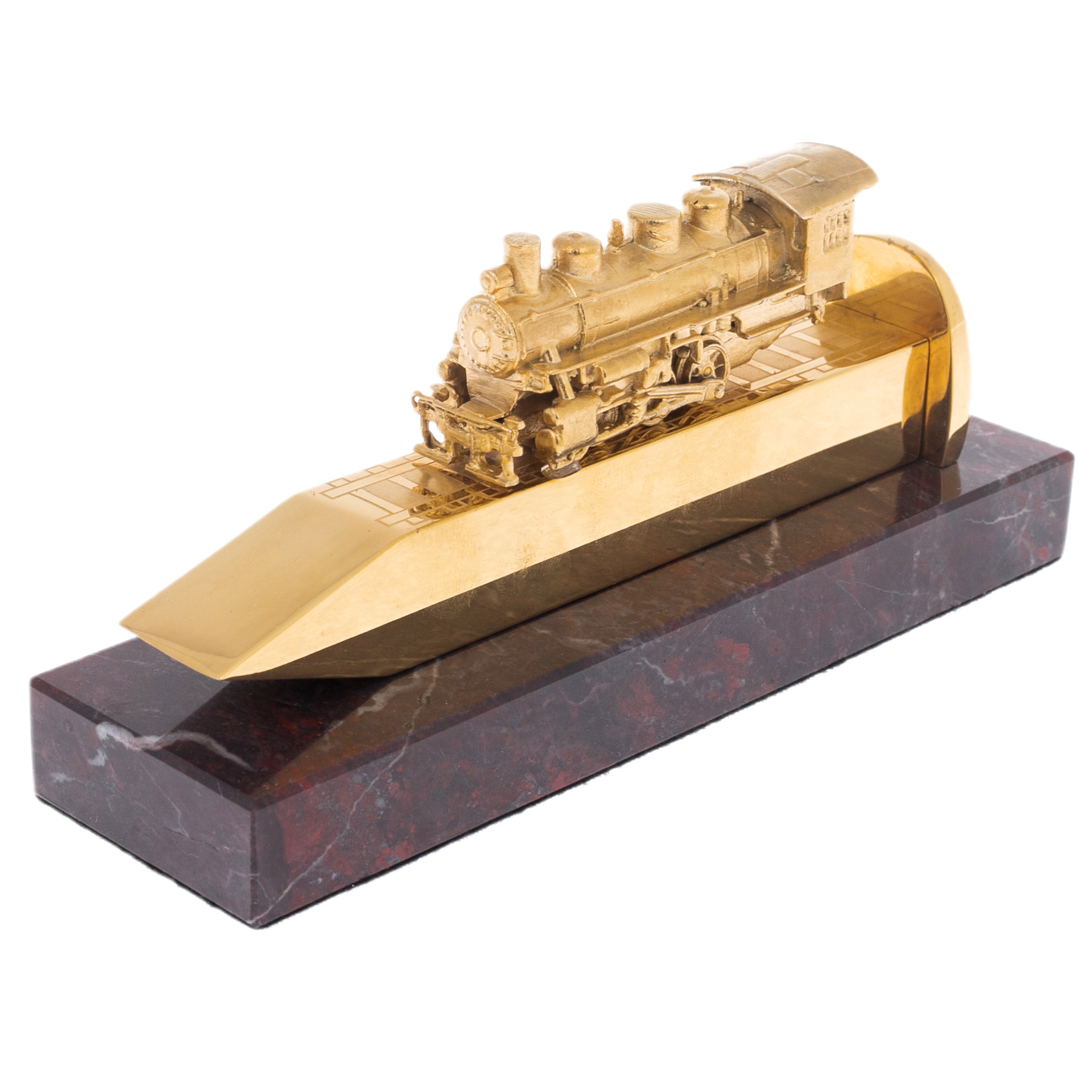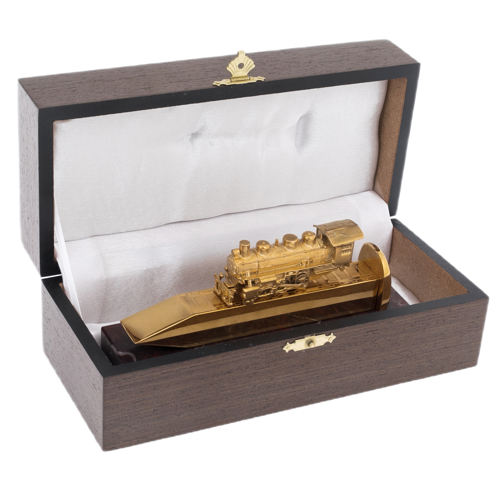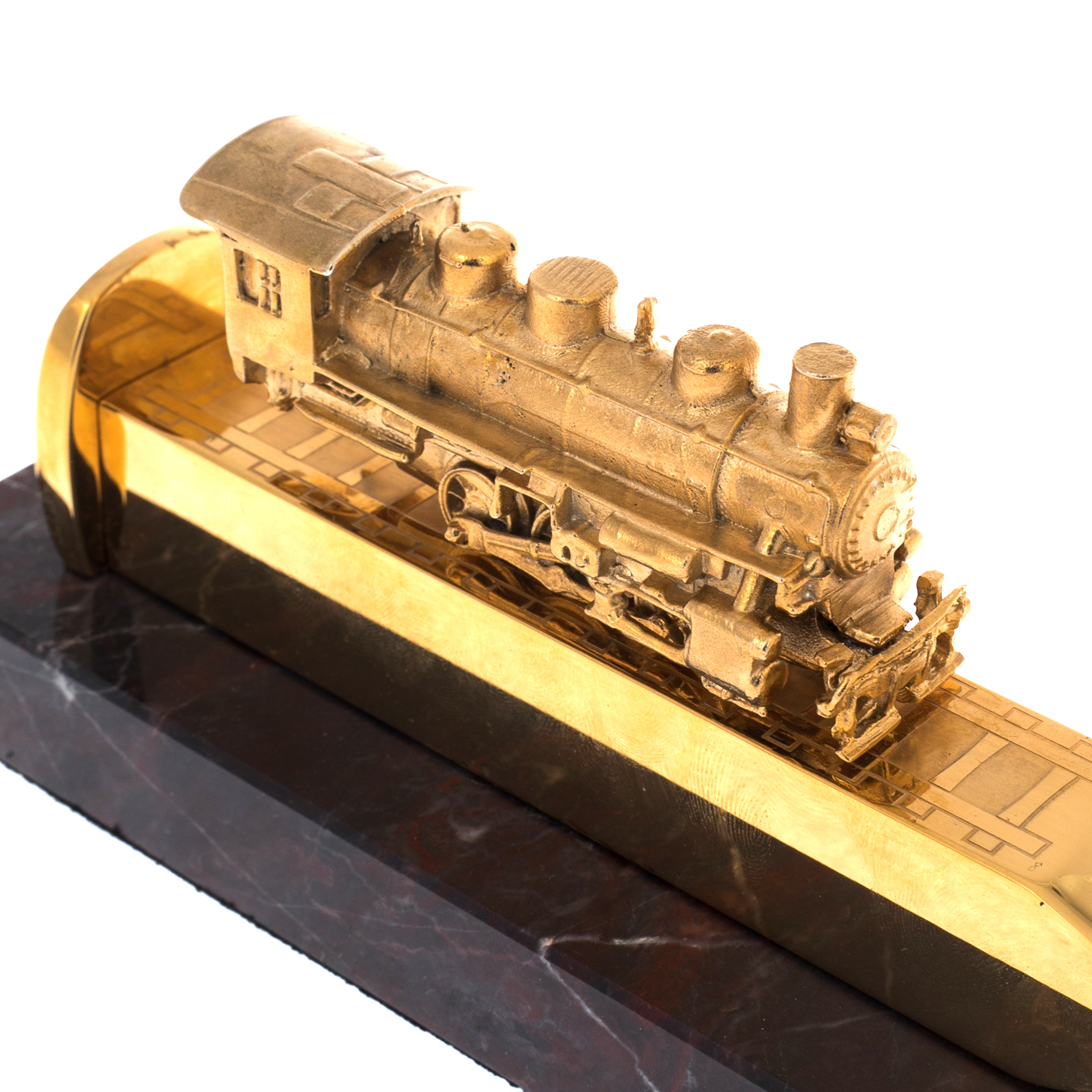 На строгой подставке из яшмы, словно на рельсах истории, размещён миниатюрный паровоз — воплощение силы, движения и инженерной воли. Модель покрыта благородным слоем золота, придающим объёму мягкое сияние. Сложная архитектура локомотива передана с изумительной точностью: выступающие котлы, арочные трубы, замысловатая система поршней и клёпаная поверхность создают эффект реального движения, застигнутого в статике. Паровоз установлен не просто на платформу, а на символический железнодорожный костыль — деталь, глубоко понятная тем, кто прокладывает магистрали, управляет потоками и видит в инфраструктуре основу власти.