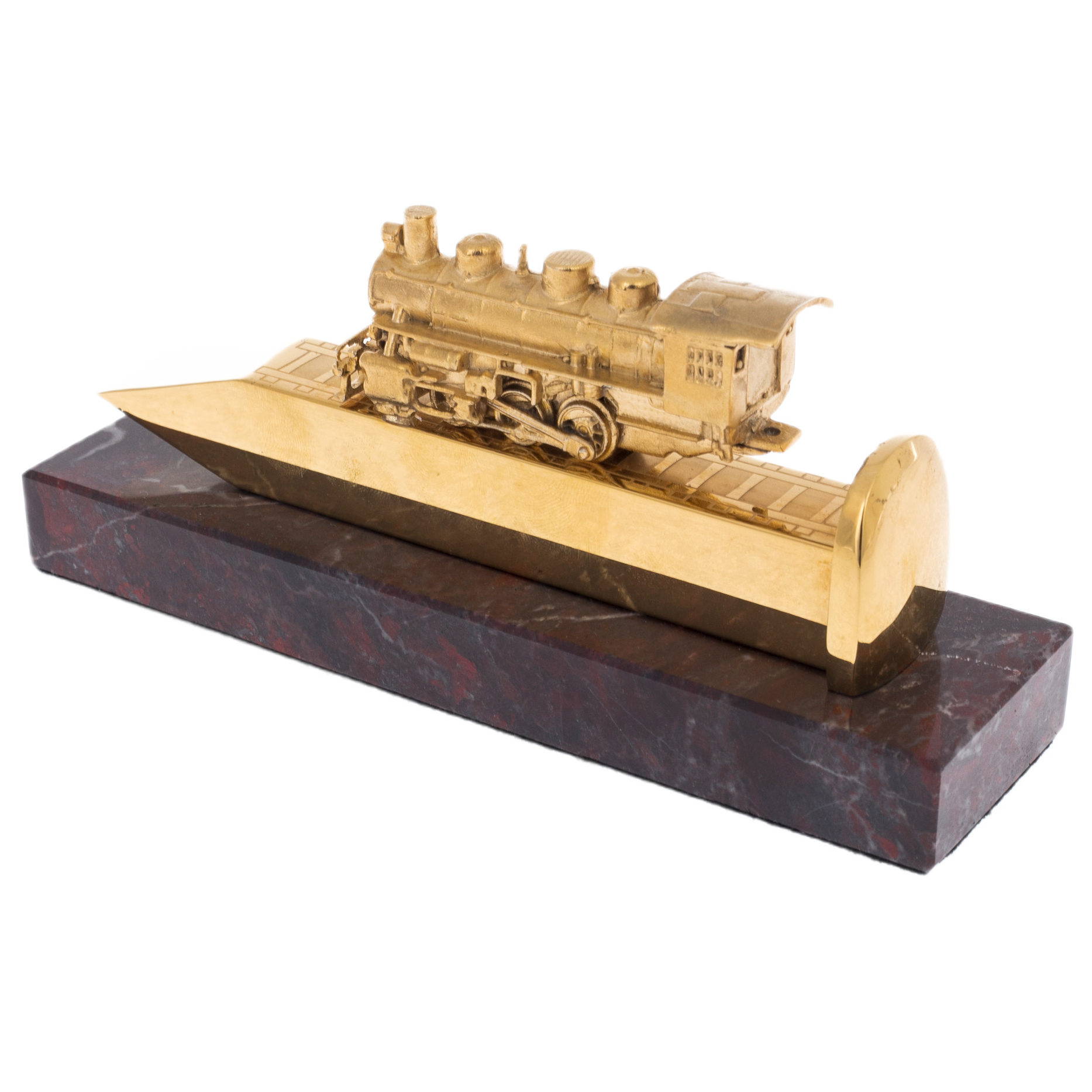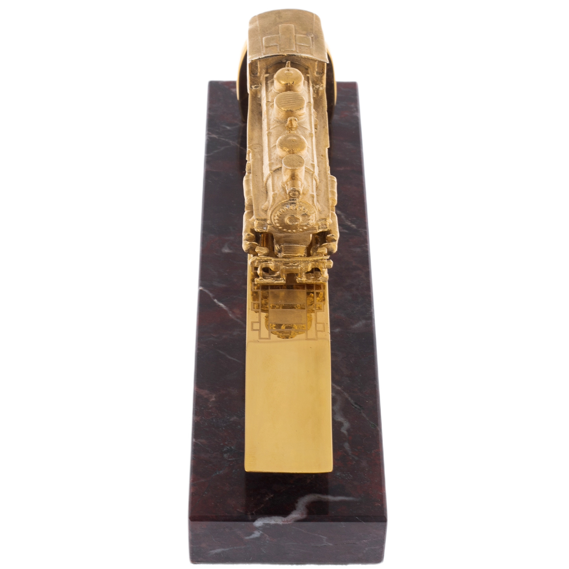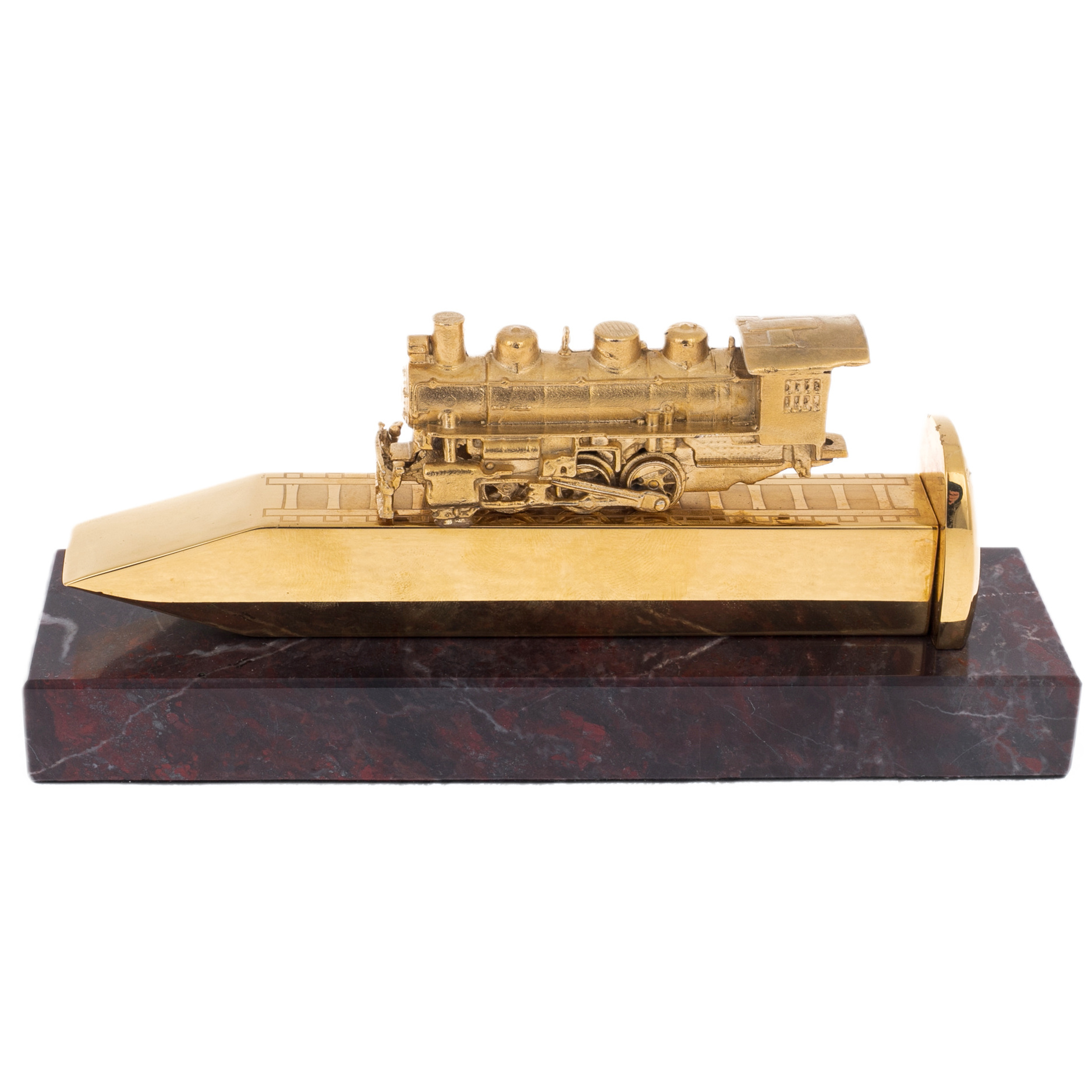 На строгой подставке из яшмы, словно на рельсах истории, размещён миниатюрный паровоз — воплощение силы, движения и инженерной воли. Модель покрыта благородным слоем золота, придающим объёму мягкое сияние. Сложная архитектура локомотива передана с изумительной точностью: выступающие котлы, арочные трубы, замысловатая система поршней и клёпаная поверхность создают эффект реального движения, застигнутого в статике. Паровоз установлен не просто на платформу, а на символический железнодорожный костыль — деталь, глубоко понятная тем, кто прокладывает магистрали, управляет потоками и видит в инфраструктуре основу власти.