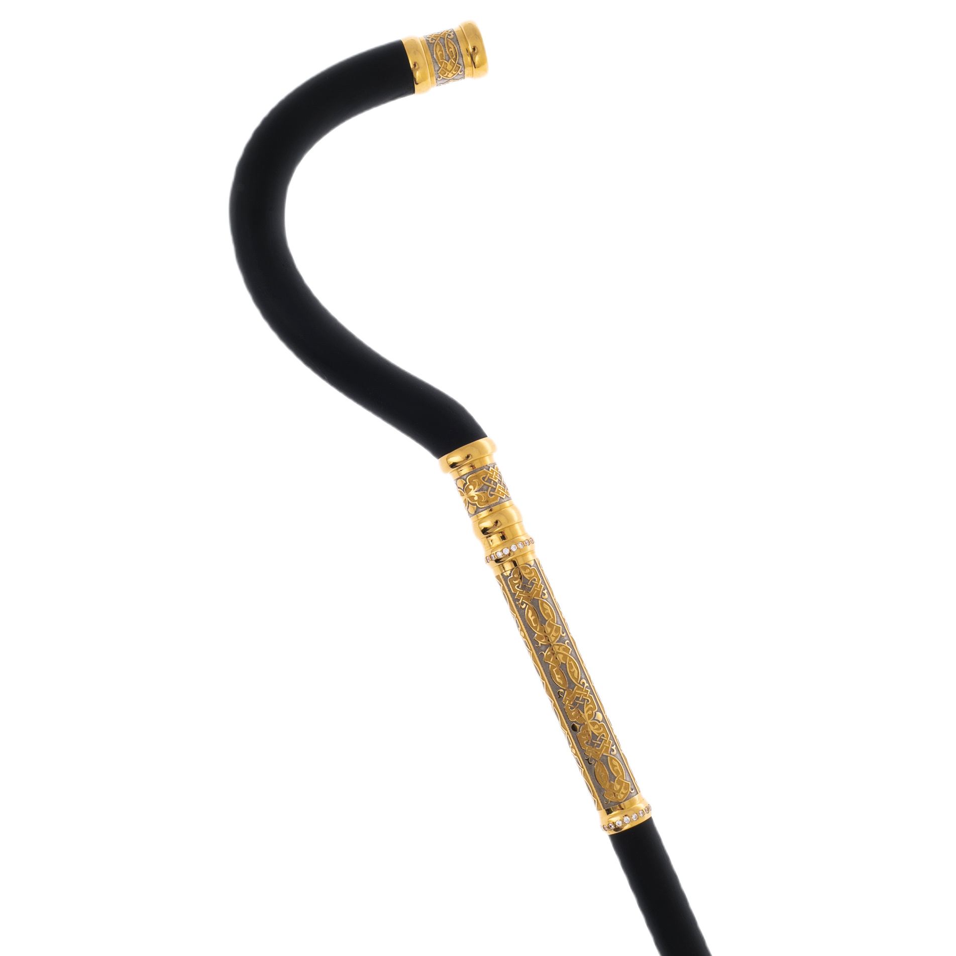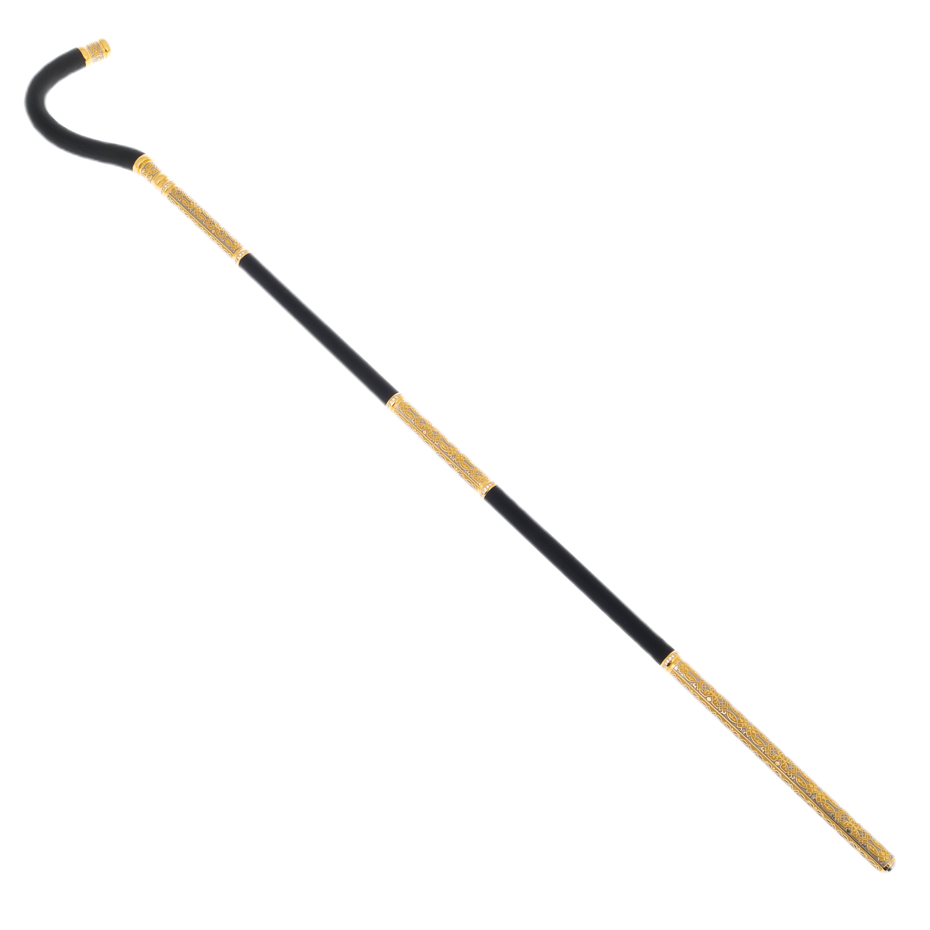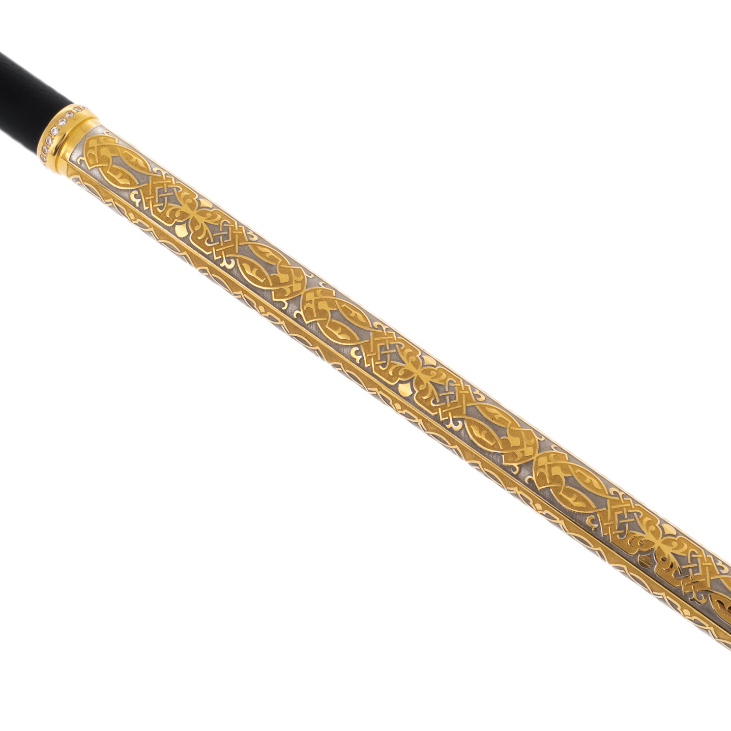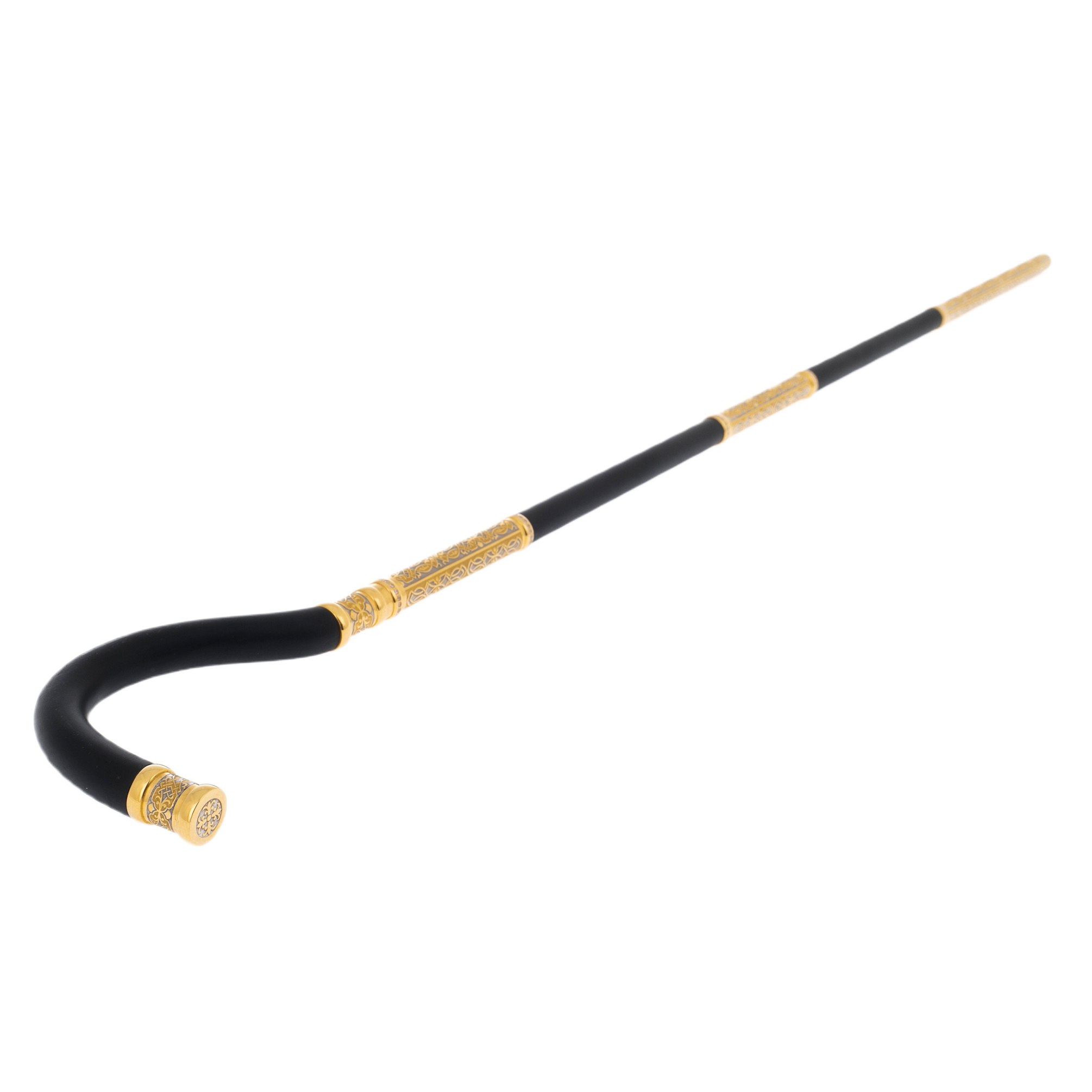 The cane is made by Zlatoust craftsmen from natural mahogany, carefully processed, polished and coated with a special composition that protects against moisture and drying. The tip and the knob are decorated with 999 gold plating. The artist depicted a unique ornament on it, and the engravers immortalized it with a chisel and a needle. After the etching procedure in the oven, the decor became even more expressive and voluminous.