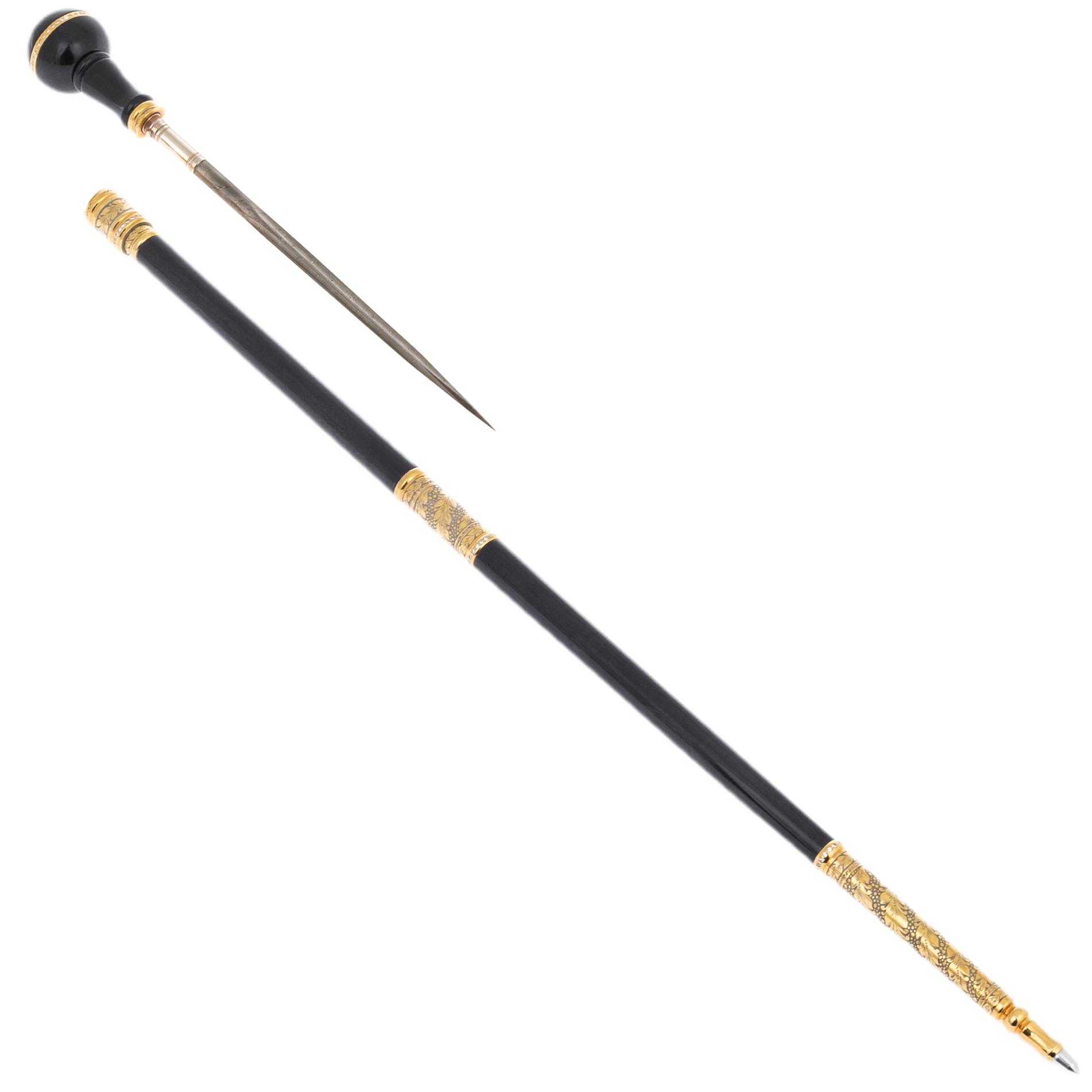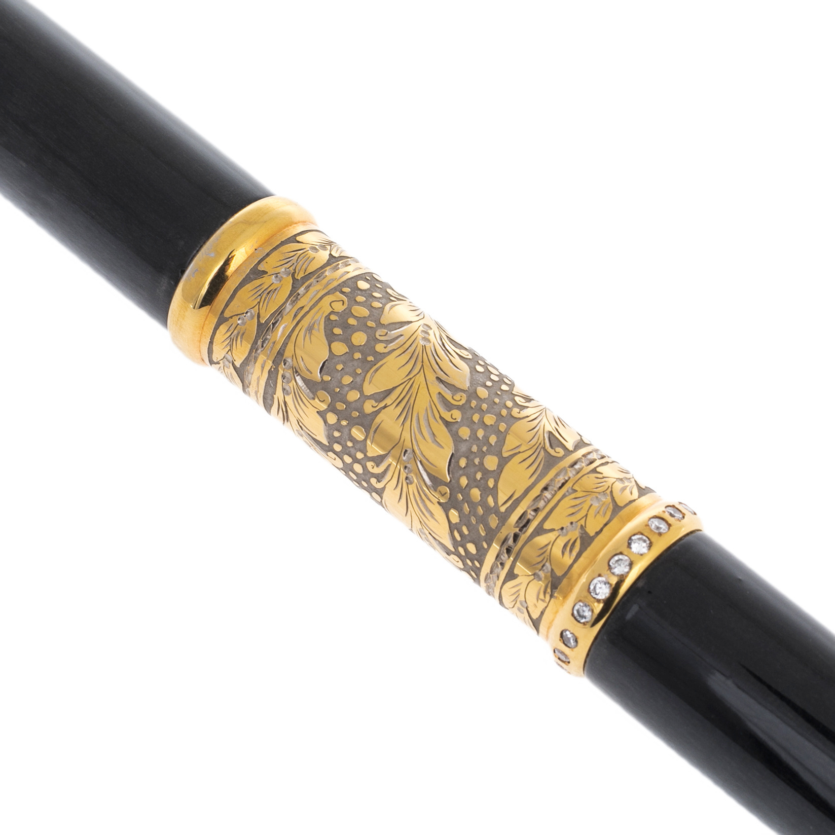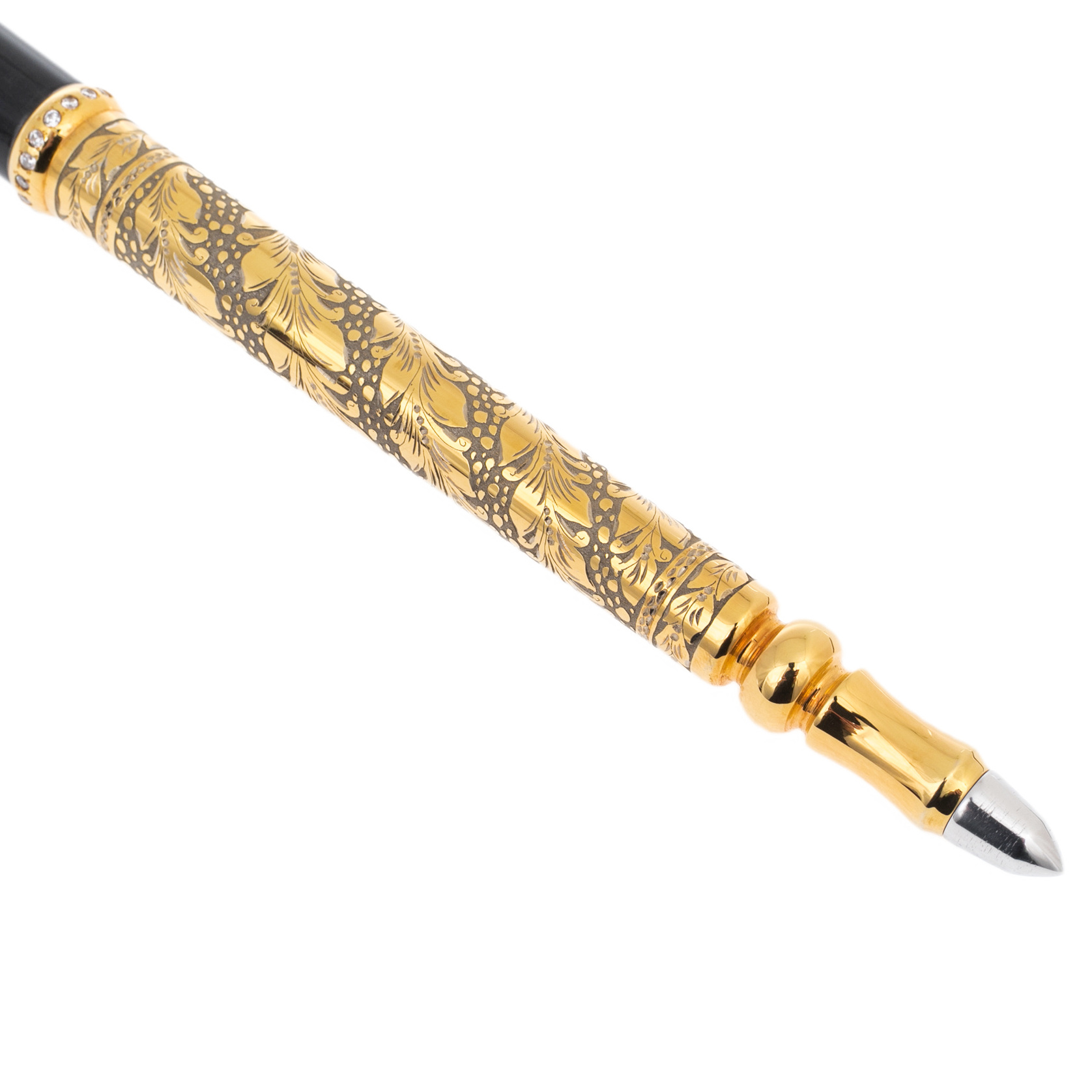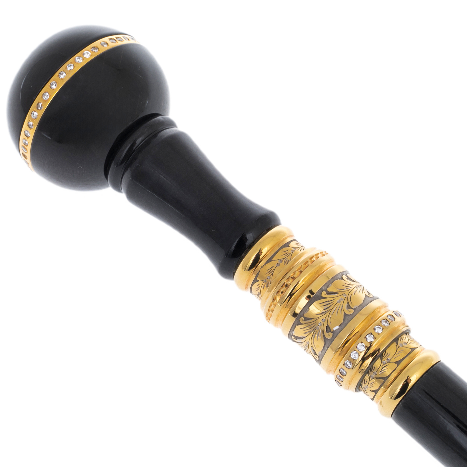 В оформлении металлических элементов использована техника ручной гравировки по Златоустовской традиции. Каждый завиток орнамента, покрытый сусальным золотом, проявляется на матовом фоне с особой рельефной глубиной. Мастера, работающие в этой технике, владеют уникальным сочетанием механической точности и художественной интуиции, позволяющей создавать эффектные и в то же время благородно сдержанные узоры. В качестве декора выступают также аккуратно инкрустированные кристаллы, усиливающие игру света и придающие трости драгоценную выразительность.