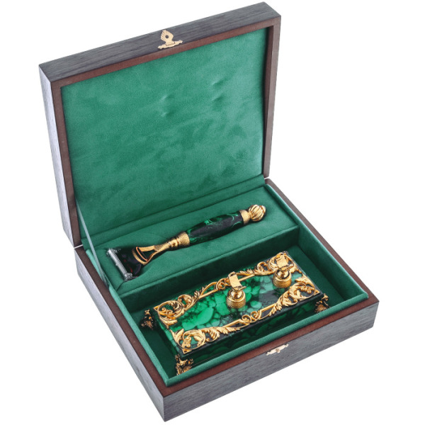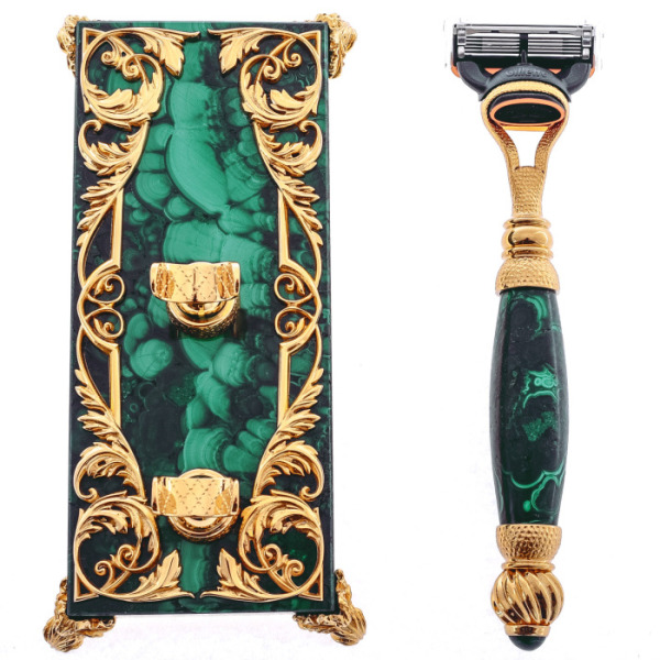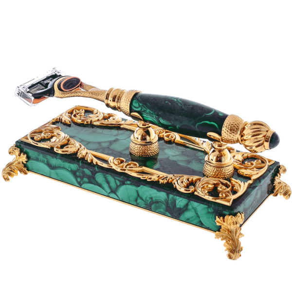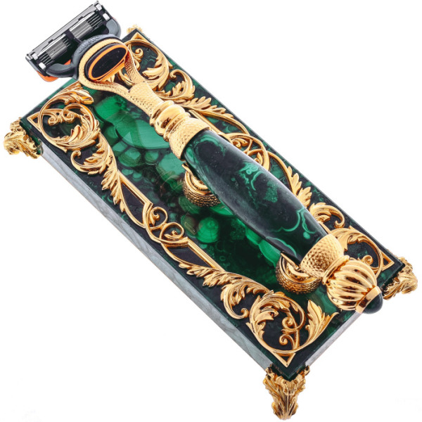 The stand and the machine are made of natural malachite, a rich emerald stone with a unique pattern on the cut. All the works of master Zlatoust are made only by hand. The stone is cut, polished, giving the desired shape, and then decorated with brass inserts with gilding. Just look at how filigreed the drawing is! The bizarre patterns are first hand-drawn and then engraved. At the final stage, the gold decor was etched to consolidate the result and make it lively and voluminous. The machine is placed on special fasteners so that moisture flows off the blades. The cassette can be purchased at any store as soon as the old blades are blunted.