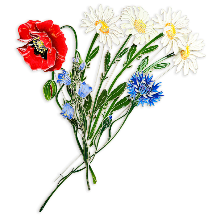 «Яркие, желтые, раскачивающиеся в такт ветру послушные розетки на стебле с ажурными листьями были символом начинающихся каникул. Я высовывалась в открытое окно поезда местного сообщения в преддверии станции. И да, нетерпеливо отсчитывала секунды, пересчитывая любимые бубенцы... О том, что, по преданию, внутри соцветия можно было найти заснувшего эльфа, я узнала намного позже, беседуя с соседом по креслу в швейцарском экспрессе. Взрослая, я уже в такт отсчитывала не секунды, ведь дедушка и лошадка на станции меня уже не ждут... а народные названия цветка: купава купальница, купавка, жарки, огоньки, сибирская роза, автдоки, бубенчики, болотные колотушки, болотные шапки.... Я буду их носить по несколько цветов, в развалившемся букете. Броши изогнуты, как живые»