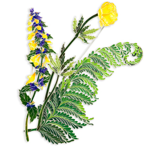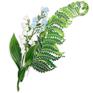 «Ярко-зеленый, нагло-красивый, на глазах раскрывающийся, разворачивающийся спиралью из почки лист папоротника устраивал мои первые садовые и лесные арт-перформансы детства. В легенду о цветущем папоротнике я не верила. Цветок его не искала. Искала художника, который может нарисовать мои эмоции, и ювелира, который филигранно повторит рисунок и раскрасит любимый лист слоями эмали. Папоротник, защищающий нежные цветы незабудок и ландышей – мой идеальный букет. Букет, который не завянет. И не исчезнет из природы. А продлит весну и лето!».