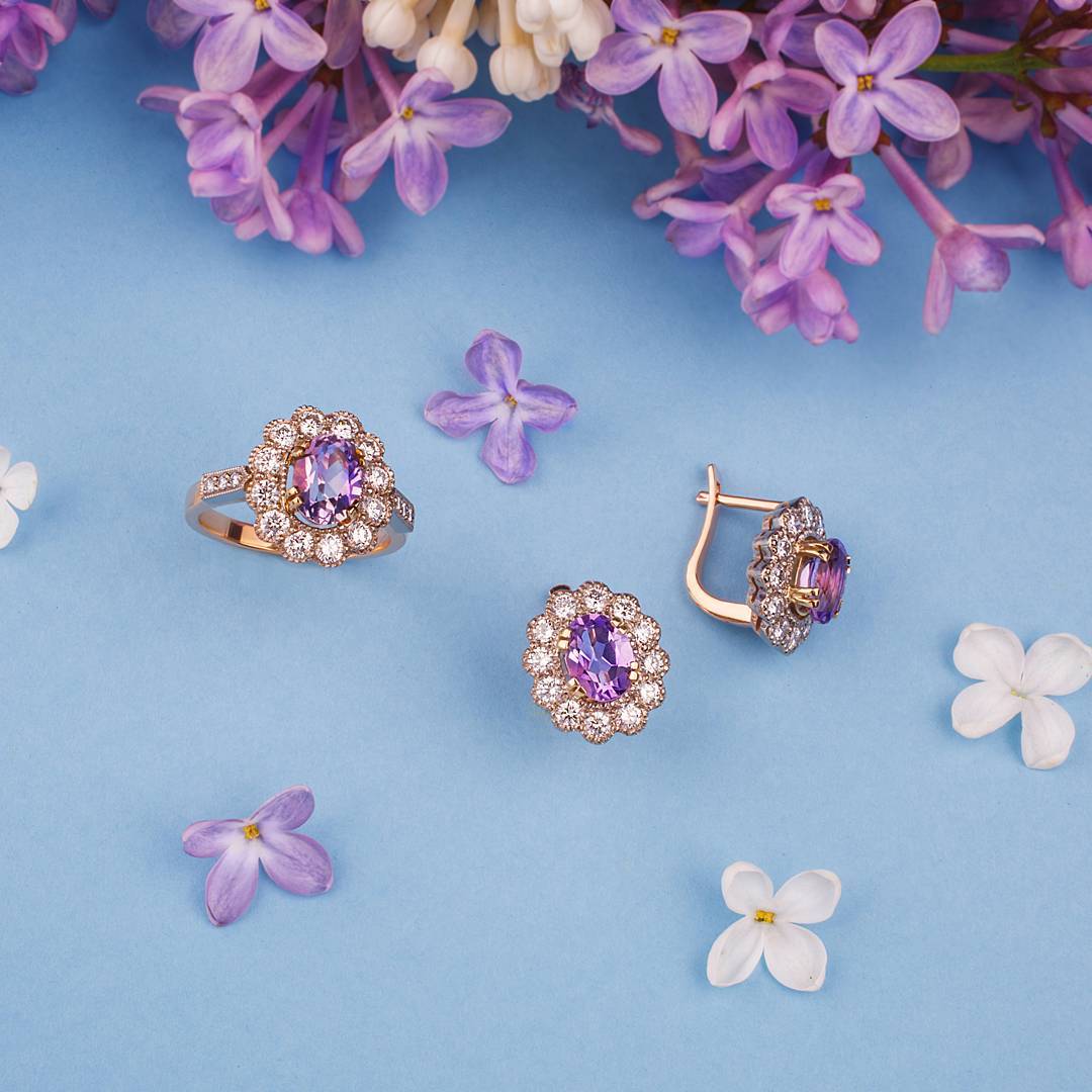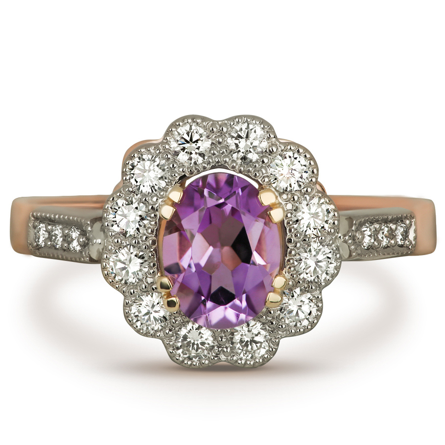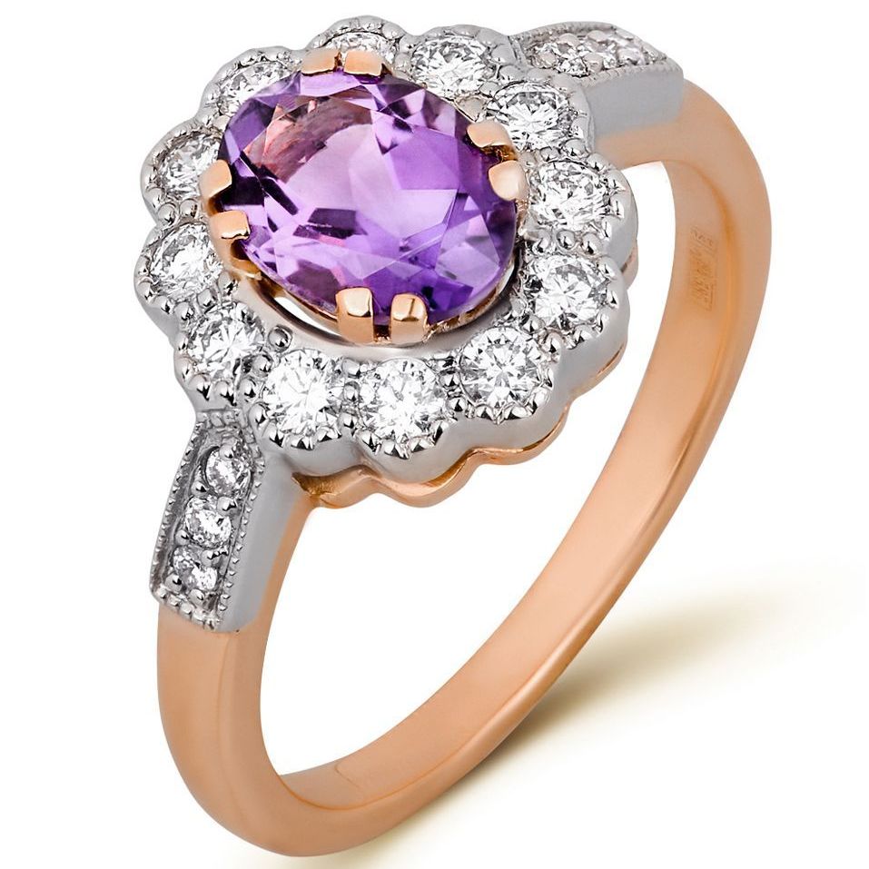 Red gold ring with amethyst and diamonds