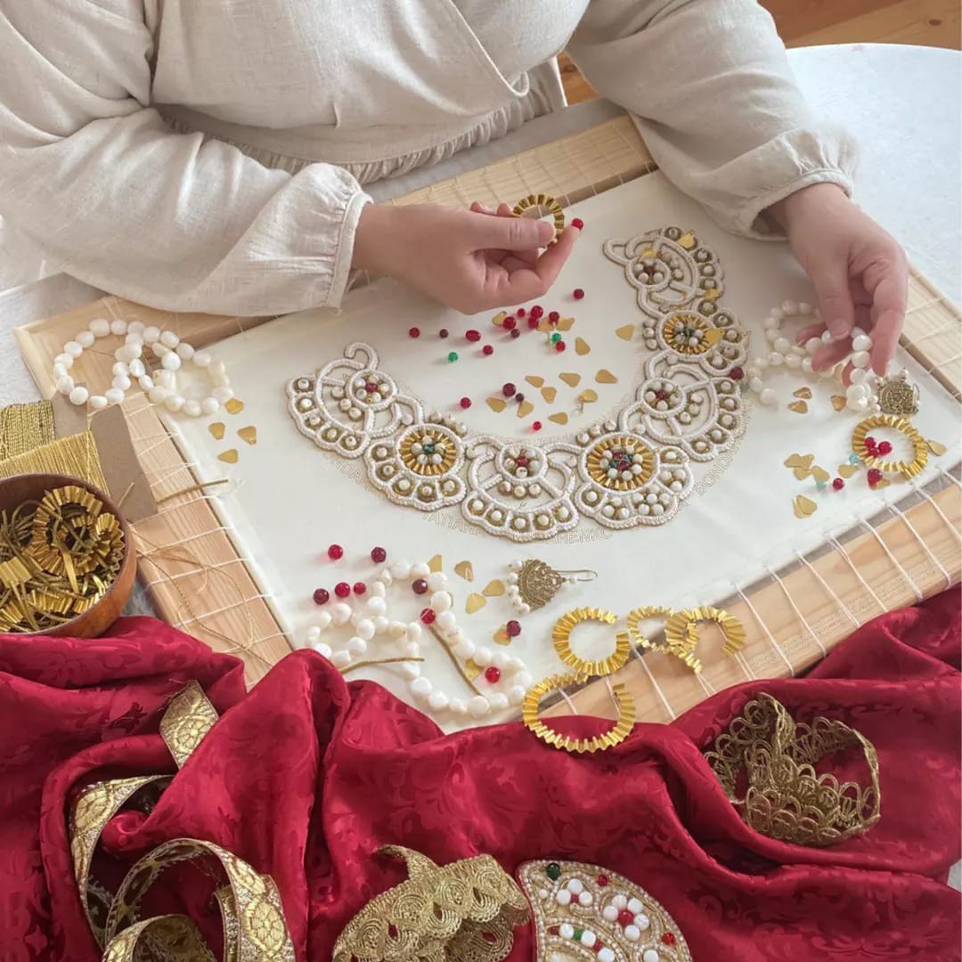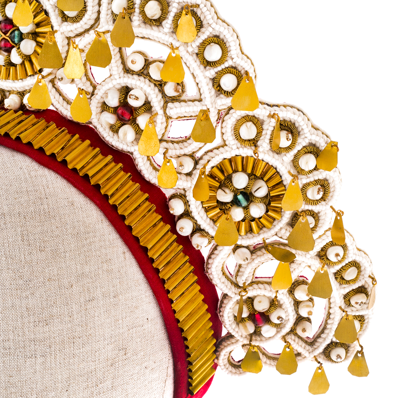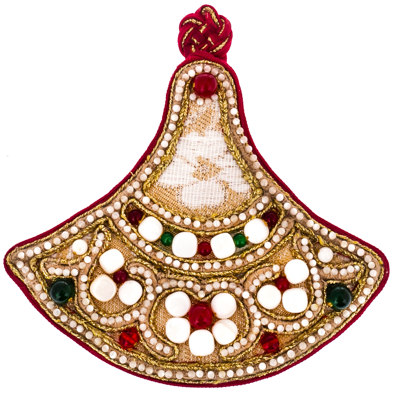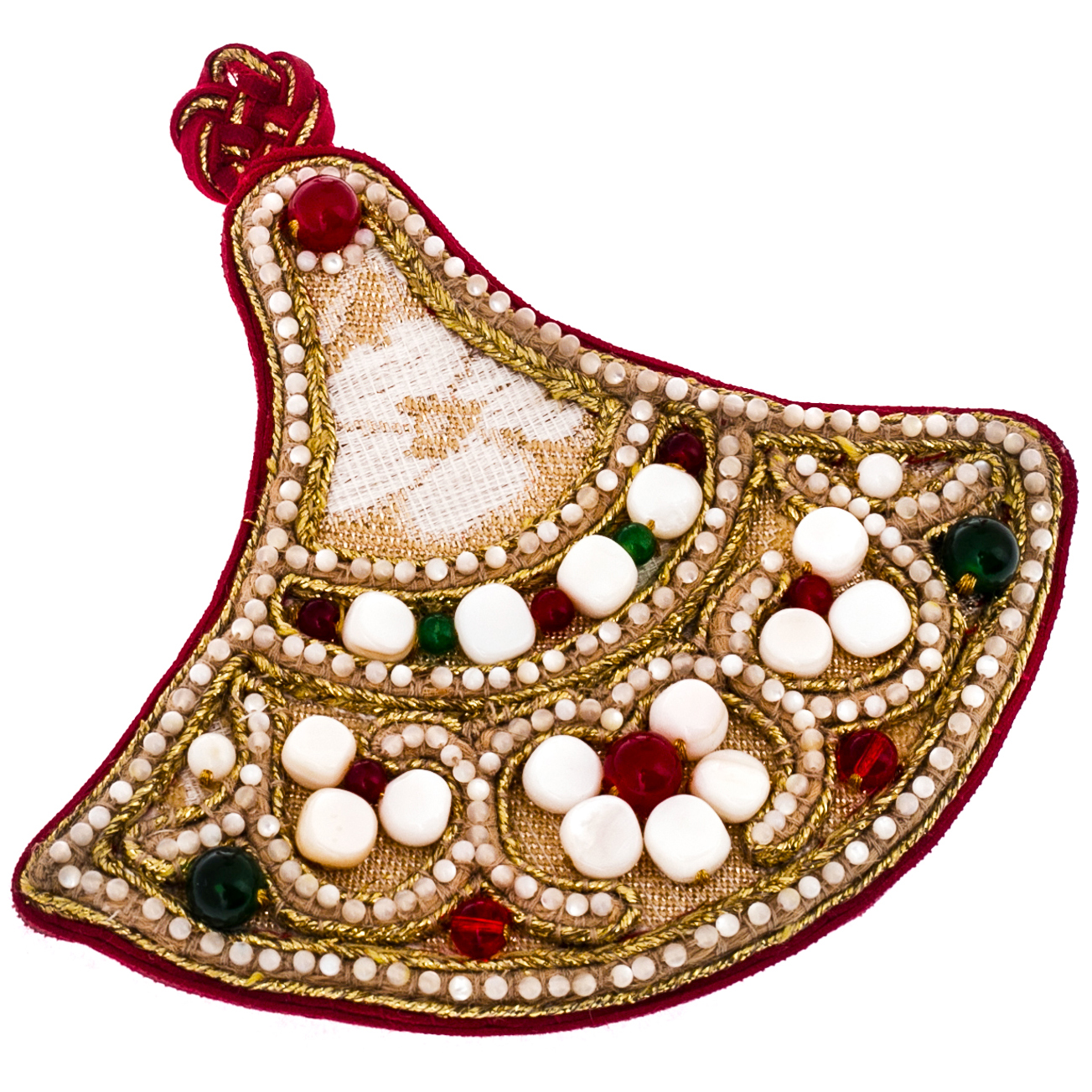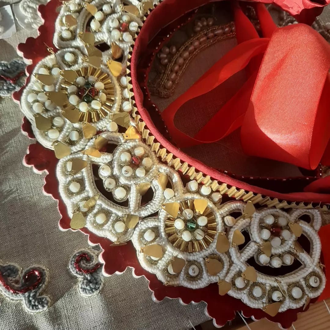 Материалы: антикварный перламутр, антикварный шнур, стеклянные бусины, трунцал, канитель, латунь, картон, лен, бель, бить.