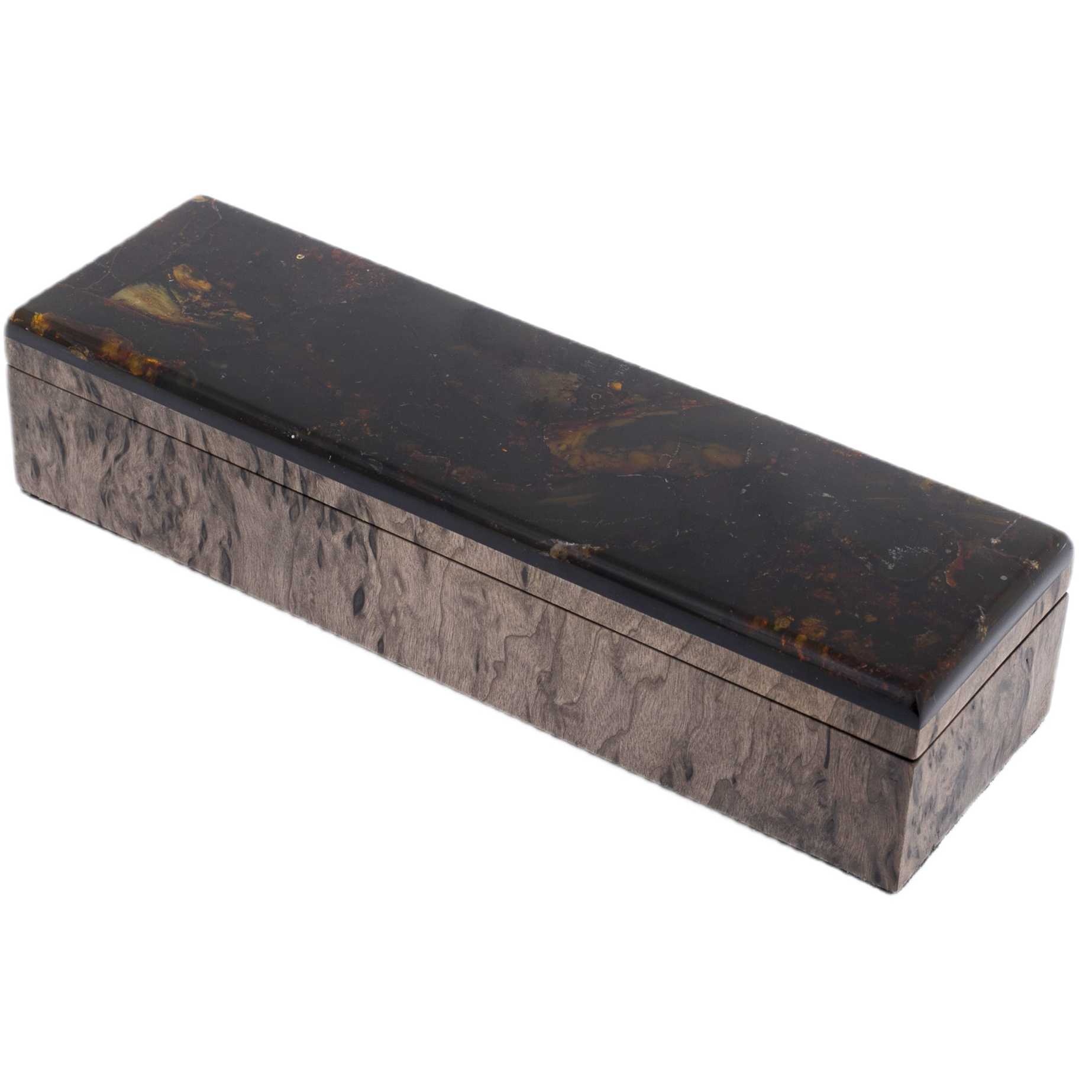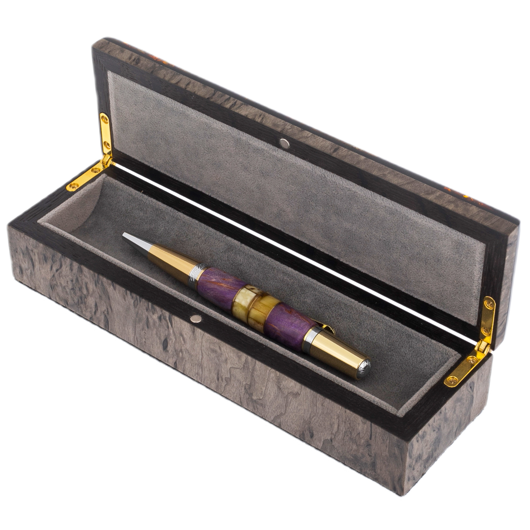 Ручка шариковая из карельской березы и янтаря "Цветок" фиолетовая, в футляре