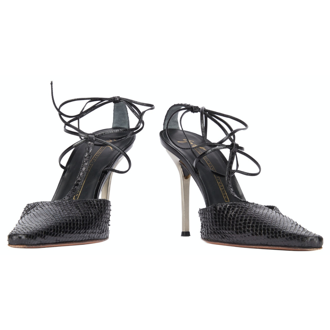 Каждая деталь несет в себе гениальность дизайна и искусство высокого мастерства. Черная кожа с тиснением под питона окутывает стопу, подобно доспехам, скрывающим хищную грацию. Острый мысок – это вызов, штрих, придающий образу подчеркнутую доминантность. Изящные переплетения тонких ремешков обвивают щиколотку, словно знаки привилегированного посвящения в закрытый мир высшего стиля. Тонкий металлический каблук – не просто элемент конструкции, а стержень, на котором держится совершенство, баланс между хрупкостью и несгибаемостью.