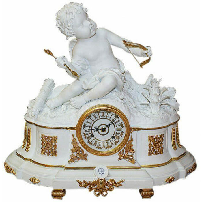 Основание корпуса выполнено из плотного фарфора безупречного обжига, украшенного ручной лепкой и позолоченными накладками, имитирующими античные гирлянды и акантовые листья. Циферблат, помещённый в золочёную раму, оформлен витиеватыми римскими цифрами и тонкими стрелками, плавно отсчитывающими бесконечно драгоценные секунды. Композиция уравновешена — ни один элемент не перетягивает внимание, всё собрано на едином изысканном дыхании.