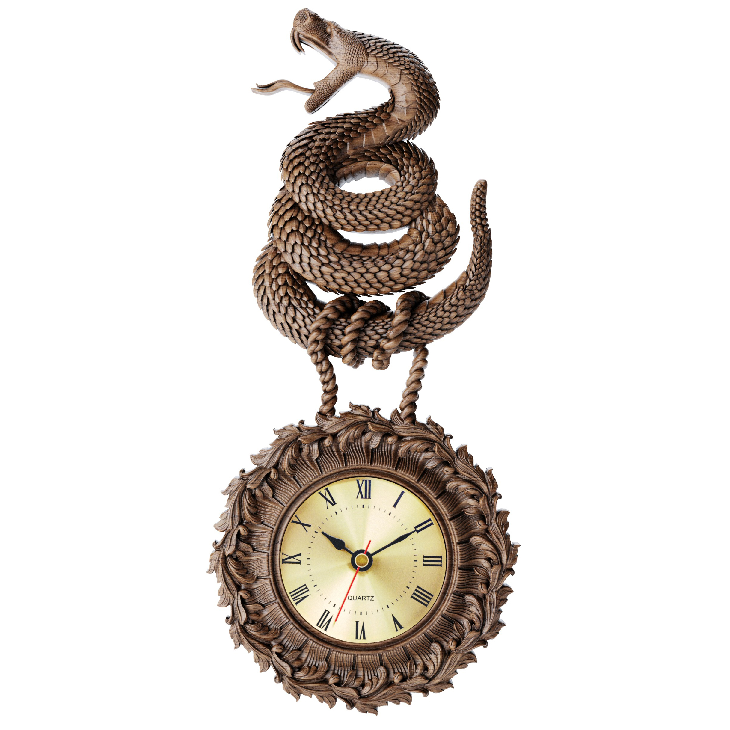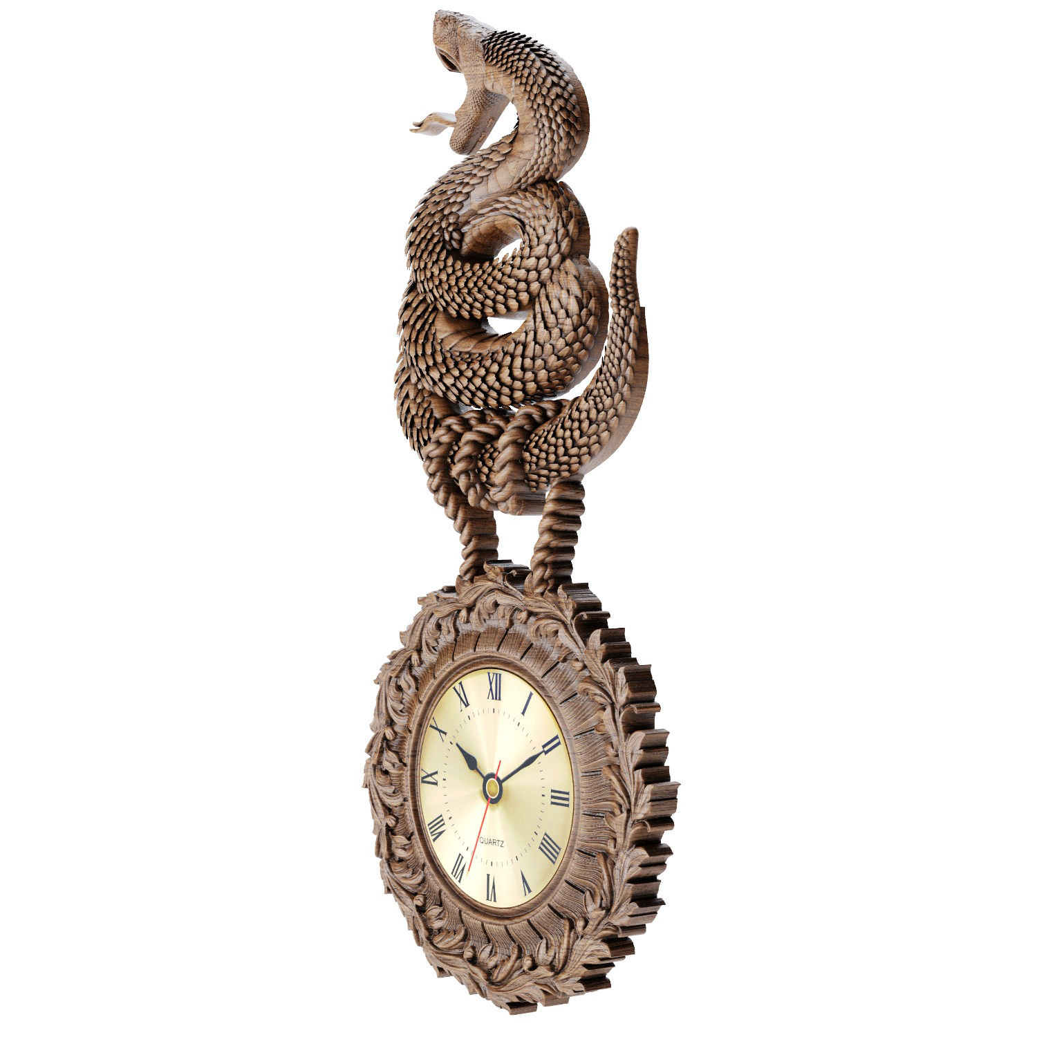 Массив бука, использованный для создания этих часов, отличается своей прочностью, долговечностью и уникальной текстурой, которая делает каждое изделие неповторимым. Детальная резьба передает все мелочи: от чешуи змеи до витков её тела, создавая ощущение живого движения. Корпус часов украшен изящным орнаментом, который гармонично дополняет композицию и делает её завершённой.