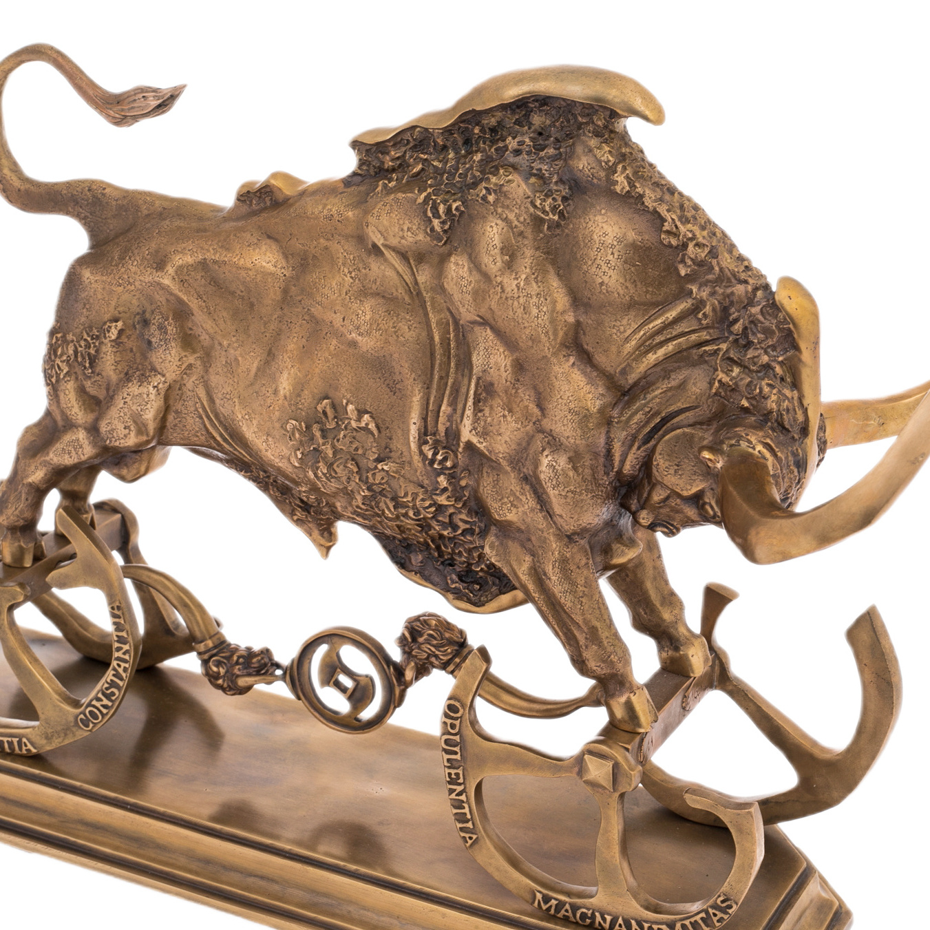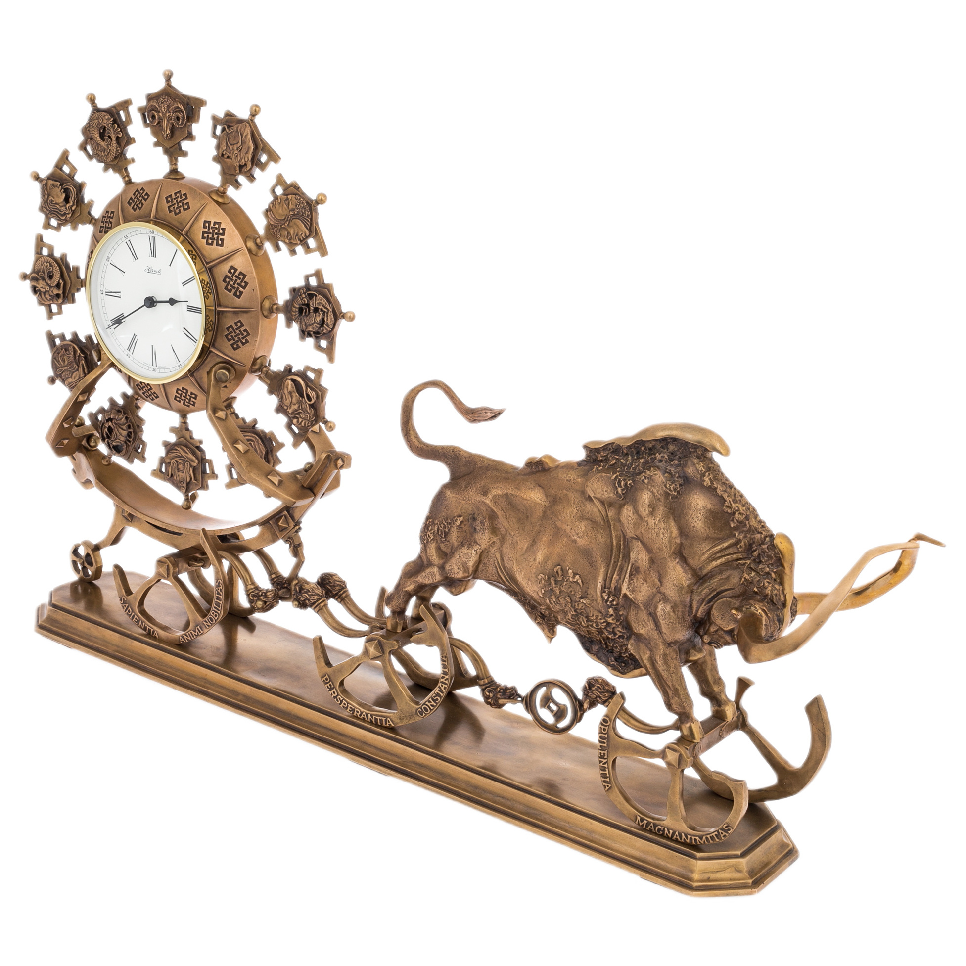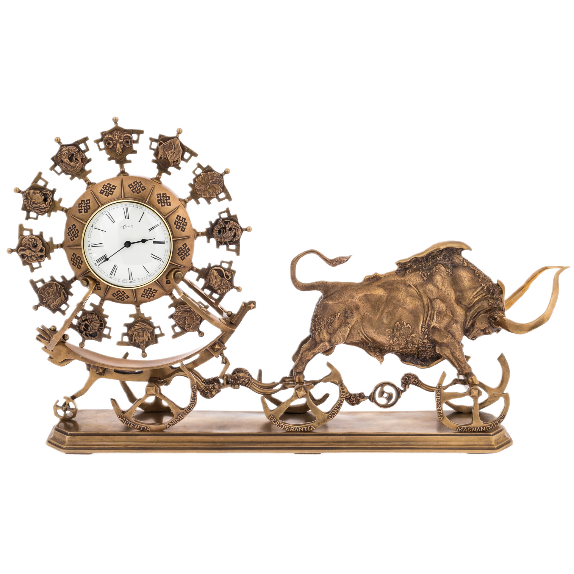 Авторская скульптура «Колесница Золотого Тельца» — это сложная философская метафора, воплощённая в бронзе. В основе композиции — могучий бык, тянущий колесницу, на которой возвышается циферблат часов. Образ быка с древности воспринимается как знак власти, силы, мужского начала и плодородия: в Древнем Египте он символизировал царственность, в мифах Греции — являлся воплощением Зевса, а в иудейской легенде — тем самым «золотым тельцом», ставшим символом поклонения богатству. В данной работе бык движется вперёд, влекомый идеей Солнца, центр которого формирует корону из двенадцати знаков Зодиака — полную символику Вселенной, где время неотделимо от судьбы.