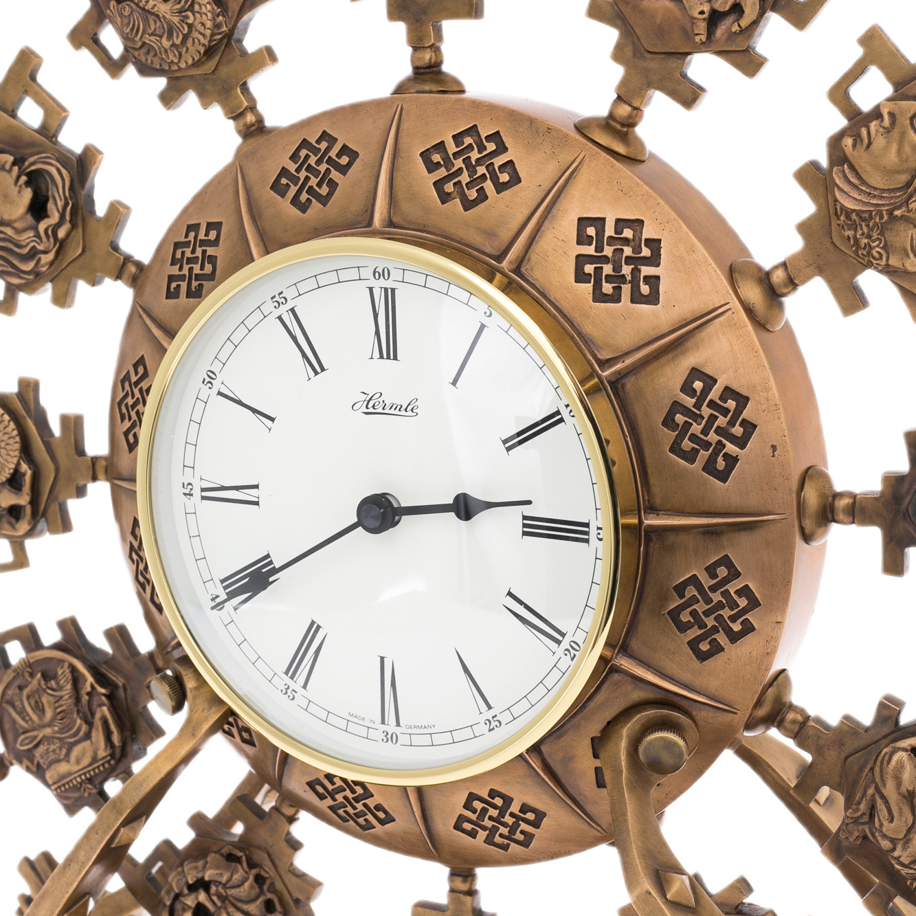 Часы в центре композиции неслучайны: каждый знак Зодиака — словно шестерёнка в механизме мироздания, вращающая Время. Подковы под опорой колесницы — знак счастья и удачи, а латинская надпись «SOL RADIAT OMNIBUS» — «Солнце светит всем» — подчёркивает универсальность света и истины. Колёса, на которых покоится композиция, несут на себе девизы: «FORTUNA», «PROSPERITAS», «SAPIENTIA», «ANIMI NOBILITAS» и другие — отражая вечные ценности: упорство, силу, богатство, мудрость, славу и благородство. Эти слова не просто декор, а путь, по которому движется символическая колесница человеческой жизни и воли.
