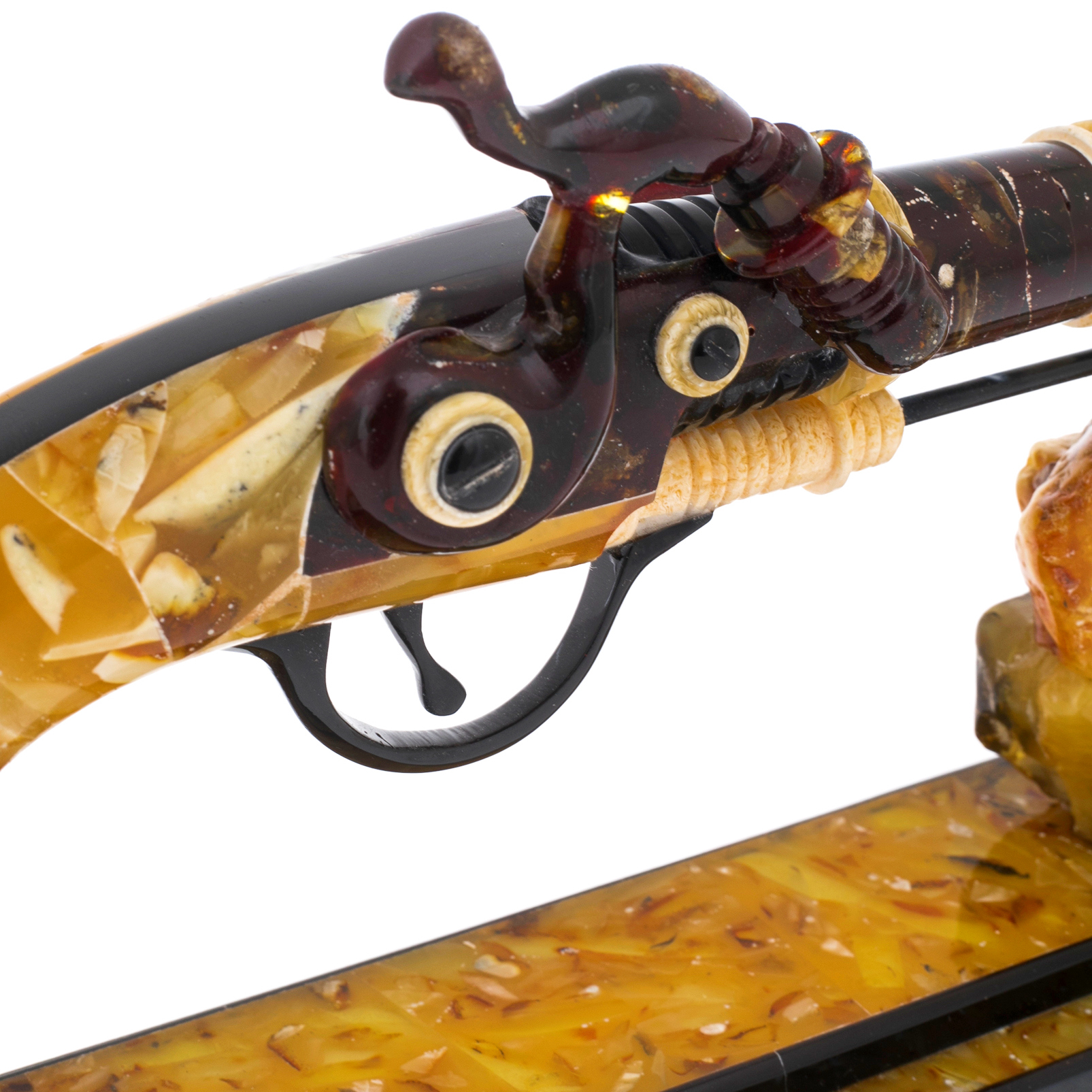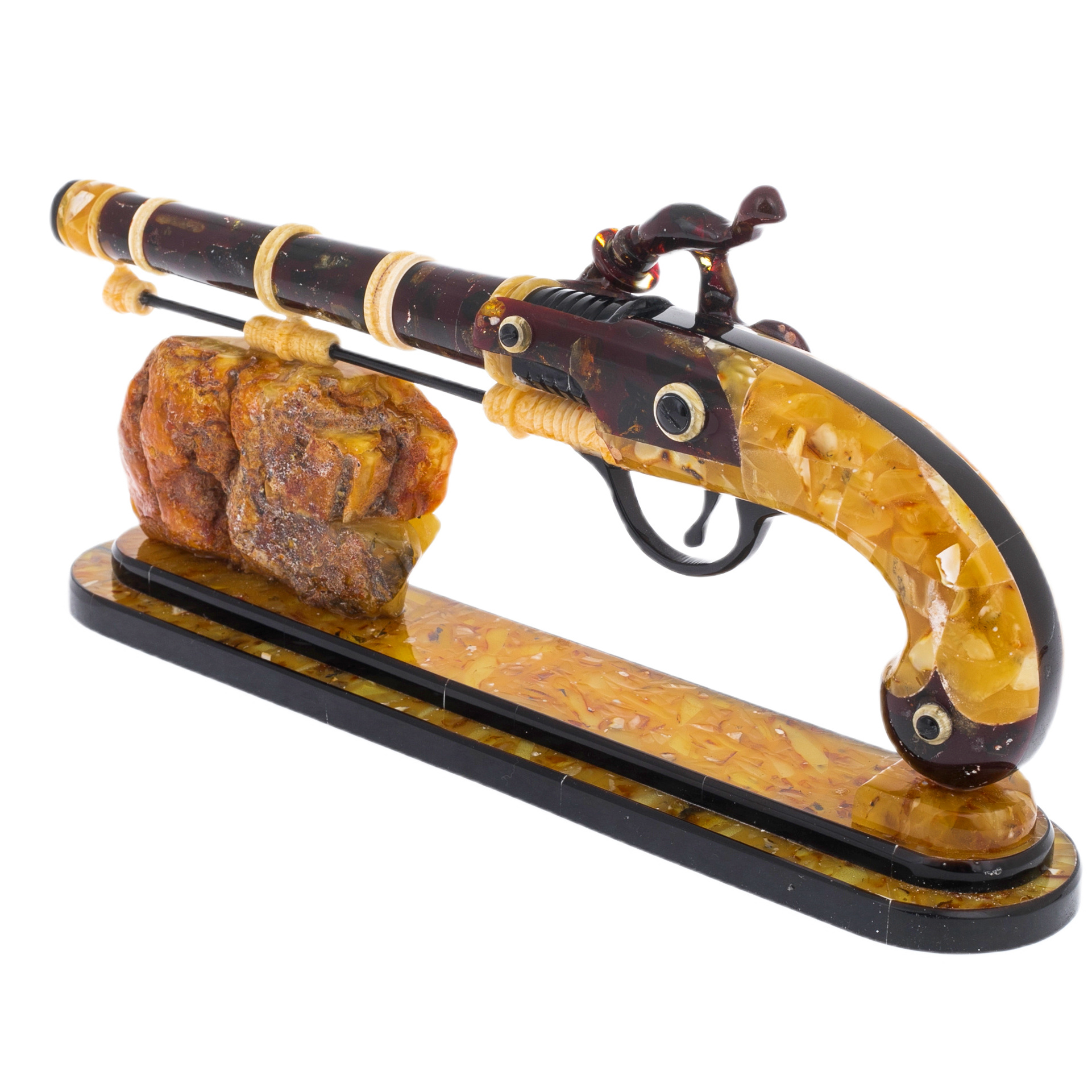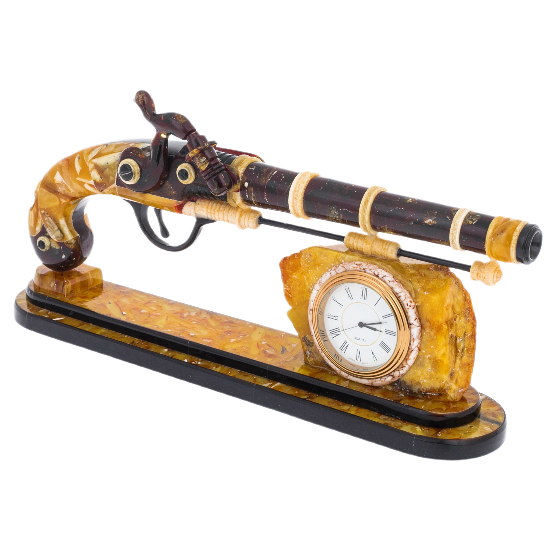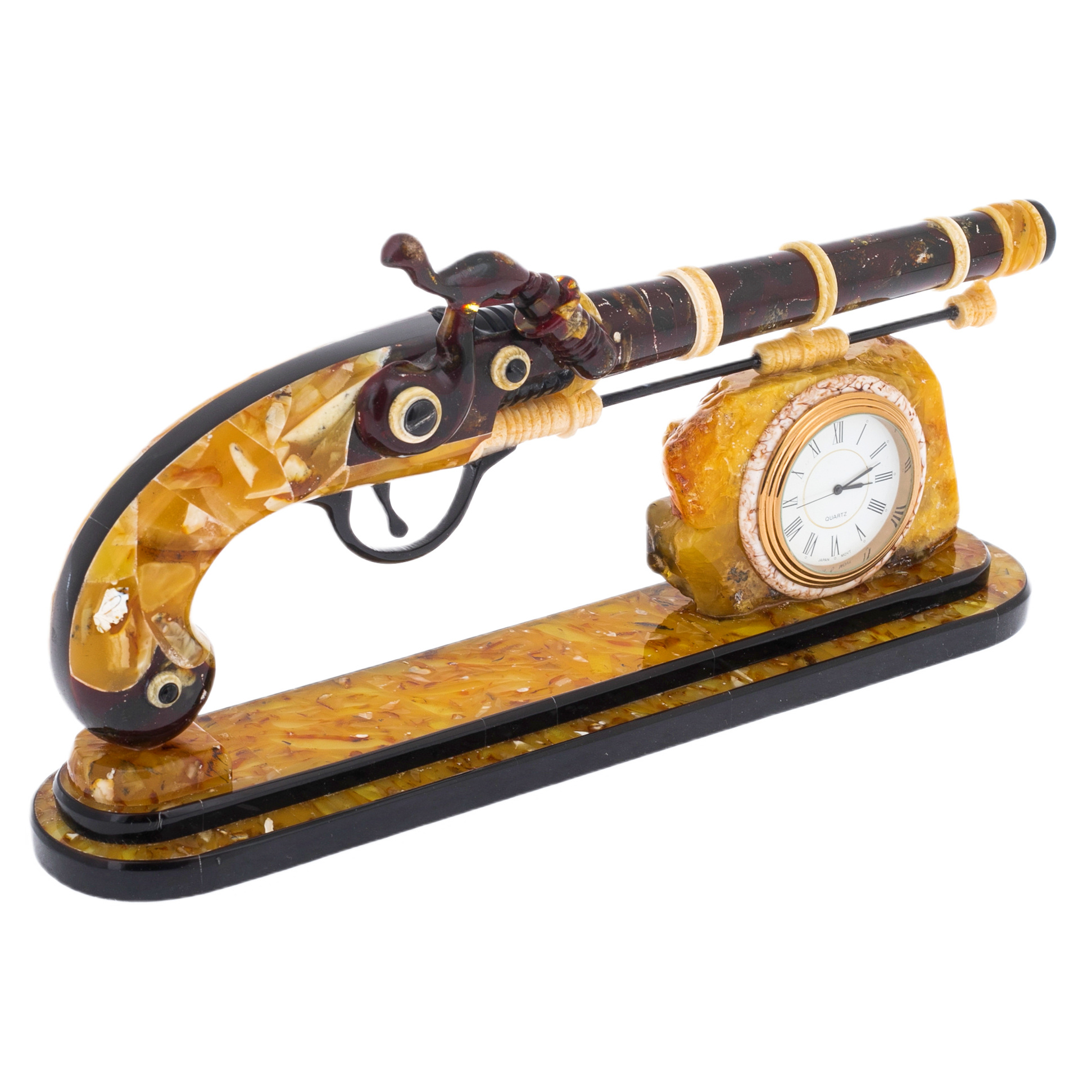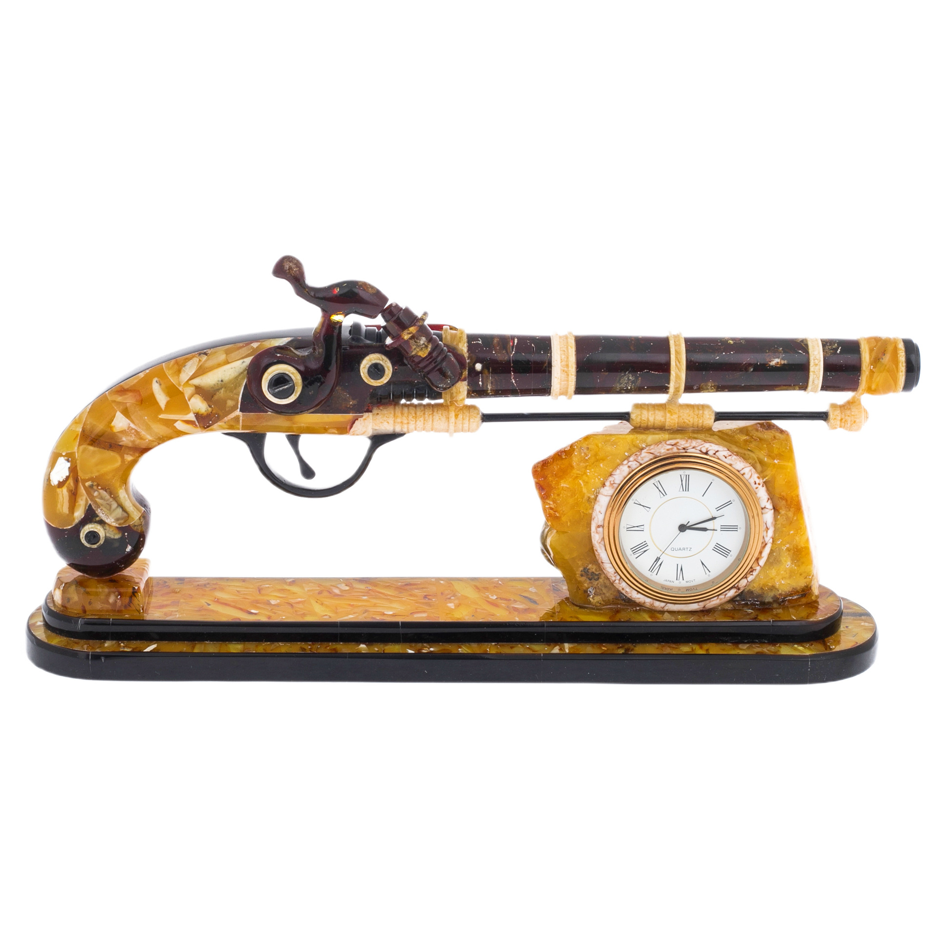 Часы в форме пистолета, выполненные с особым вниманием к деталям, становятся воплощением не только силы, но и изысканности. Барельеф из янтаря и тщательно проработанный ствол пистолета сливаются в гармоничное единство, наполняя этот арт-объект мощным символизмом. Прекрасно переданные детали, так же, как и его изысканная форма, напоминают о былой роскоши и смелости, но теперь они не несут в себе угрозы — лишь созидательную силу и величие.