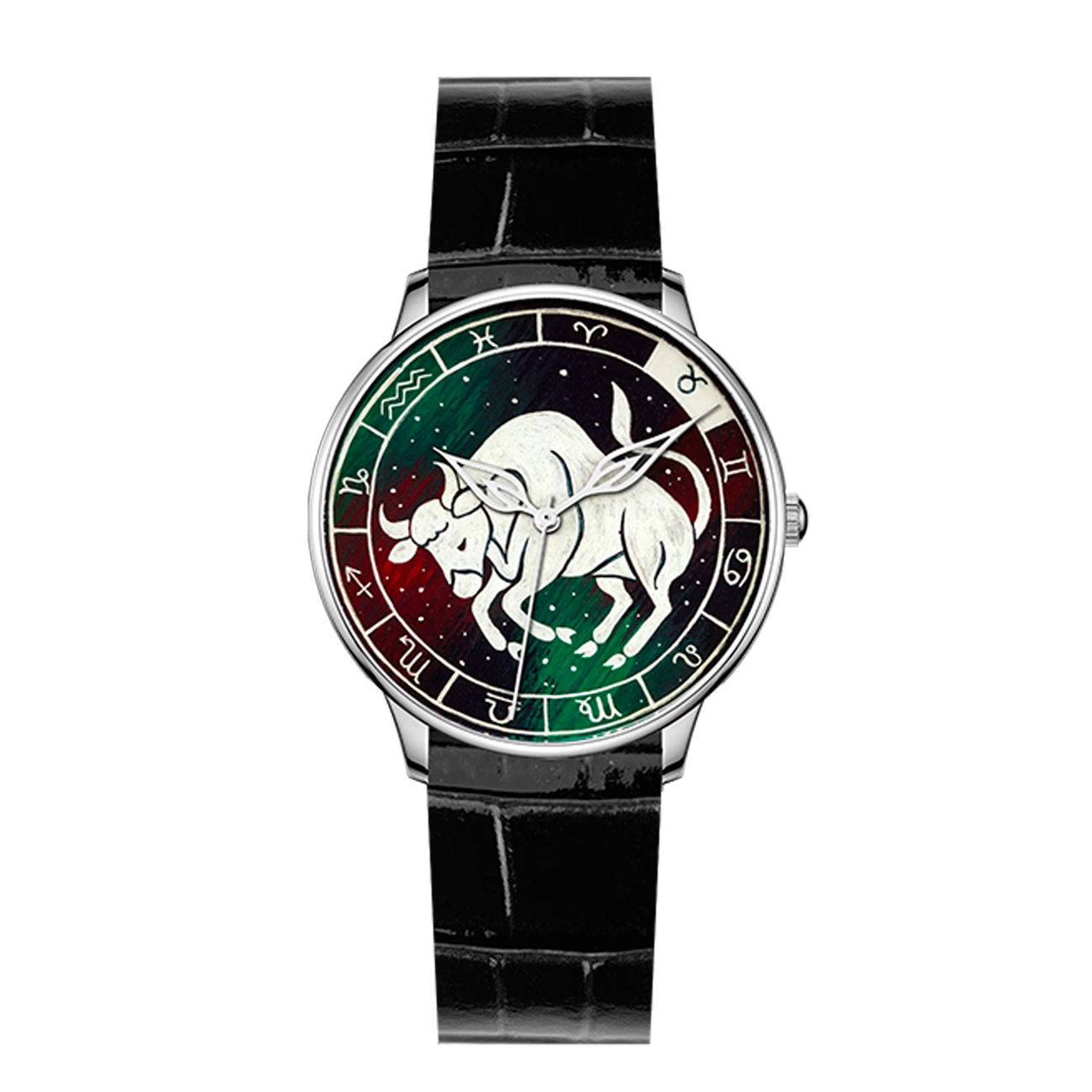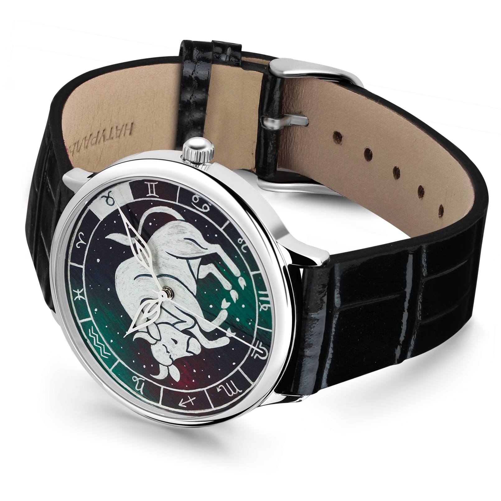 Наручные кварцевые часы Lincor "ART Знаки зодиака - Телец" серебристые с черным ремешком