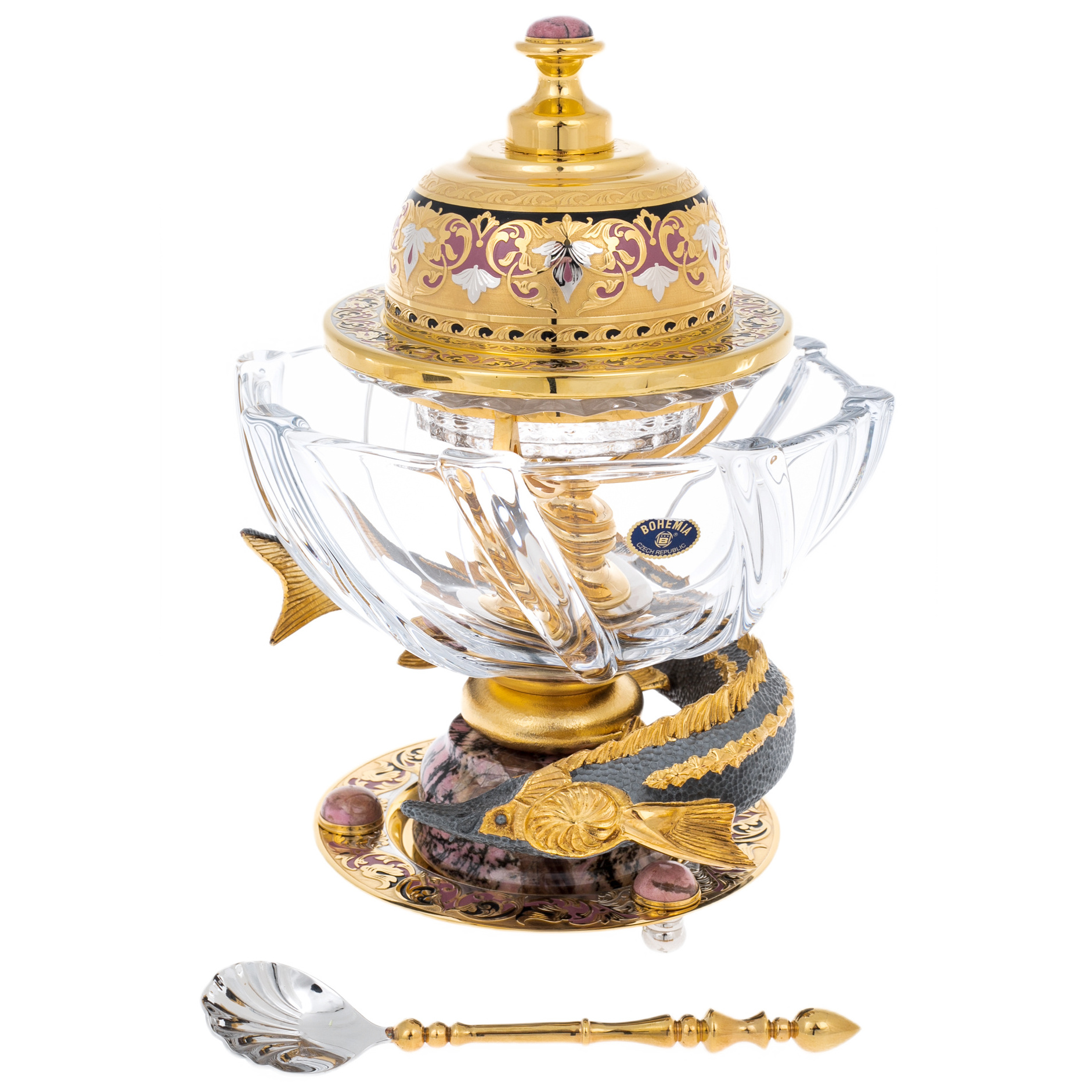 Икорница «Посейдон» представляет собой парадный сервировочный объект, созданный в лучших традициях Златоуста и ориентированный на ценителей гастрономического ритуала в его высшей, почти церемониальной форме. Кристальная чаша, сияющая глубокими гранями, поднимается над авторской подставкой из родонита — камня с выразимой природной структурой и редкой розово-чёрной палитрой. Верх завершается золочёным куполом, украшенным филигранными узорами с розовыми инкрустациями, а сопутствующая ложечка повторяет общее художественное решение, создавая завершённый ансамбль для подачи ценных сортов икры.