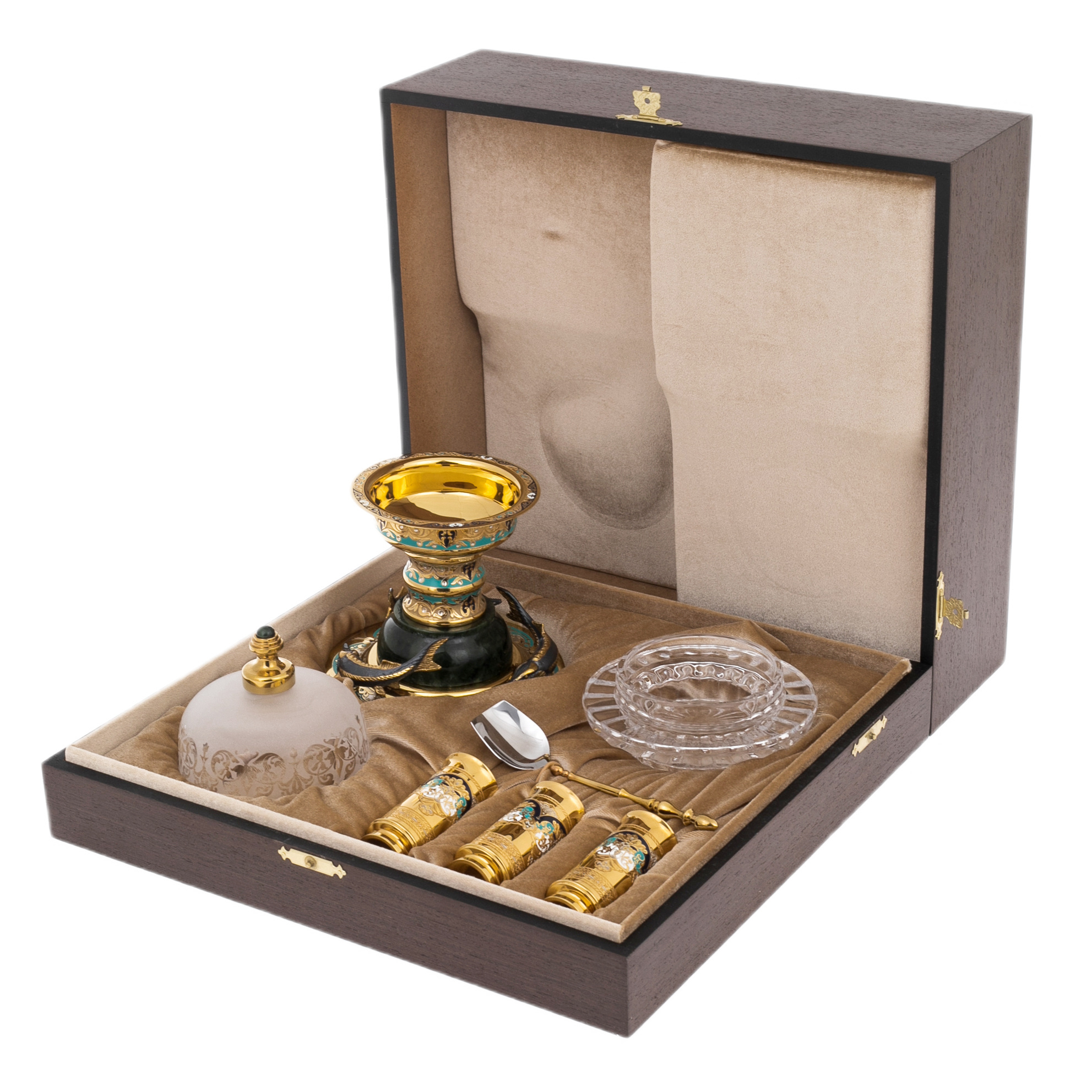 Комплектация: икорница с крышкой, 3 стопки, ложечка.