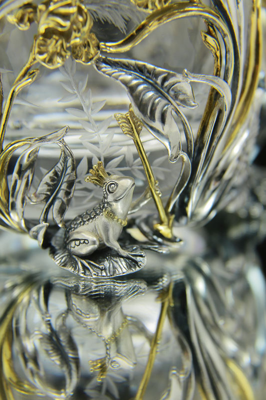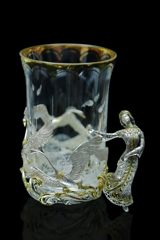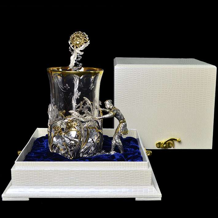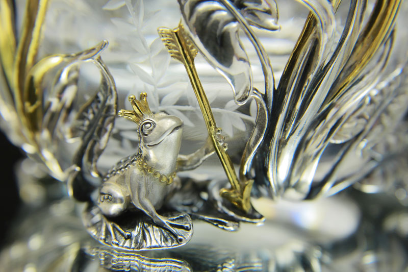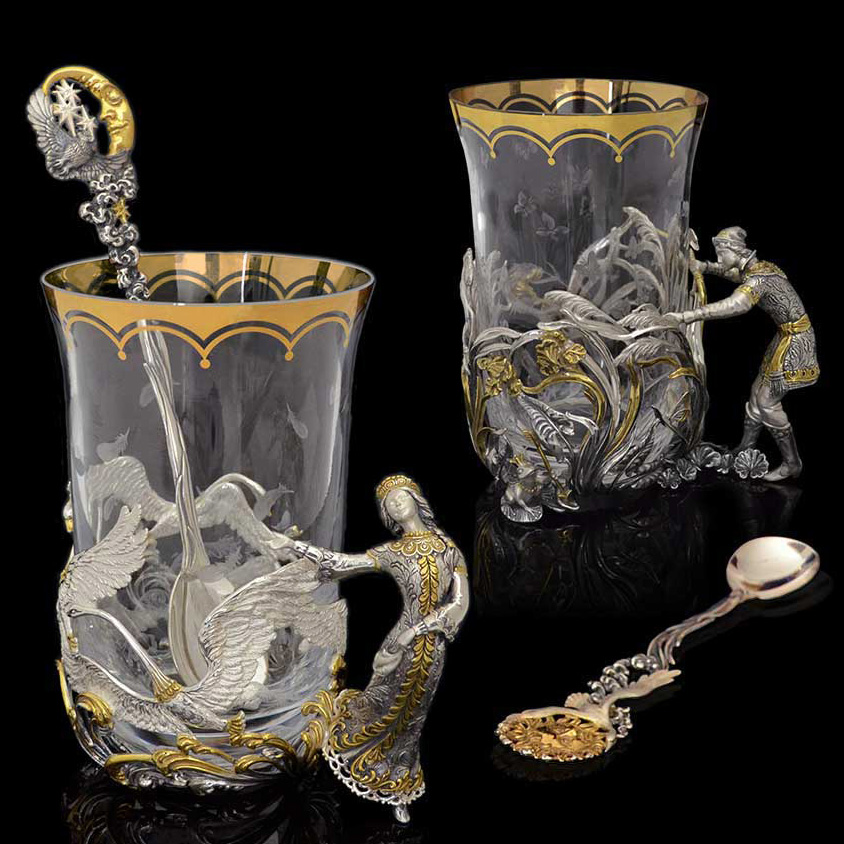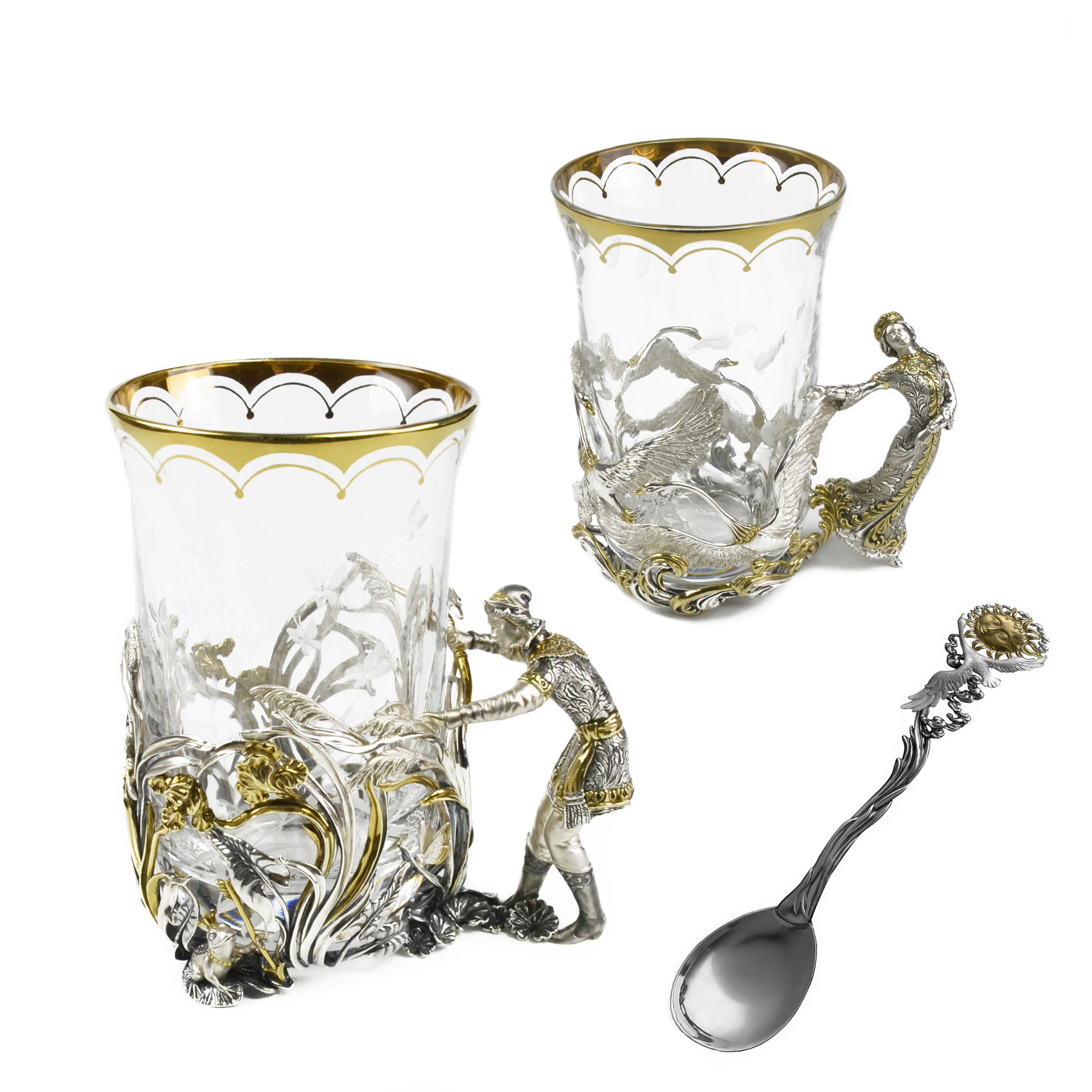 Коллекция чайных чашек из серебра "Царевна лягушка" на 2 персоны, с ложками