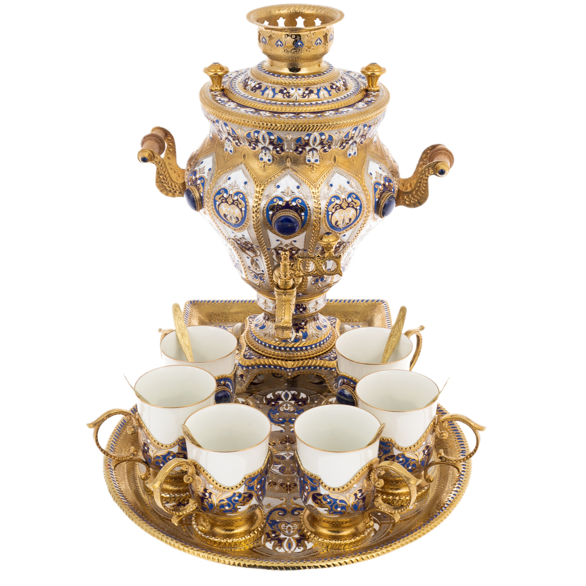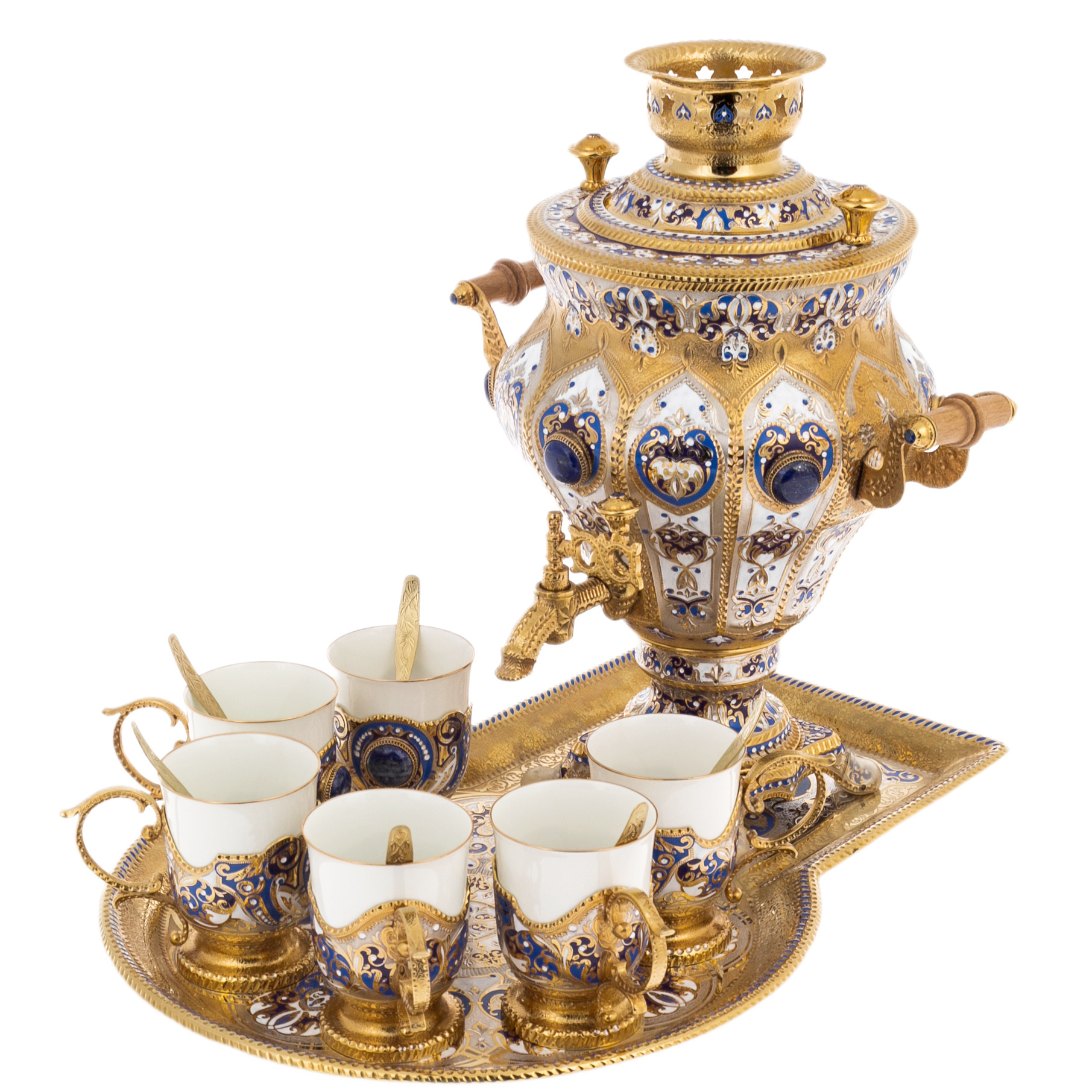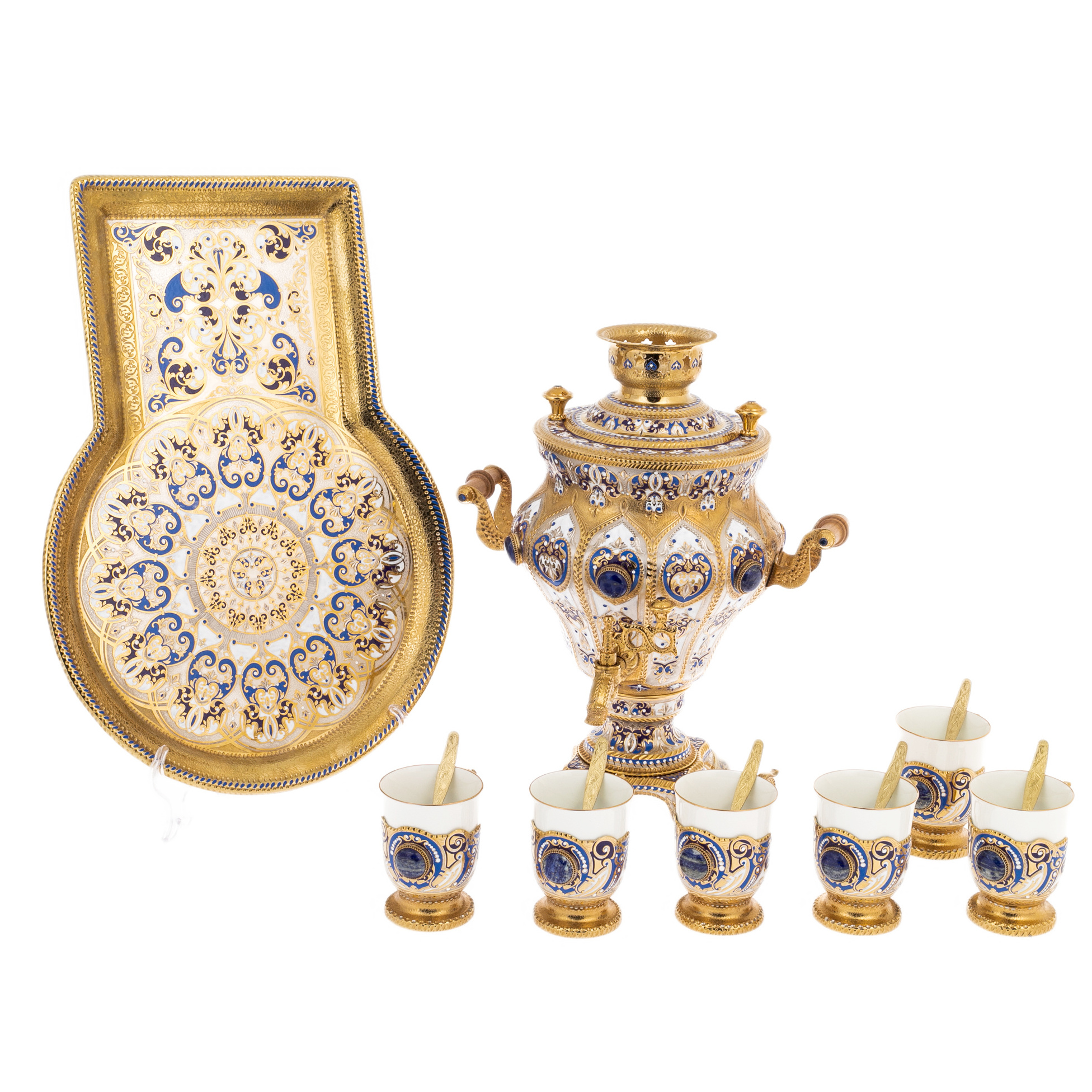 Чайный набор с лазуритом "Самоварный домик" на 6 персон, 14 предметов, Златоуст