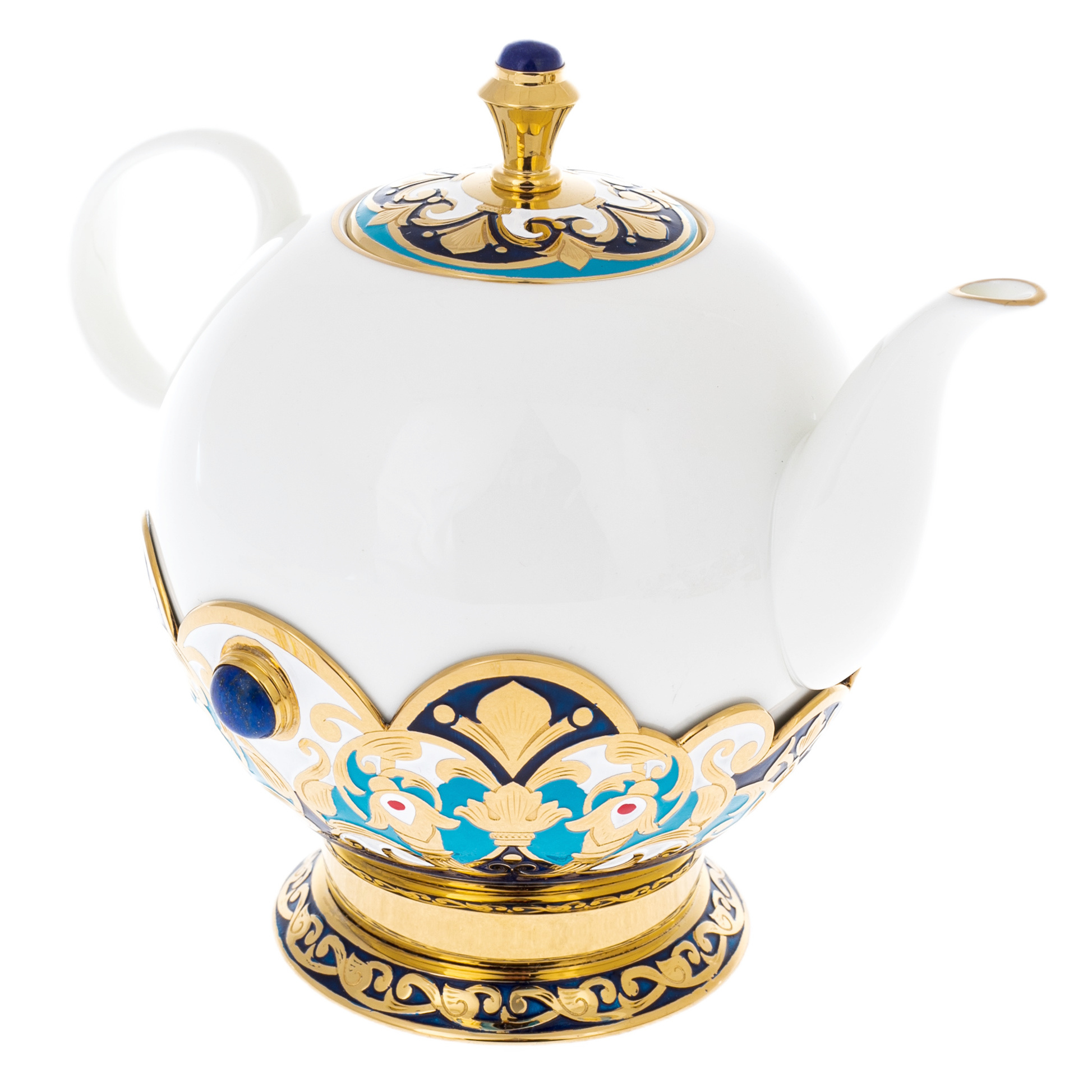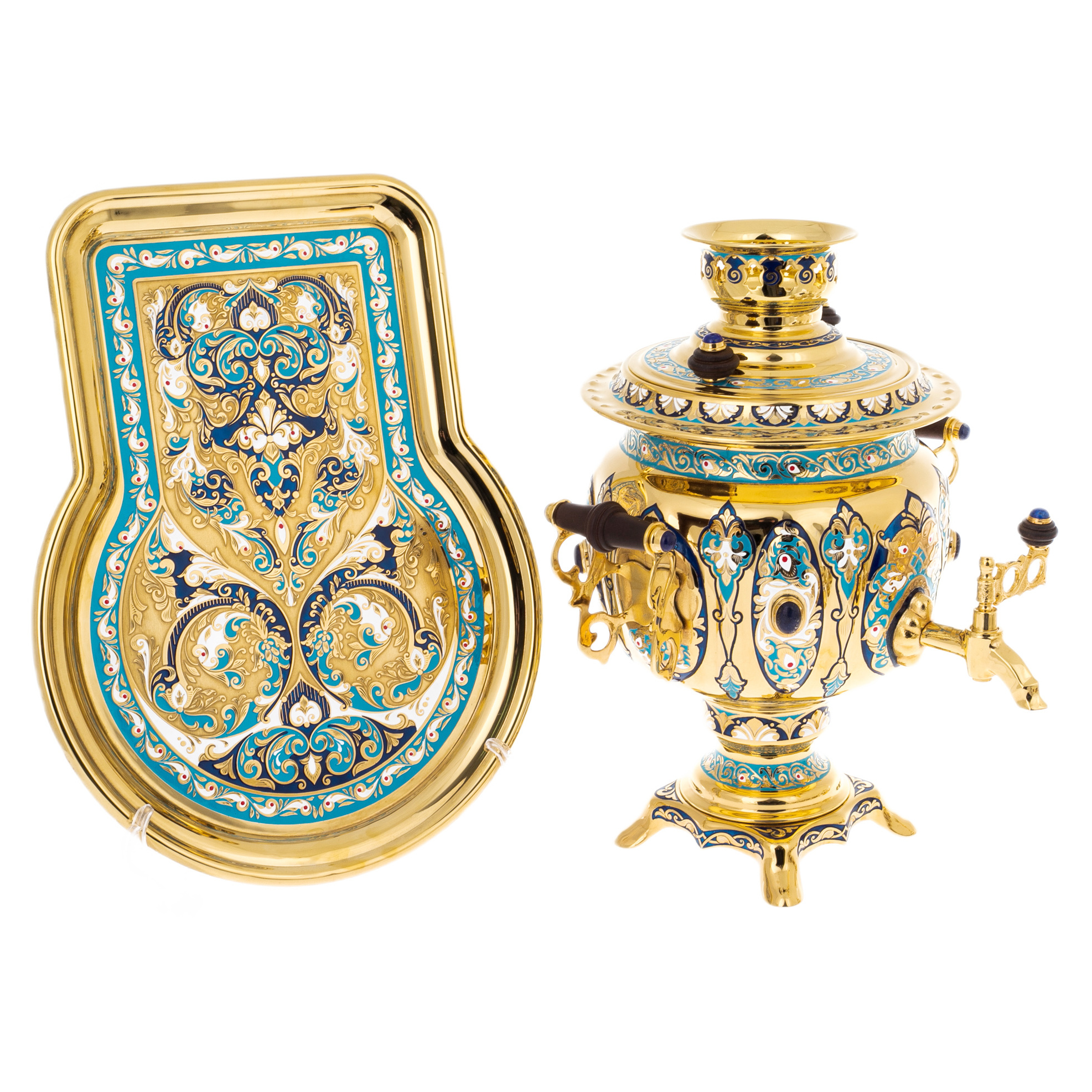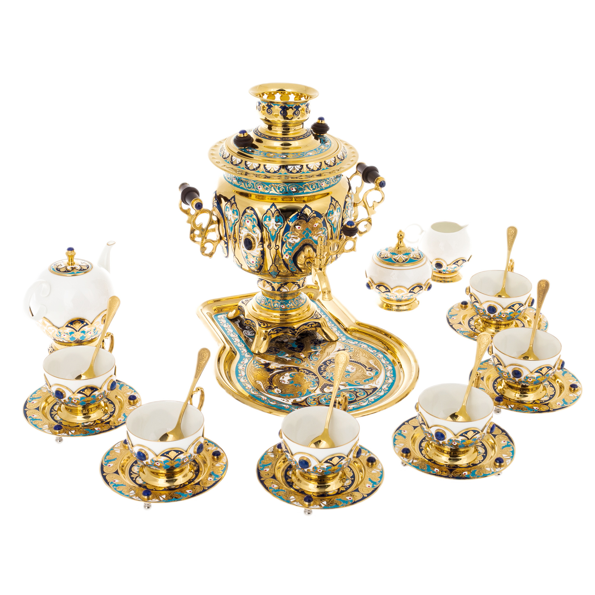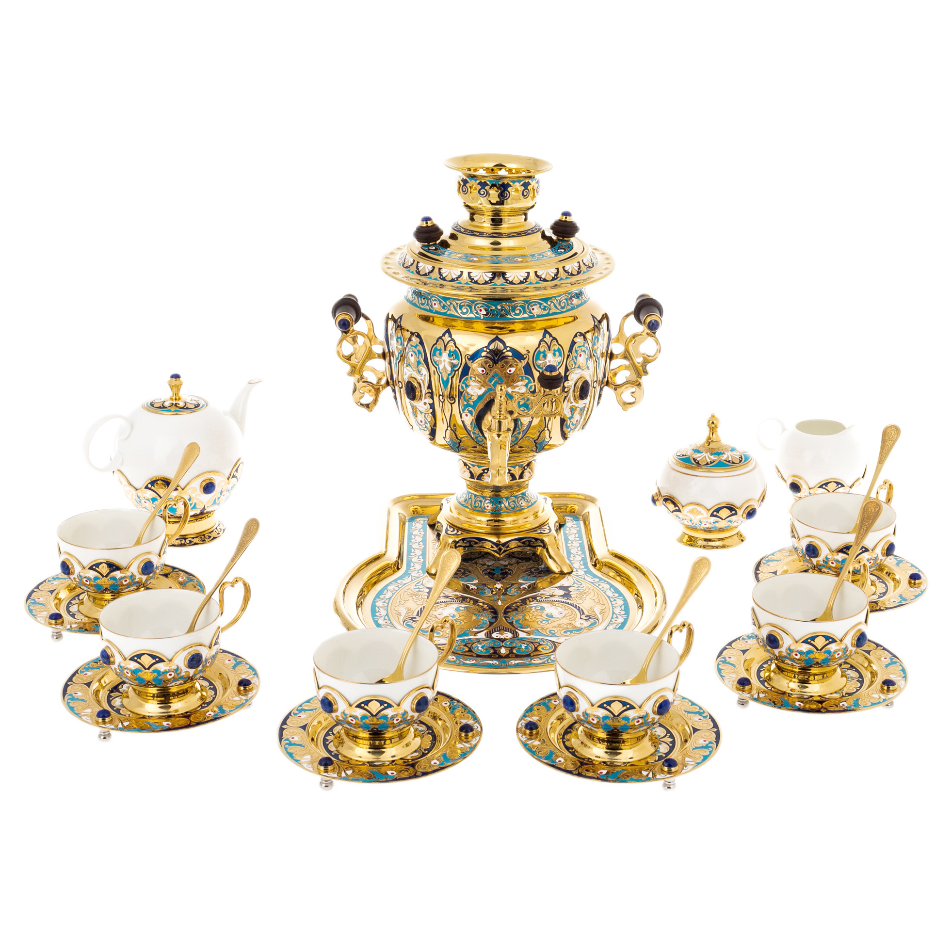 Чайный набор с самоваром "Гжель" с лазуритом и эмалью, на 6 персон, Златоуст