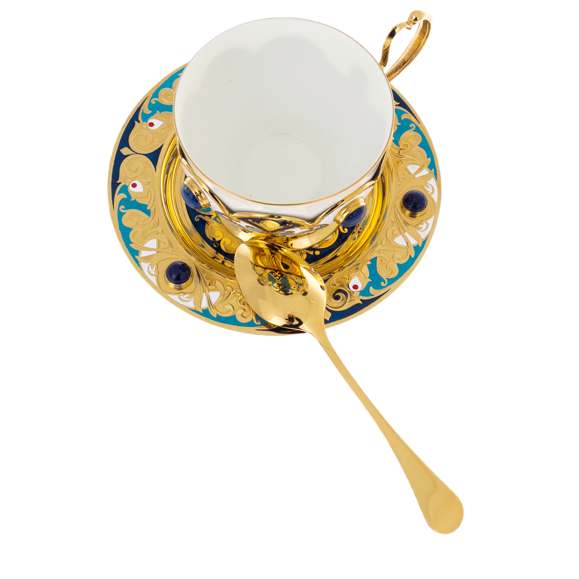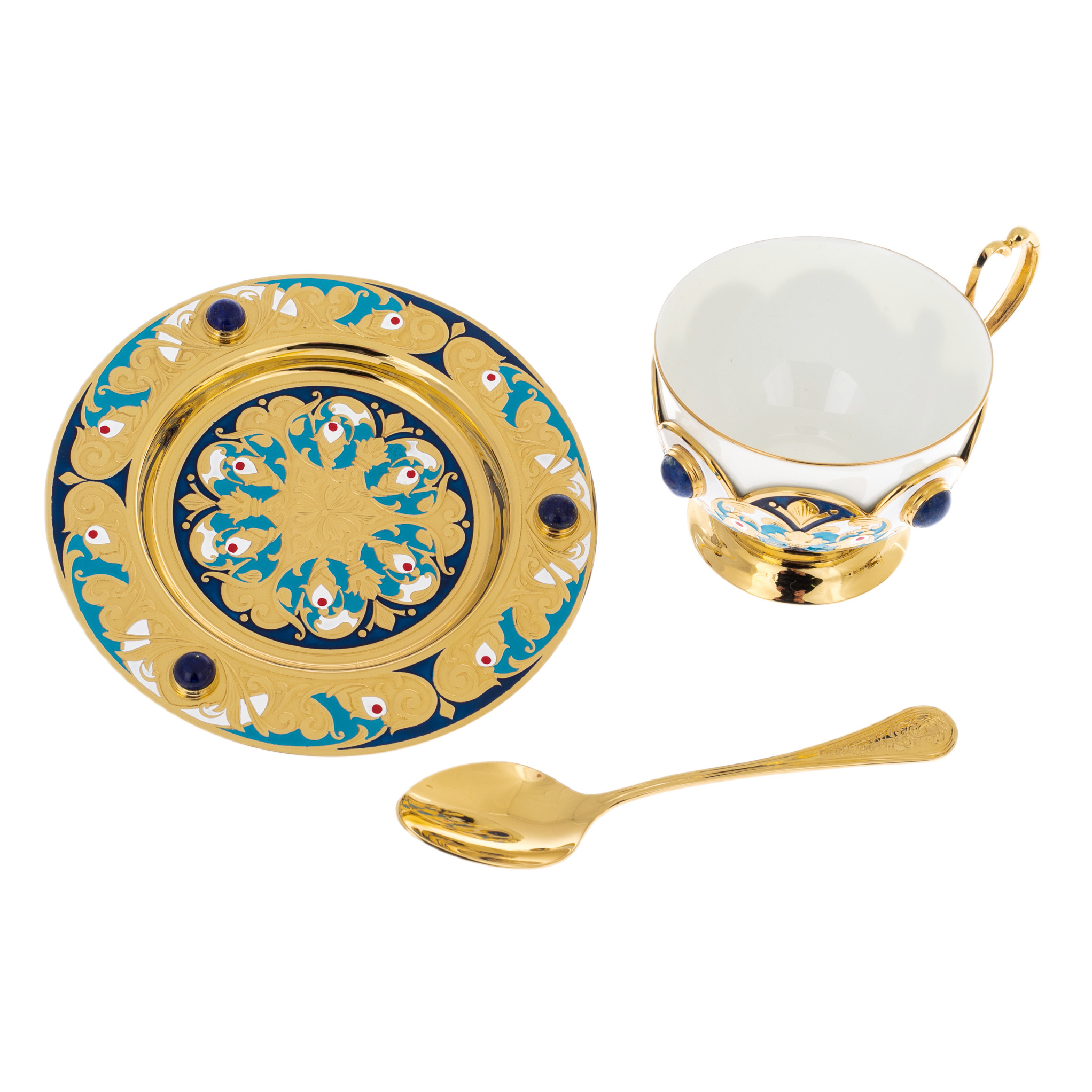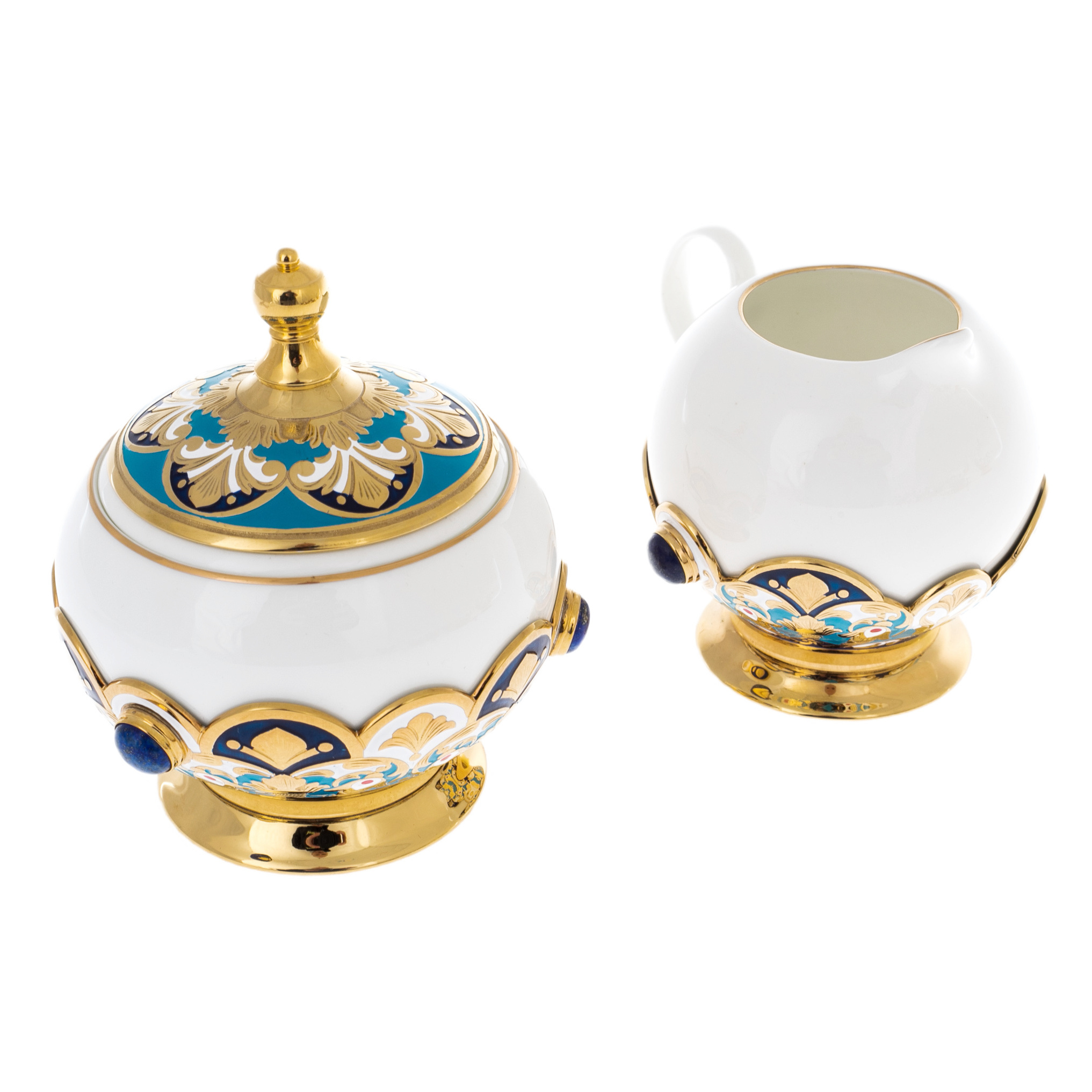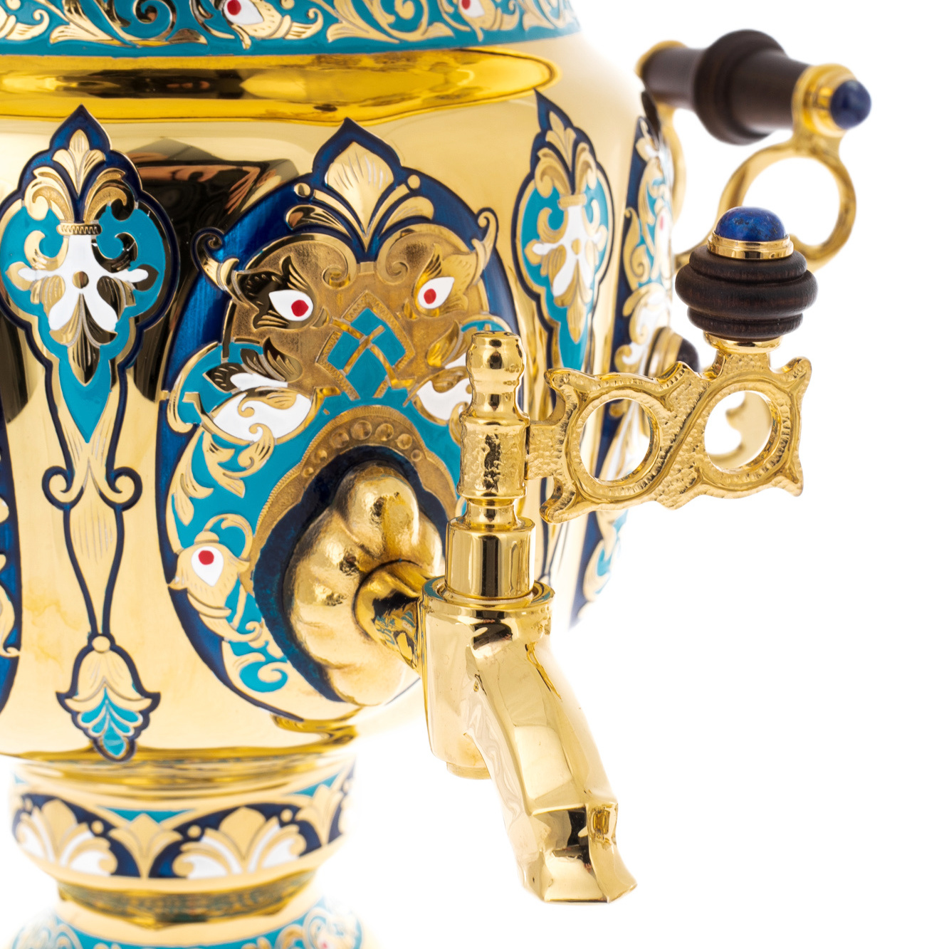 Чайный набор с самоваром "Гжель" с лазуритом и эмалью, на 6 персон, Златоуст