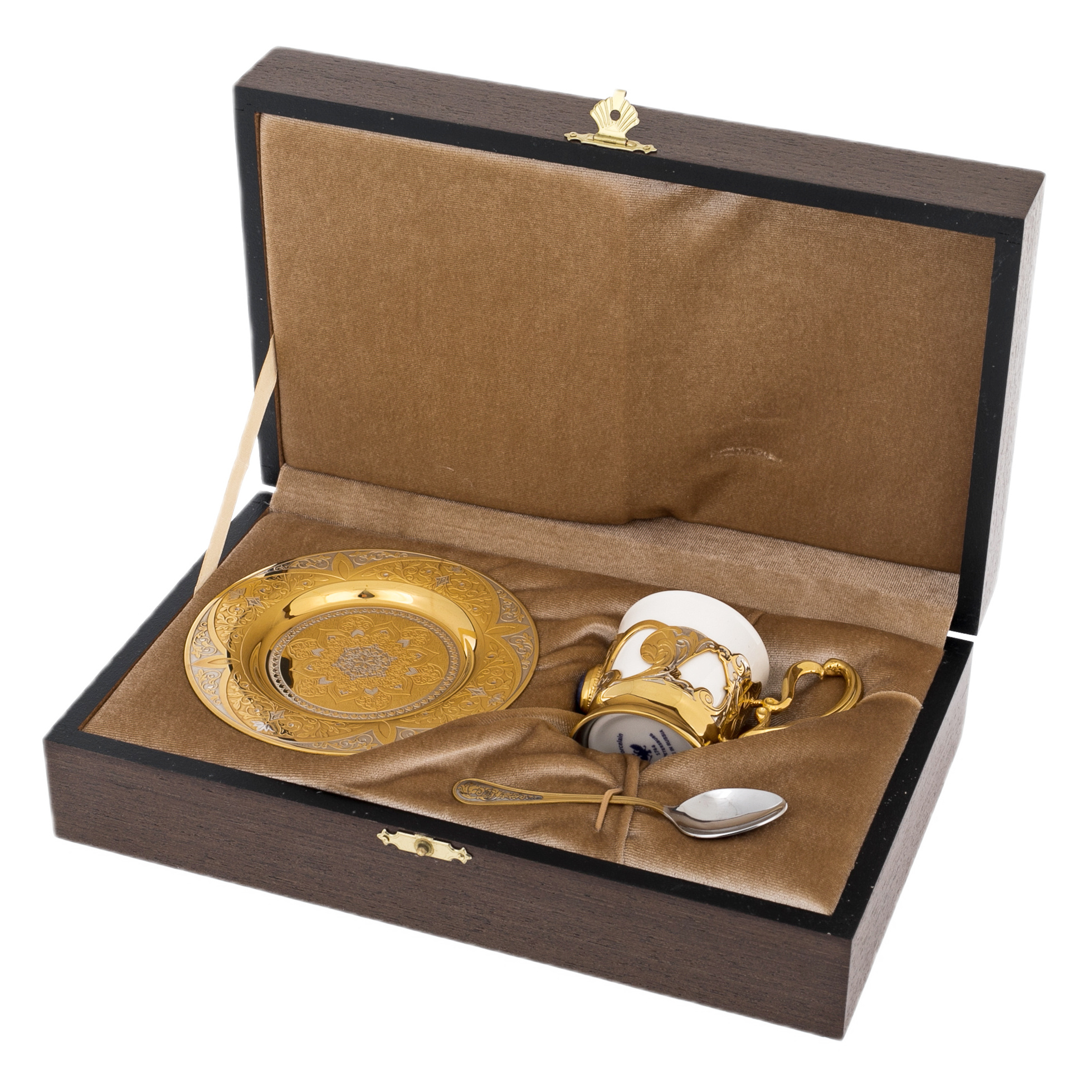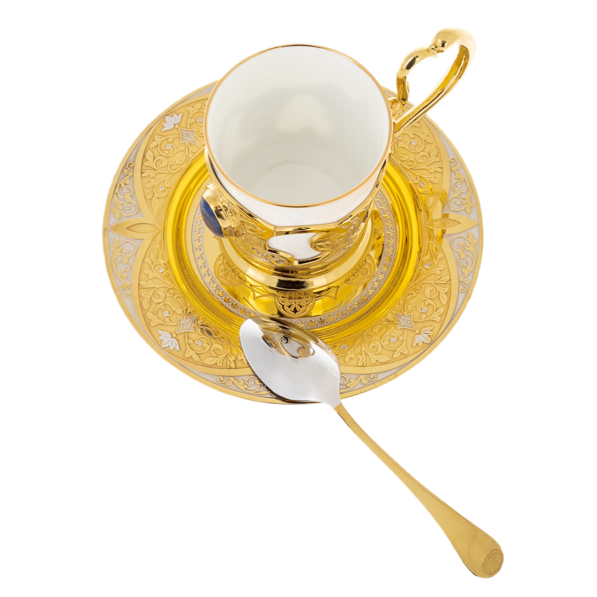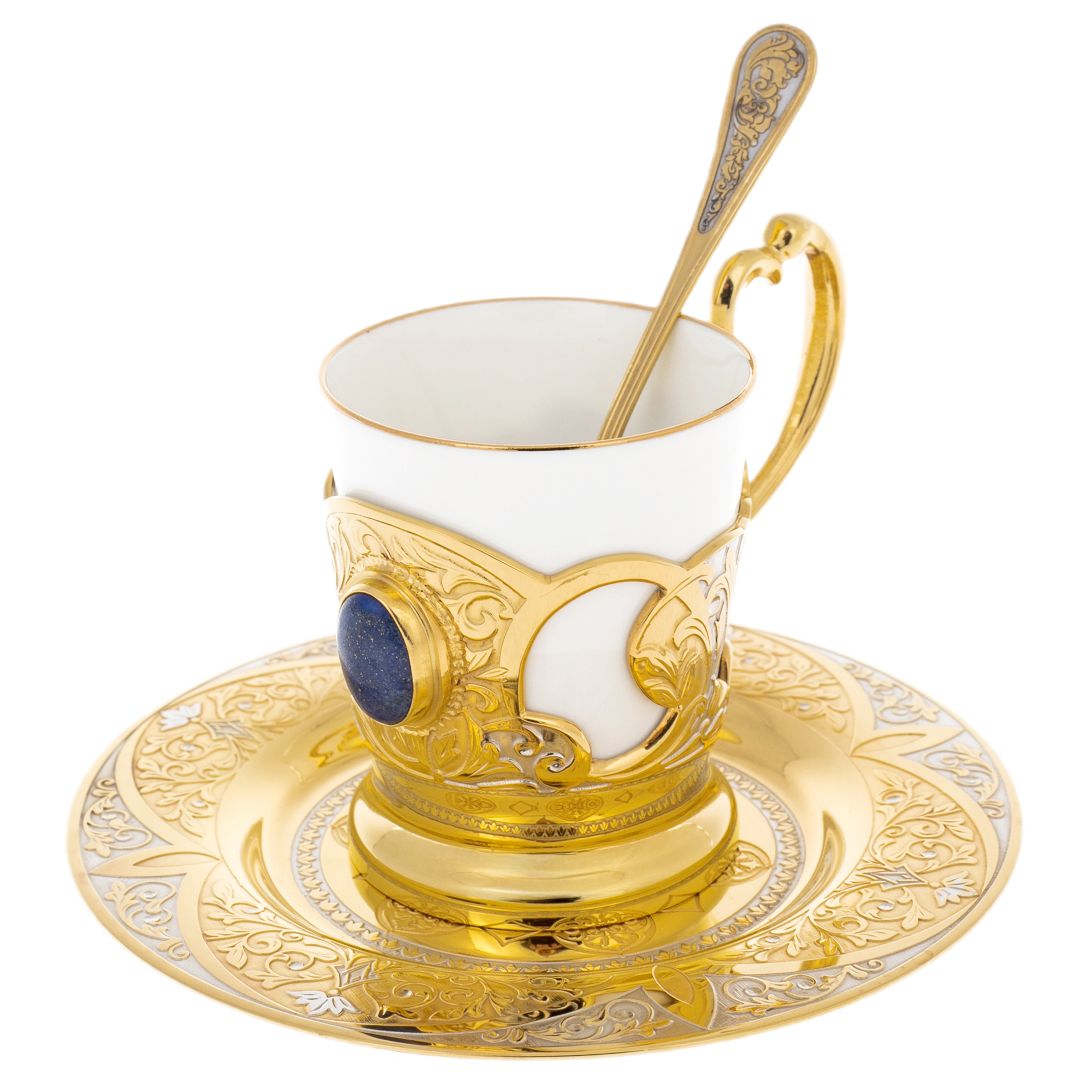 Этот набор — не просто функциональный элемент для кофепития, а предмет, который превращает каждую трапезу в утончённый ритуал. Лазуритовые акценты добавляют глубины и благородства, подчёркивая исключительность вашего выбора. Каждое прикосновение к этому набору напоминает о силе времени и традиций, которые невозможно повторить. Такие изделия достойны того, чтобы передаваться из поколения в поколение, становясь фамильной реликвией, хранящейся в доме истинных ценителей искусства.