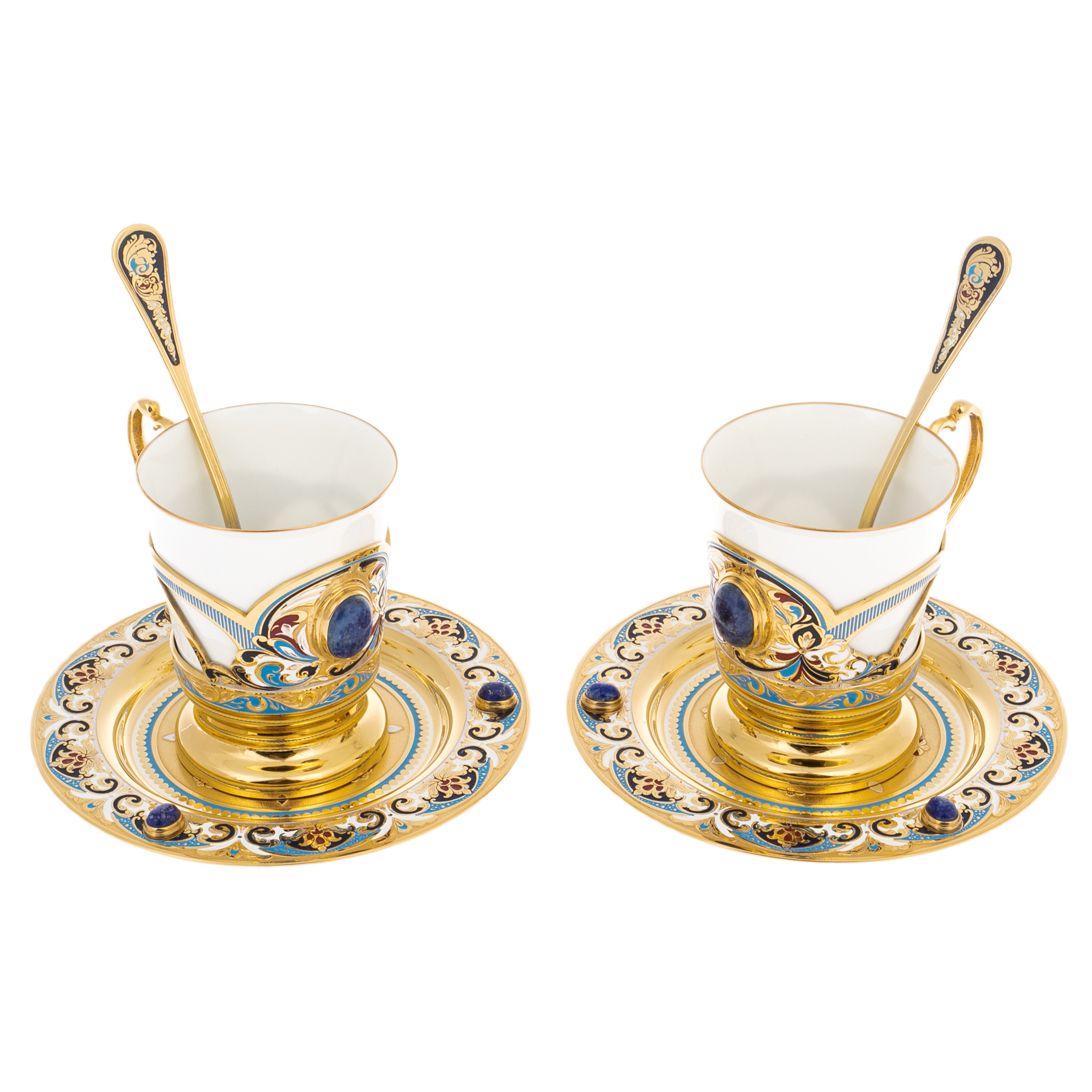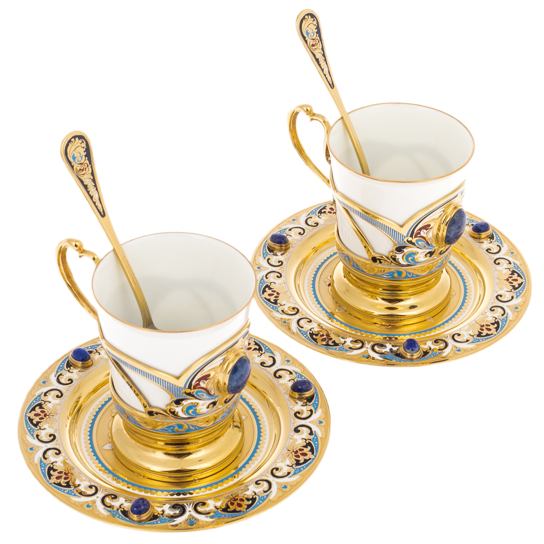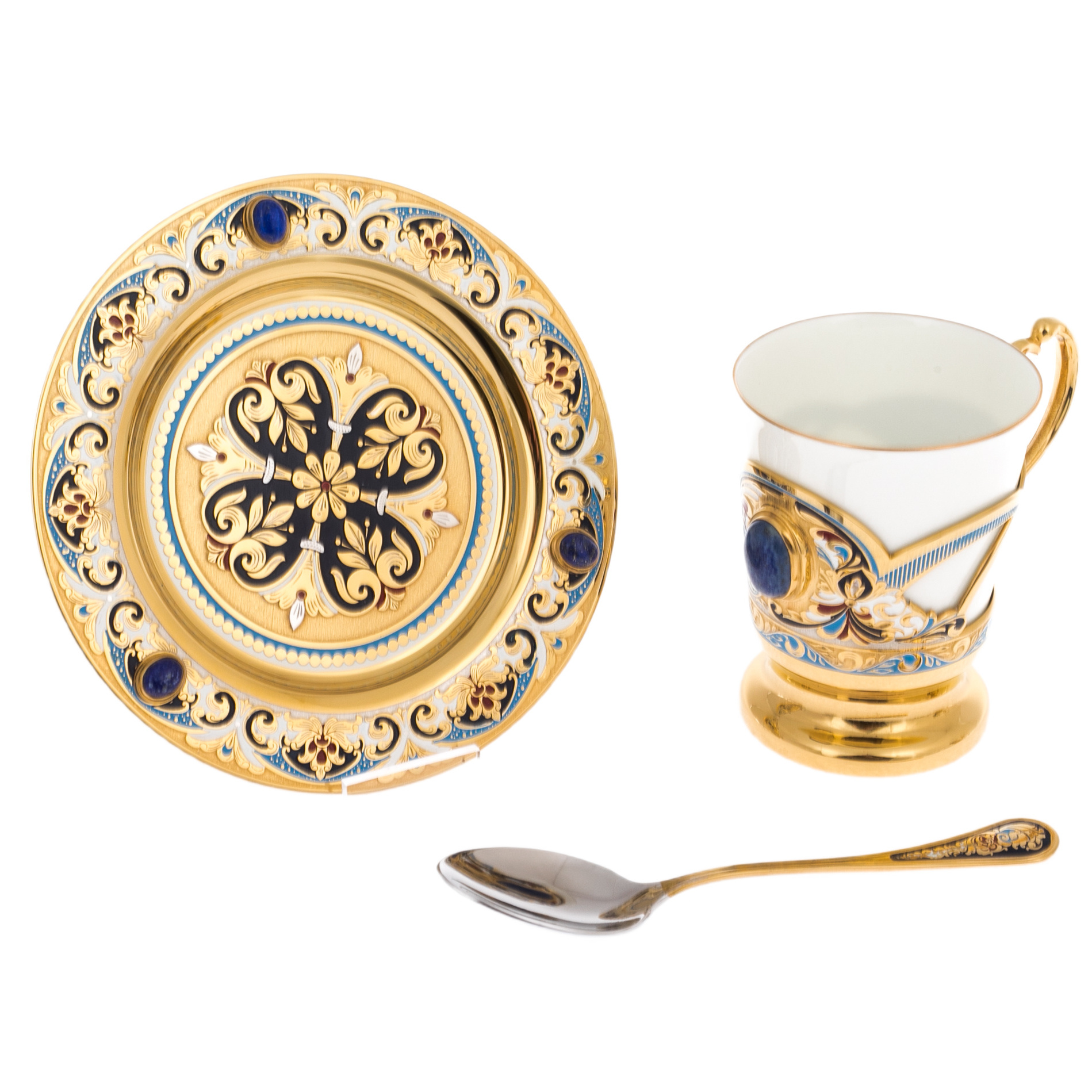 Чаши из тончайшего фарфора, обрамленные благородным металлом, поражают изысканным орнаментом, напоминающим сложные узоры древнерусских рукописей. Лазуритовые вставки, мерцающие таинственным блеском, символизируют мудрость и стойкость, будто приглашая владельца наслаждаться не только вкусом напитка, но и созерцанием великолепного дизайна. Ручка чаши, словно арка, соединяет удобство и изящество, подчеркивая уникальность каждой детали.
