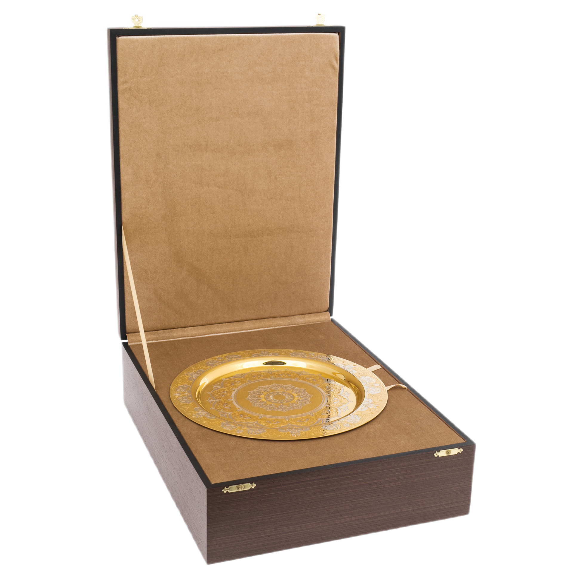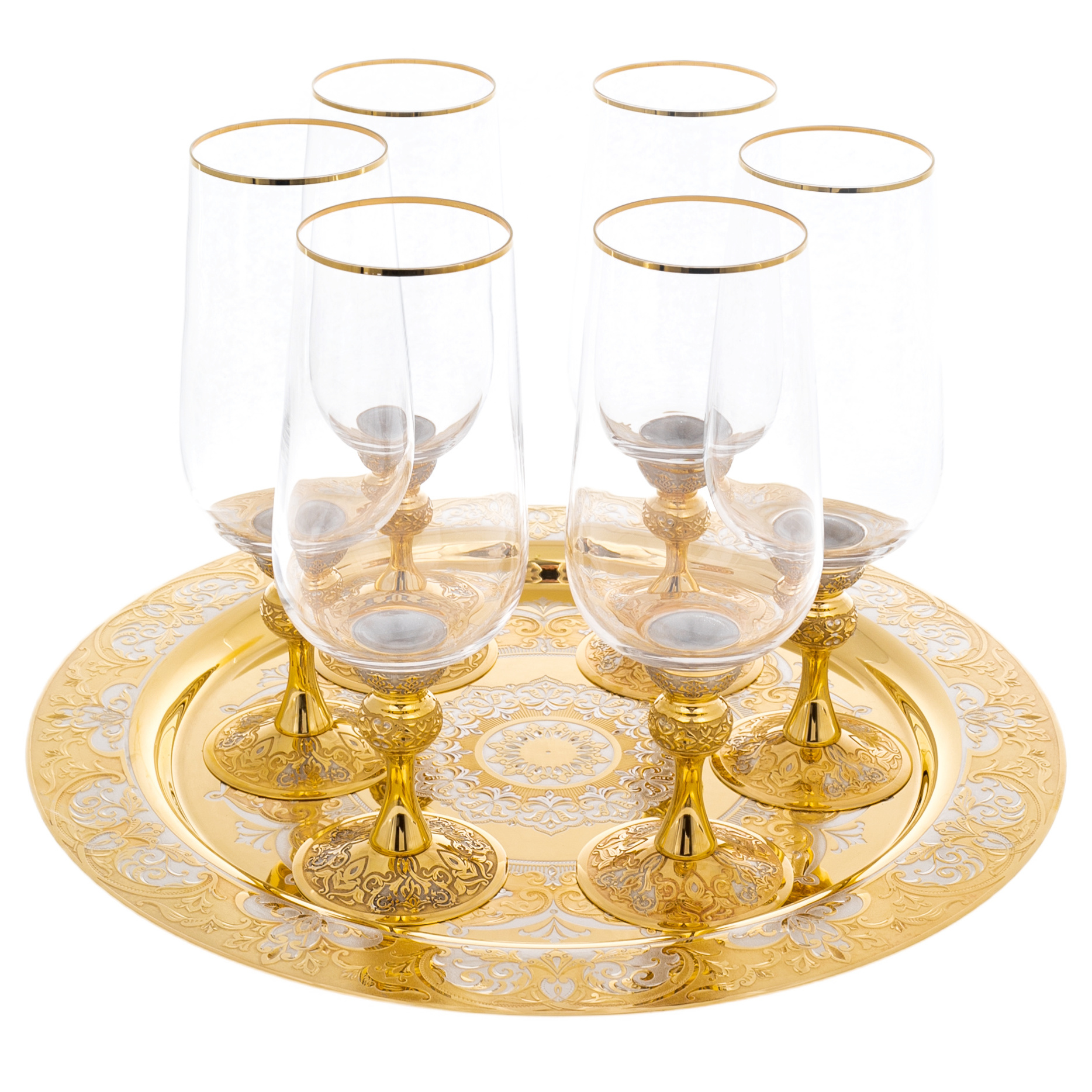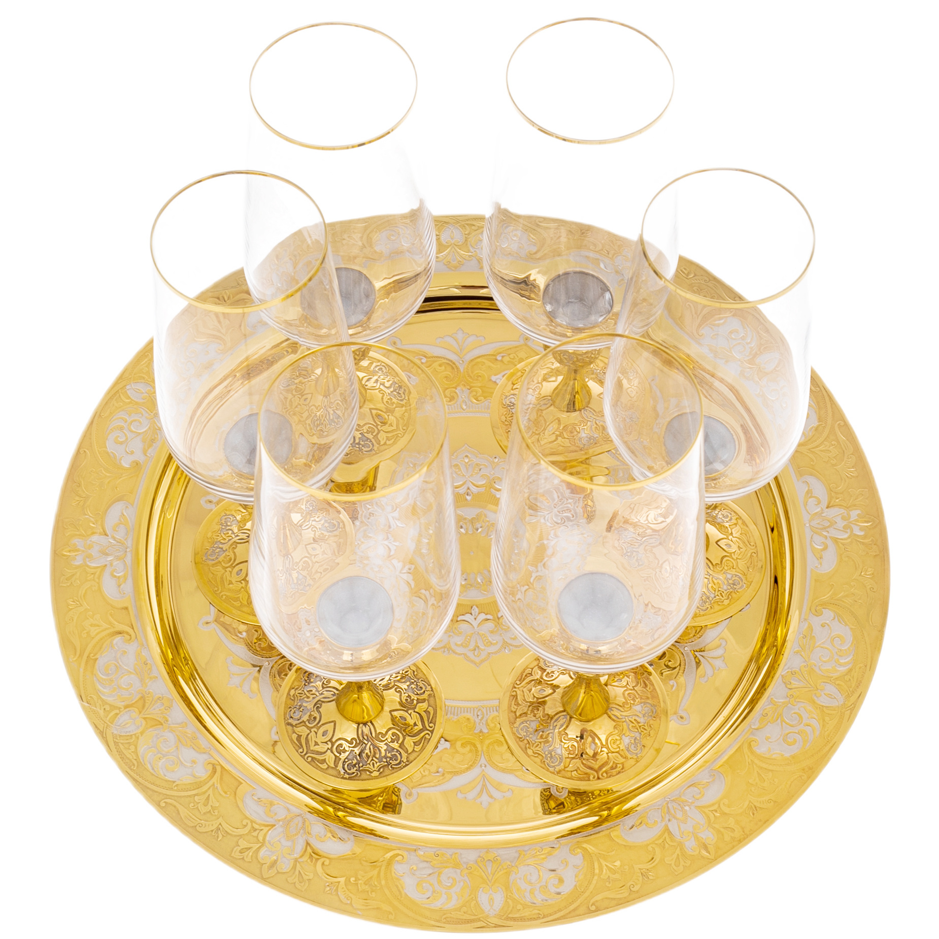 Набор для шампанского, выполненный в златоустовской технике, представляет собой изысканное сочетание функциональности и художественного мастерства, являясь настоящим украшением любого стола. Набор включает шесть бокалов и поднос, каждый элемент которого украшен утончённой гравировкой, выполненной вручную. Основной фон изделий покрыт золотым узором, переплетающимся с серебряными и изумрудными оттенками, придающими набору особую глубину и благородство. Золотистые и серебряные элементы, используемые в росписи, делают набор ещё более привлекательным. Каждый элемент набора, будь то изящный узор на бокалах или утончённые детали подноса, выполнен с безупречным вниманием к деталям, демонстрируя высочайший уровень мастерства.