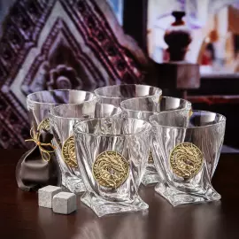 Набор для виски "Герб СССР" на 4 персоны Набор для виски "Герб СССР" на 4 персоны Набор для виски «Герб СССР» на 4 персоны — это возвращение к символам эпохи, в которой каждая деталь наполнена историей. Внутри стильной подарочной упаковки на атласном ложе разместились четыре стакана, украшенных золотыми рельефами герба СССР. Каждый бокал — это произведение искусства, где золотые элементы обвивают стекло, изображая знаменитый герб с серпом и молотом, венчанный звездой. Этот символ олицетворяет мощь и единство, идеалы труда и прогресса, охраняемые временем. Стаканы выполнены из прочного хрусталя с глубокой гранью, придающей им не только прочность, но и особую элегантность. Эмаль в золотых вставках подчёркивает не только внешний вид, но и передаёт глубокую связь с культурным и политическим наследием страны. Хрусталь, наряду с эмалью, создаёт эффект вечности и ценности, при этом каждый стакан и его элемент украшения — это свидетельство мастерства и тщательной проработки деталей. Этот набор идеально подойдёт в качестве подарка для деловых партнёров, коллекционеров или для значимых мероприятий. Он является достойным украшением любого кабинета или коллекции, а также прекрасным воспоминанием о великом историческом наследии.