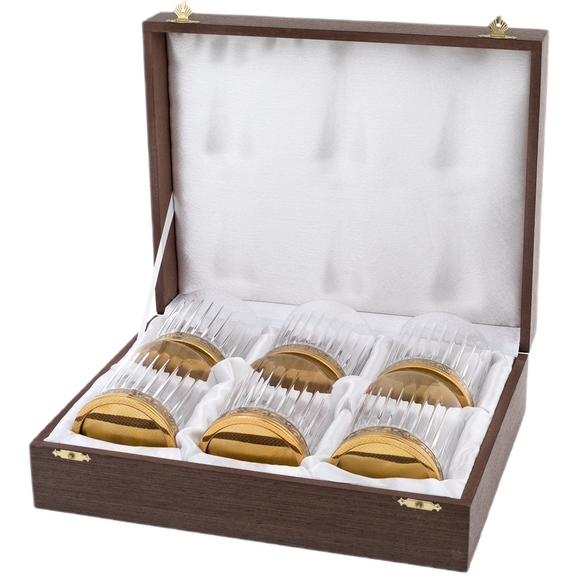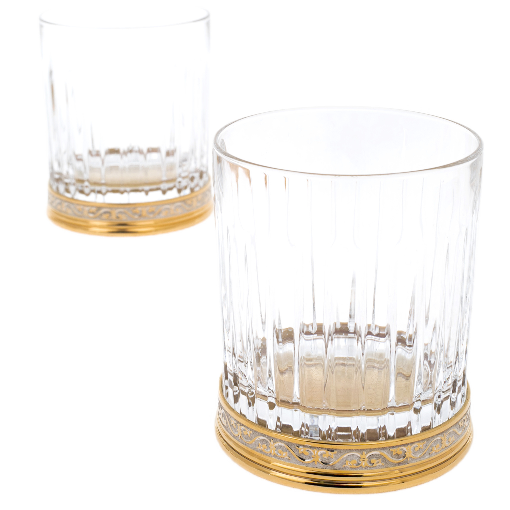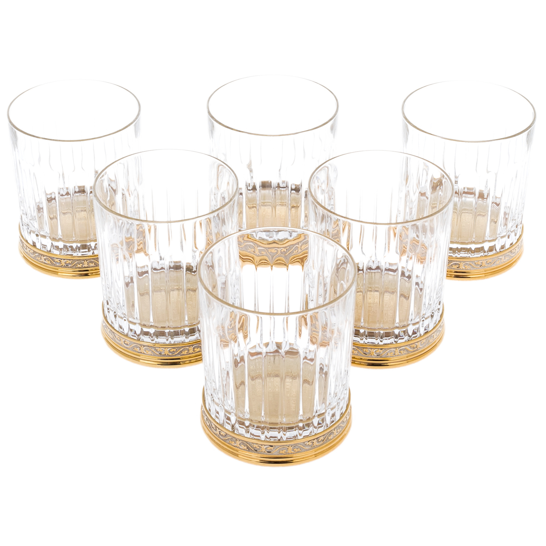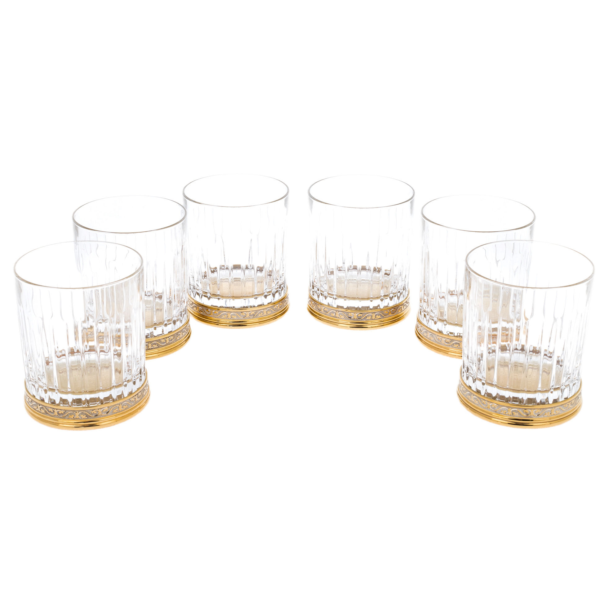 Набор для виски «Вискарный» на 6 персон — воплощение традиций златоустовского мастерства и утончённой роскоши. Каждый стакан выполнен из прозрачного хрусталя с чёткой вертикальной гранью, что усиливает игру света в напитке и придаёт бокалам выразительную глубину. Основание каждого изделия украшено латунным окладом с золотым покрытием и филигранной гравировкой — тончайший орнамент, который подчеркивает благородство формы.