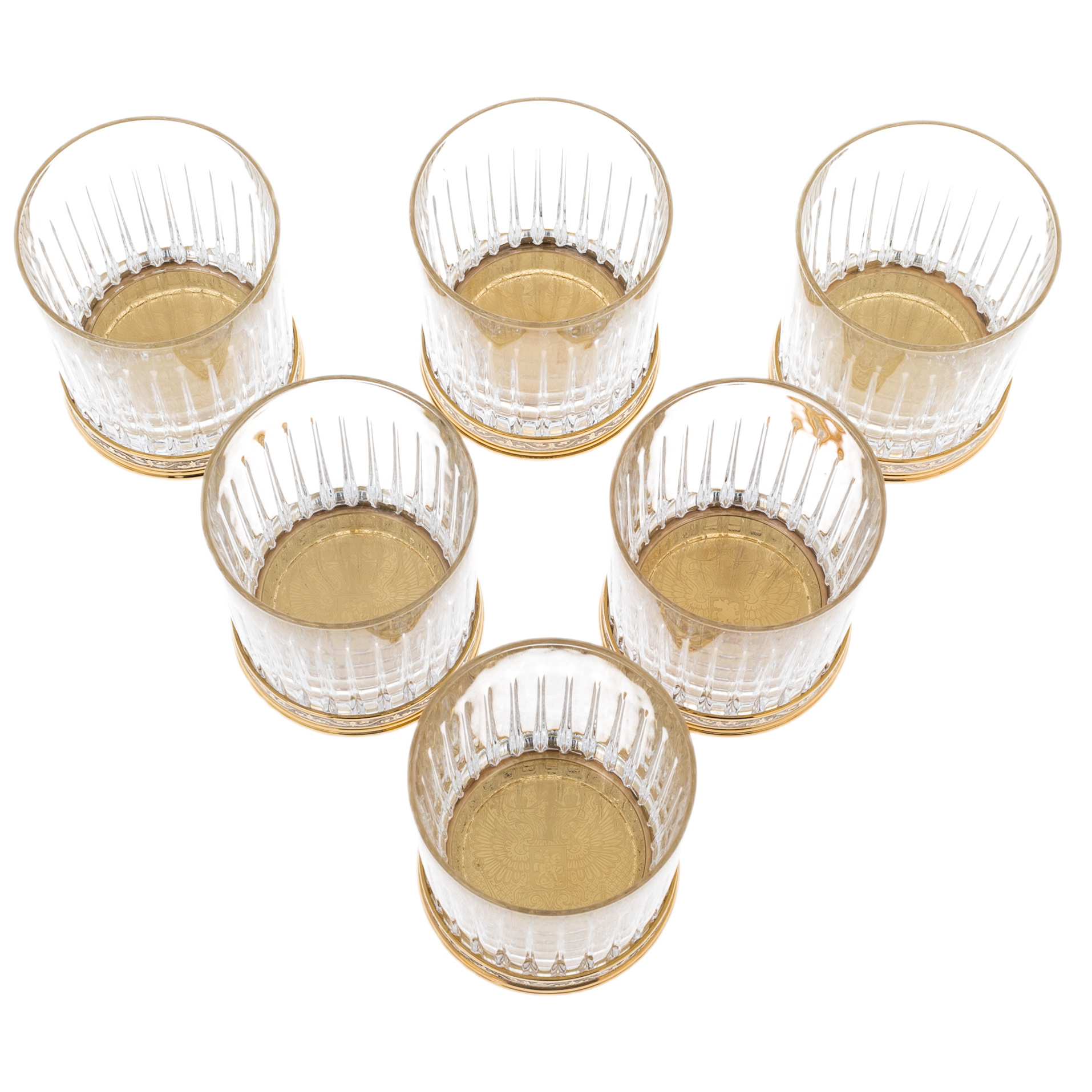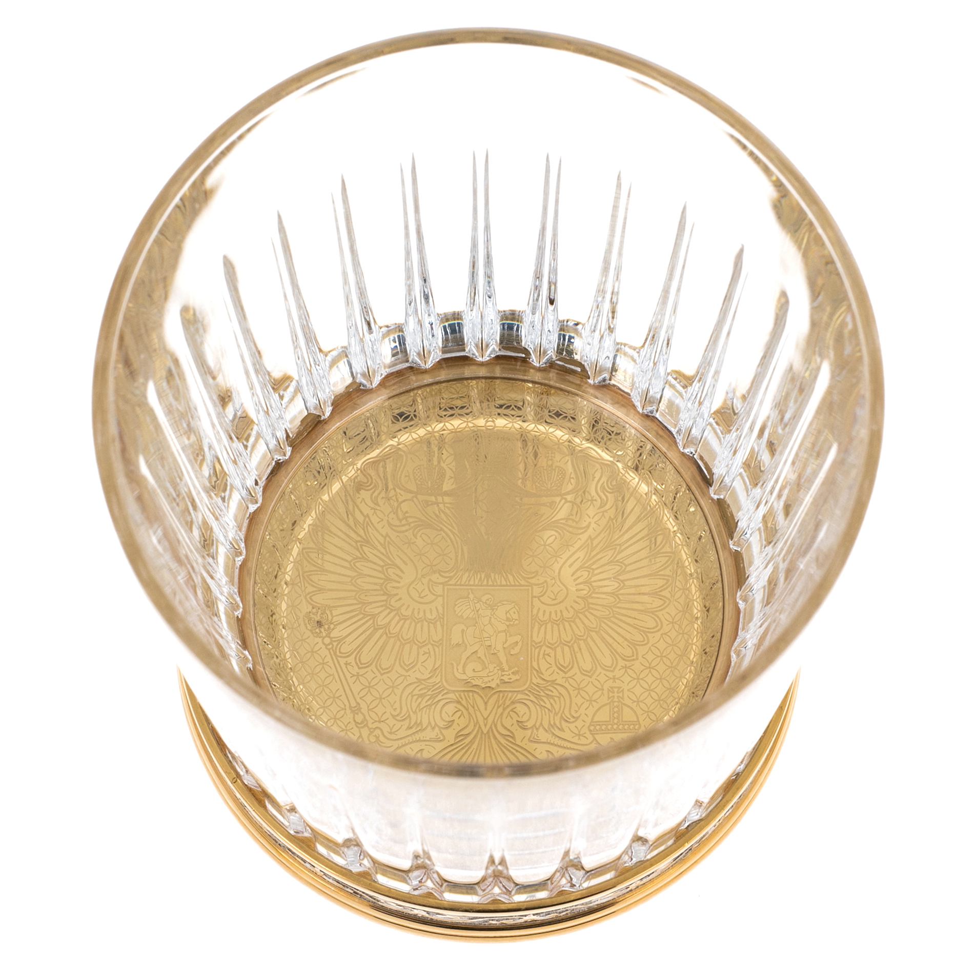 Особое внимание привлекает дно бокалов: под прозрачной толщей стекла проступает рельефный герб России, исполненный с ювелирной точностью. Этот символ величия придаёт сервировке особый статус — напиток словно венчается знаком государственной силы и достоинства.