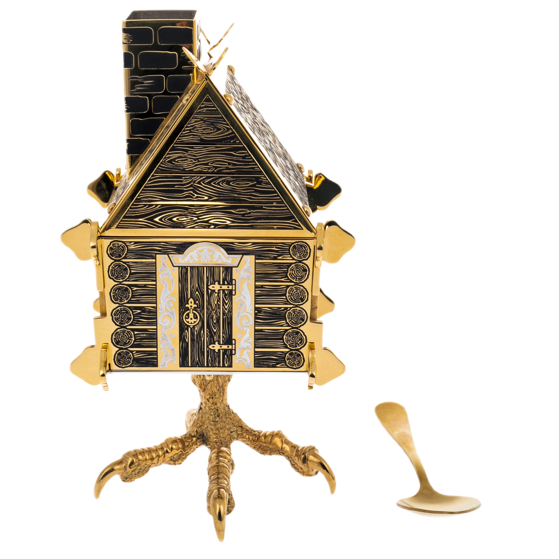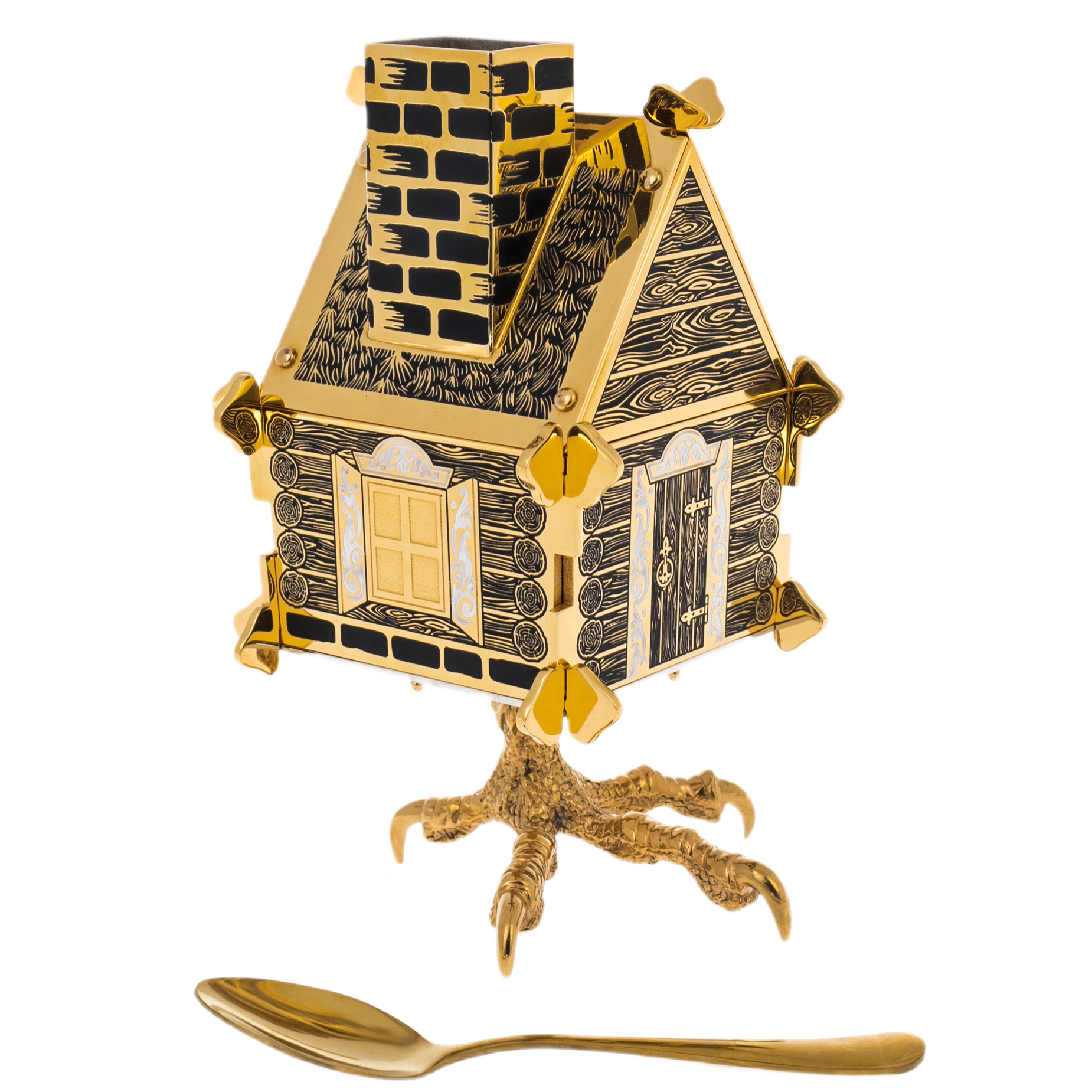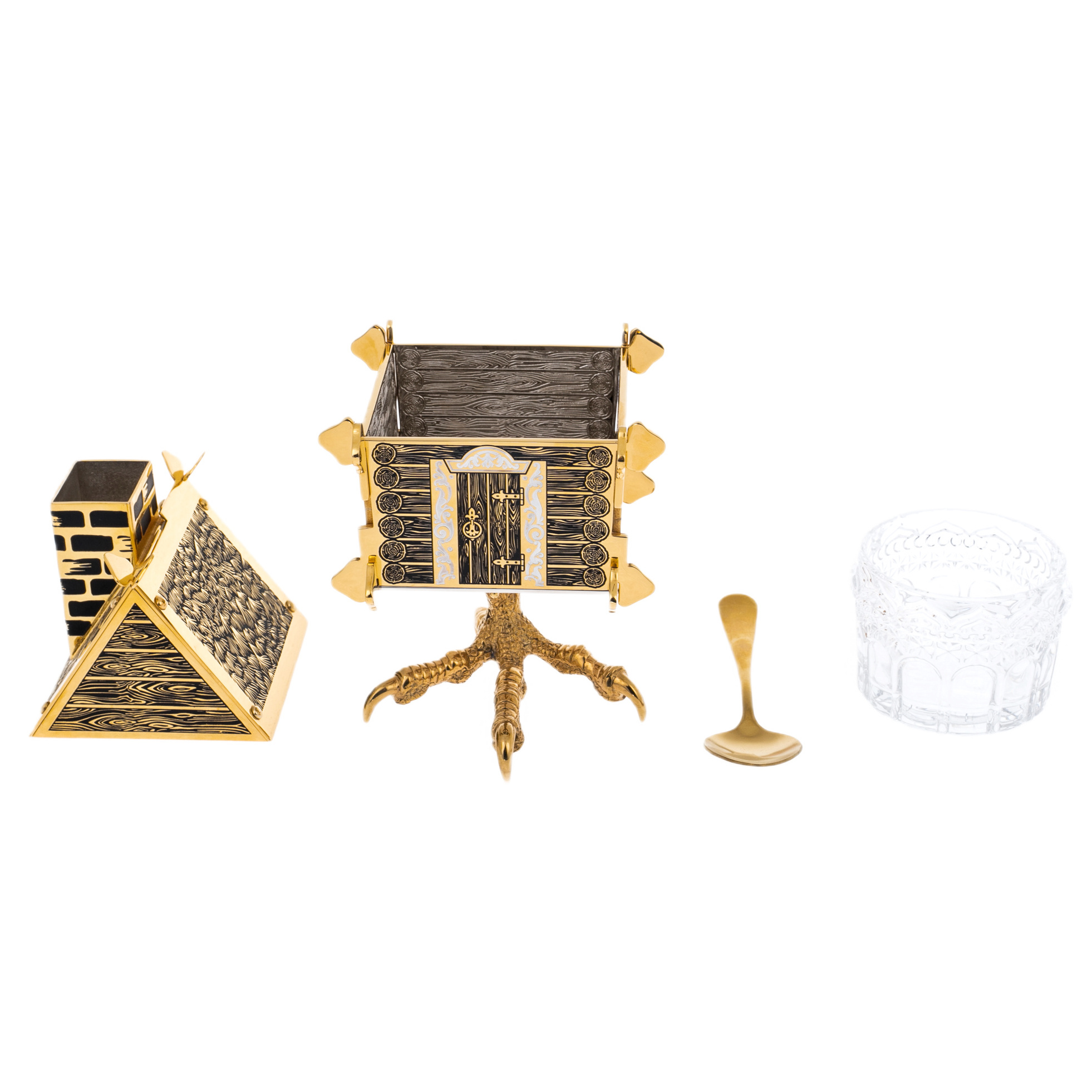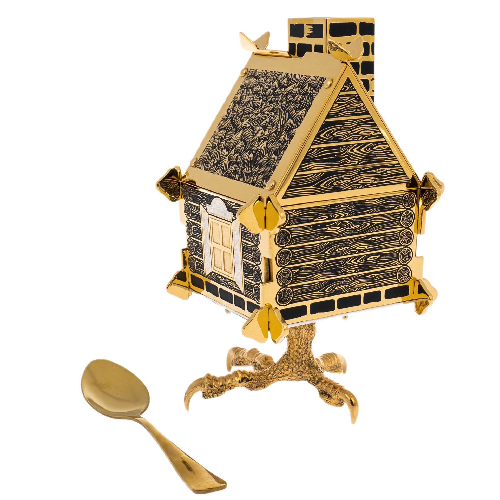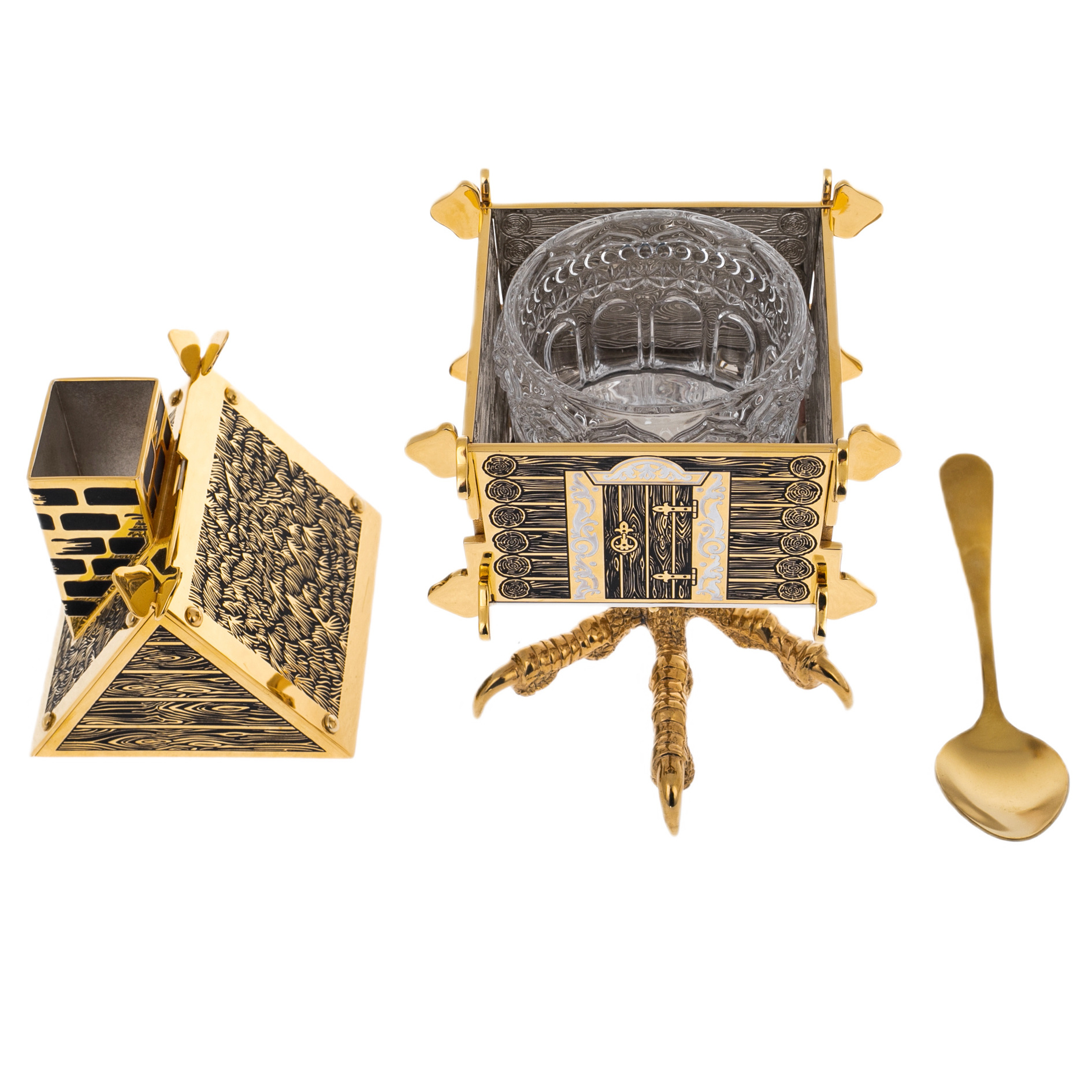 Корпус сахарницы стилизован под деревянный сруб с резными наличниками и дверью, а основание выполнено в виде куриных лап — того самого волшебного основания, на котором стояла избушка Бабы-Яги. Внутри помещается стеклянная вставка, дополняемая миниатюрной ложкой из металла с золотым покрытием.
