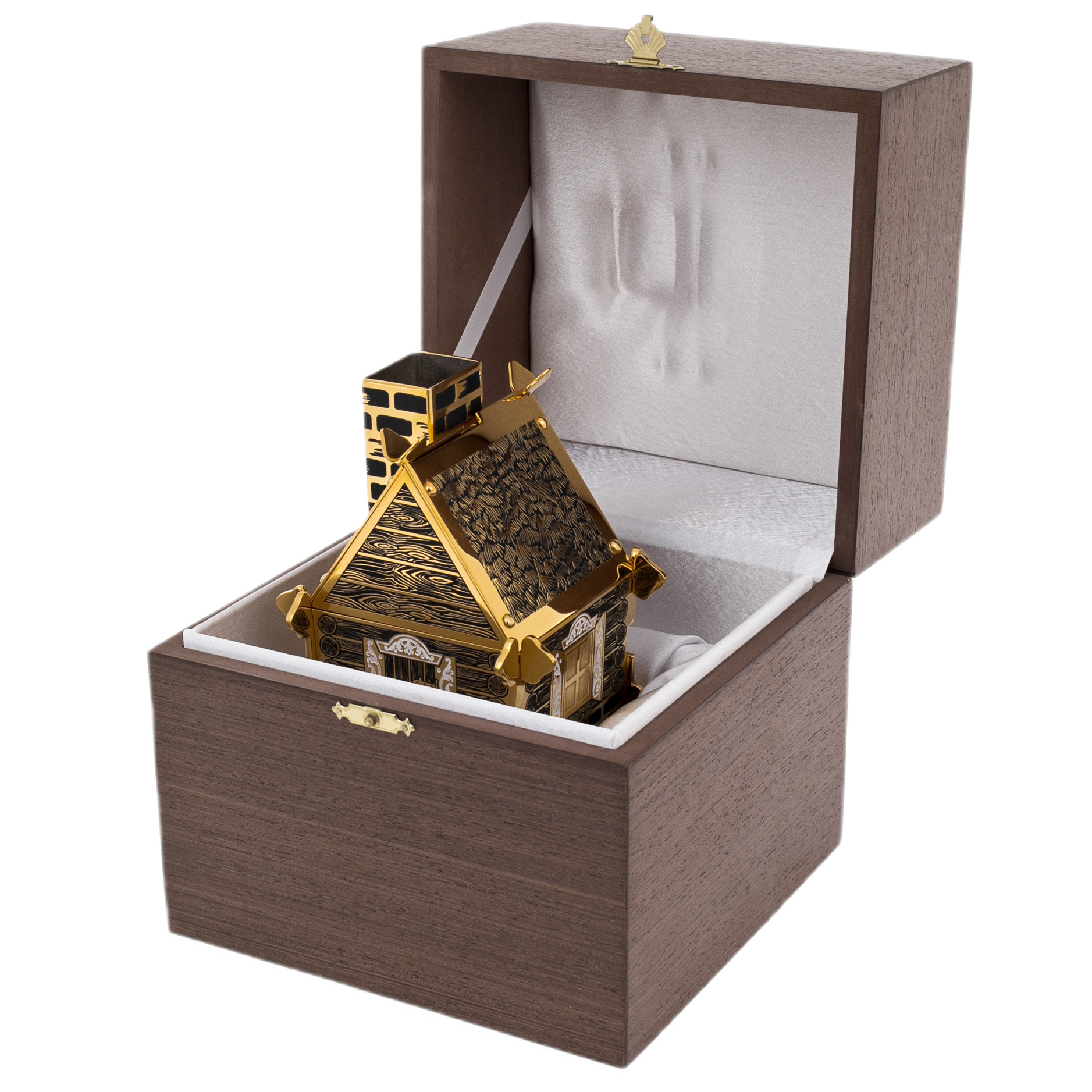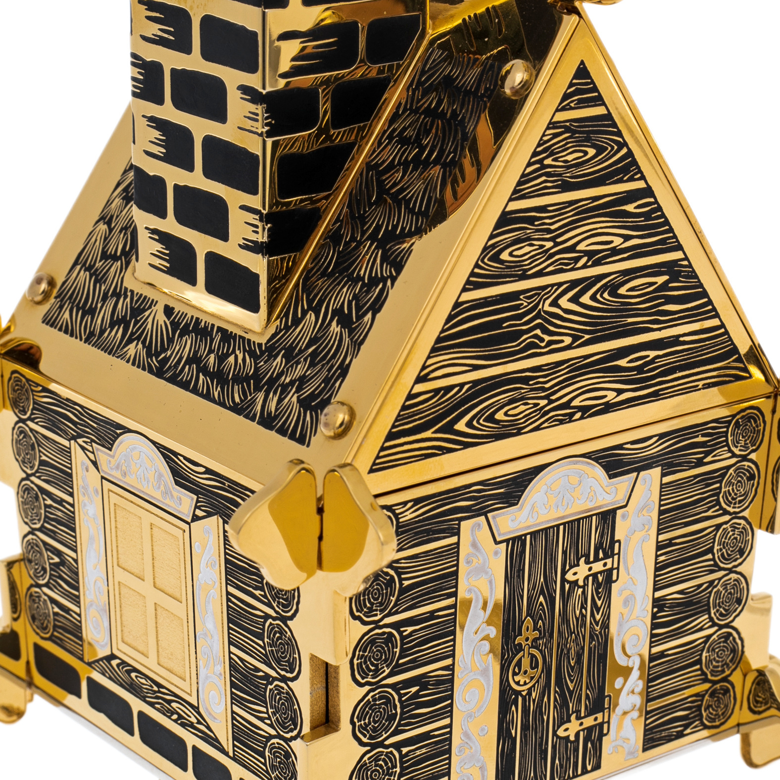 Сахарница «Избушка на курьих ножках» — одна из самых оригинальных работ Златоуста, где древнеславянская сказка встречается с искусством ювелирной гравюры. Изделие выполнено из латуни с золочением и никелированием, украшено филигранной гравировкой в лучших традициях златоустовского мастерства.