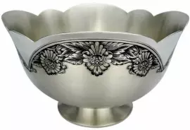 Северная чернь Ваза-салатница из серебра "Цветок" Ваза-салатница из серебра "Цветок" Ваза из серебра 925 пробы изготовлена мастерами великоустюгского завода «Северная чернь». Сплавы, содержащиеся в пробе, придают изделию прочность и защиту от механических повреждений. Великоустюгский завод «Северная чернь» – уникальное предприятие народного художественного промысла, сложившегося в городе Великий Устюг в ХVII веке, сохраняющее и развивающее трехсотлетние традиции древнерусского искусства чернения по серебру, не имеющего аналогов в современном ювелирном искусстве. Все изделия производятся традиционным для народного художественного промысла ручным способом, с соблюдением в технологии основных приемов старинных мастеров. Классический стиль и особенный шарм изделий - создадут неповторимую атмосферу для гостей, которые захотят возвращаться к Вам снова и снова. Приобретение изделий, выполненных в технике "северной черни" позволяет эффективно вложить средства, которые со временем будут приумножать за счет роста стоимости эксклюзивных высокохудожественных объектов.  Для того чтобы изделие стало по настоящему персональным, вы можете воспользоваться услугой гравировки и нанесения вензелей, логотипа или любого другого рисунка по вашему эскизу или подробному описанию, различными технологиями (ручная гравировка штихелем, золочение, оксидирование и чернение) для достижения разных художественных эффектов.