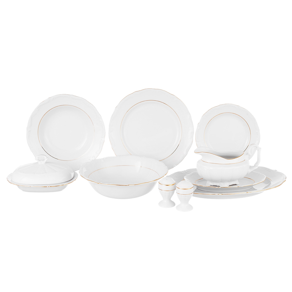 Состав набора:Тарелки суповые 22,5 см 6 шт, тарелки подстановочные 25 см 6 шт, тарелки пирожковые 19 см 6 шт, блюдо овальное 33 см 1 шт, блюдо овальное 22 см 1 шт, салатник 23 см 1 шт. масленка 0,25 л, соусник 0,5 л, солонка 1 шт, перечница 1 шт.