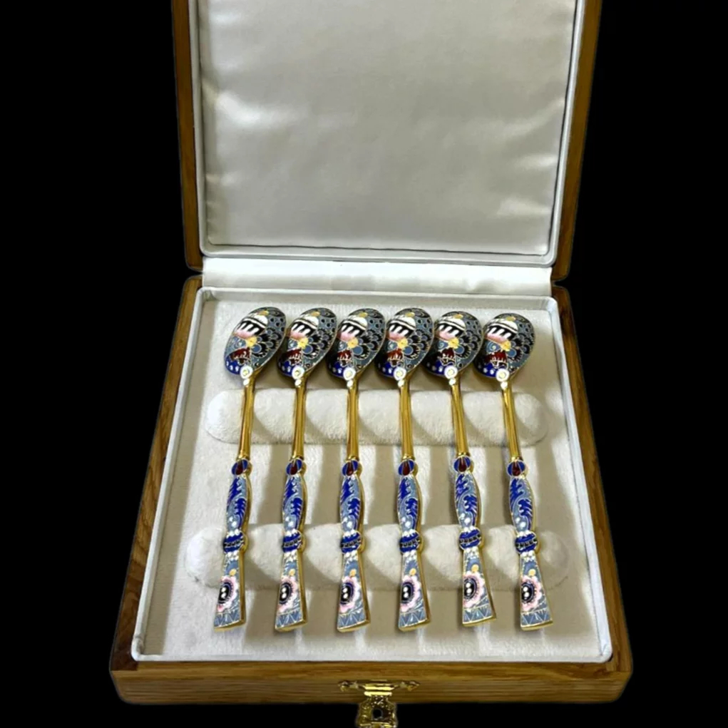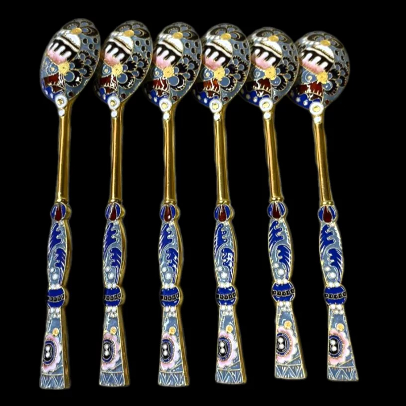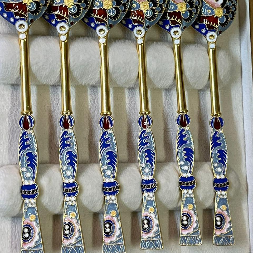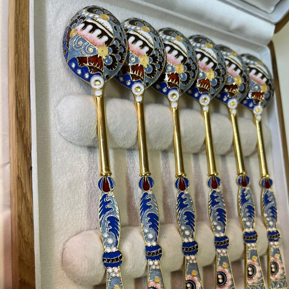 Набор ложек из серебра на 6 персон, с эмалью и позолотой