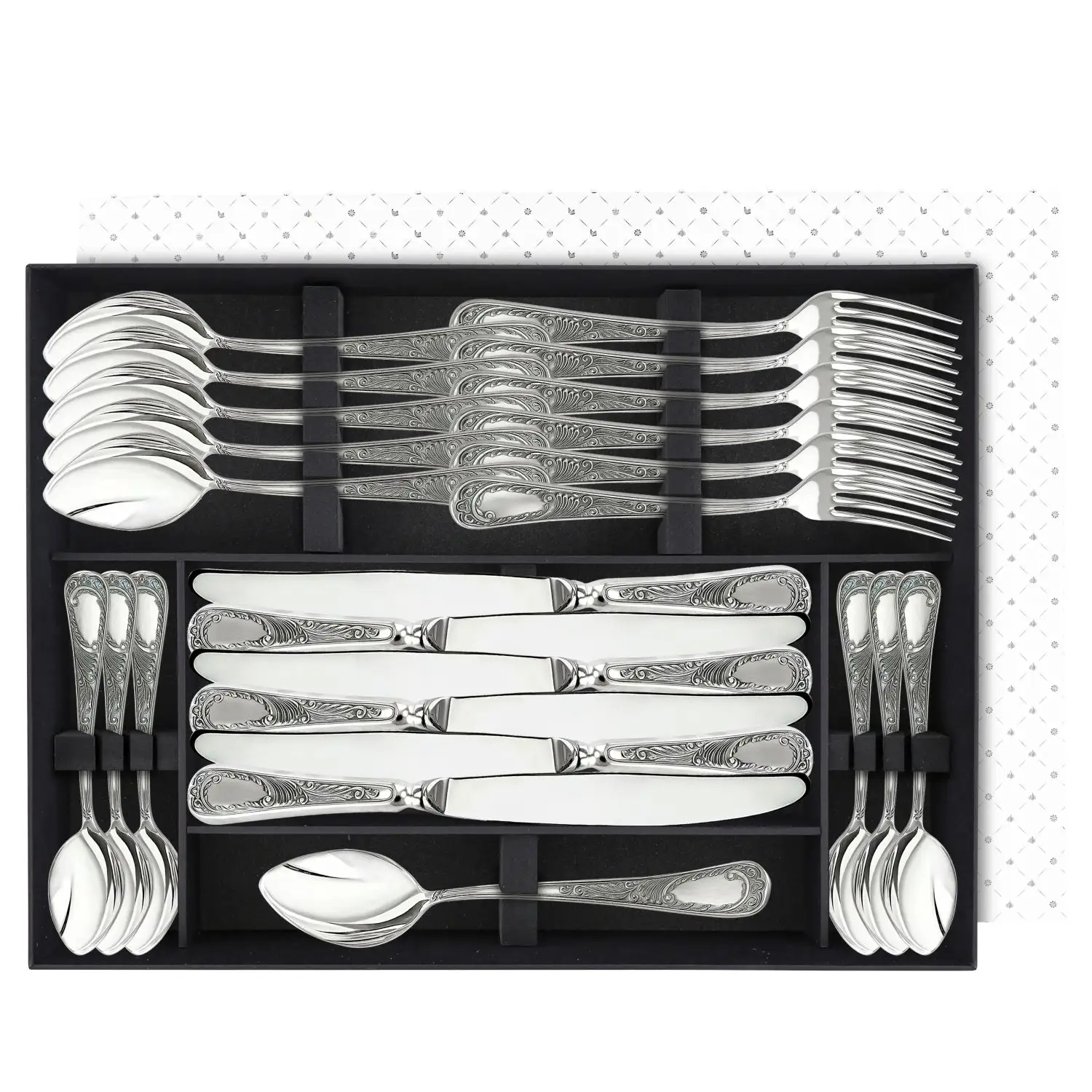 Комплектация:ложка столовая - 6шт., нож столовый - 6шт., вилка столовая - 6шт., ложка чайная - 6шт., футляр.