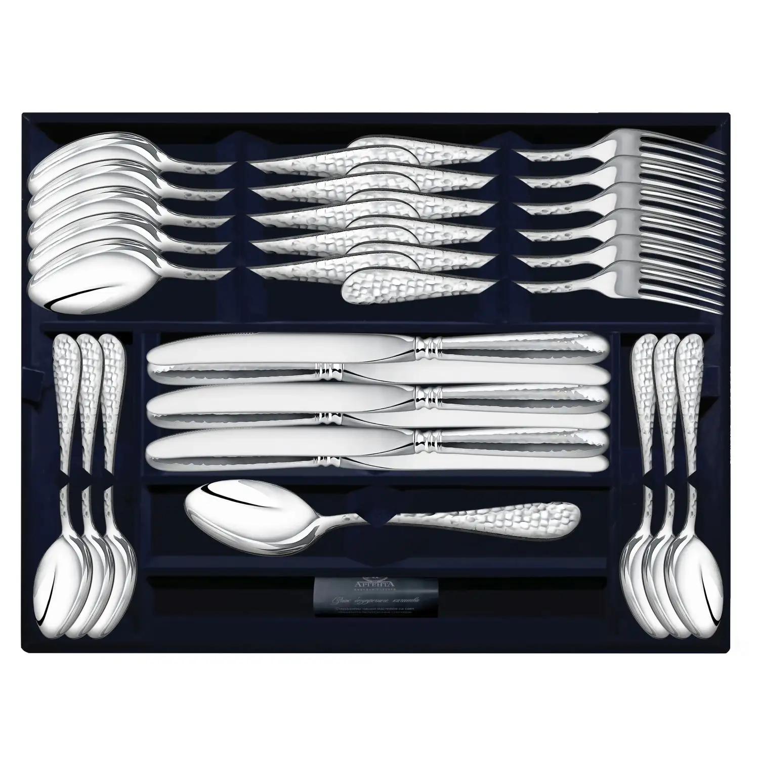 Состав набора:ложка столовая - 6шт., нож столовый - 6шт., вилка столовая - 6шт., ложка чайная - 6шт., футляр.