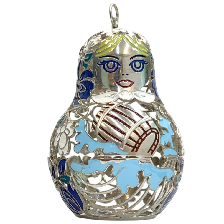 Елочная игрушка-матрешка разборная "Бочка" из серебра