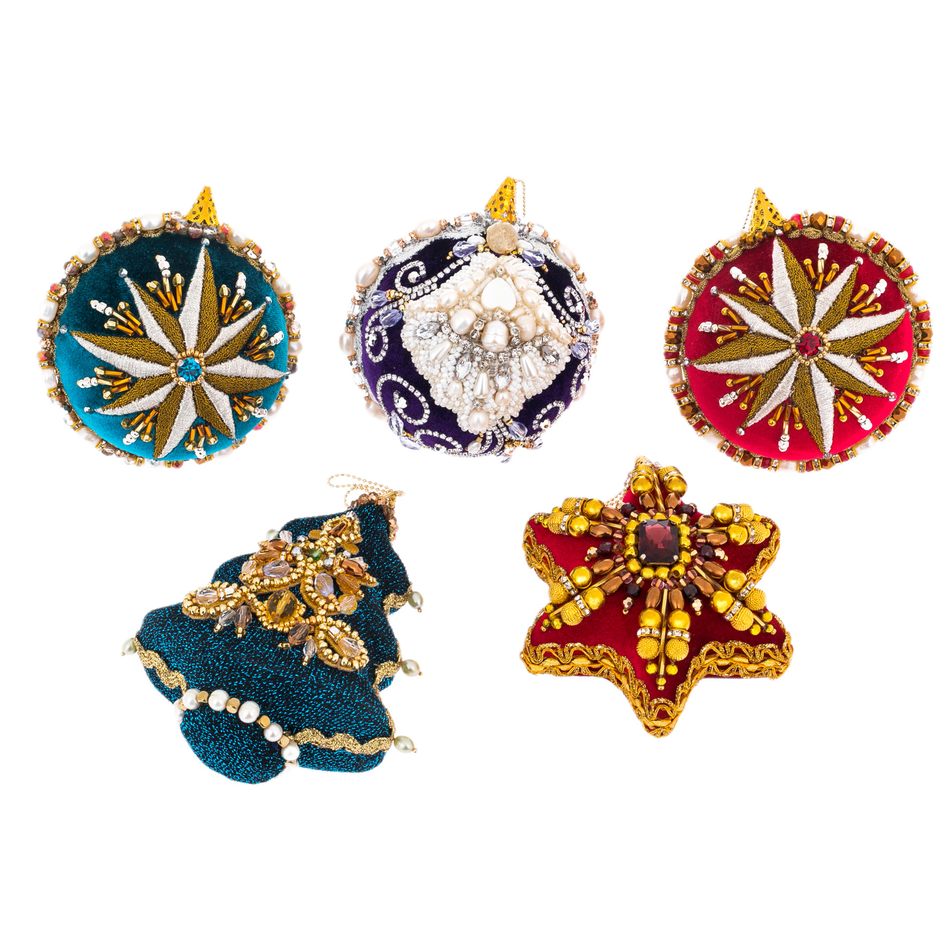 Изделия в форме звезды и елки привносят в композицию нотки символизма — звезда, сияющая как полярное светило, и елка, олицетворяющая возрождение и жизнь, продолжают традиции, заложенные веками. Их детали, инкрустированные кристаллами и бисером, завораживают изяществом, напоминая о блеске ювелирных украшений, доступных лишь избранным.